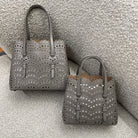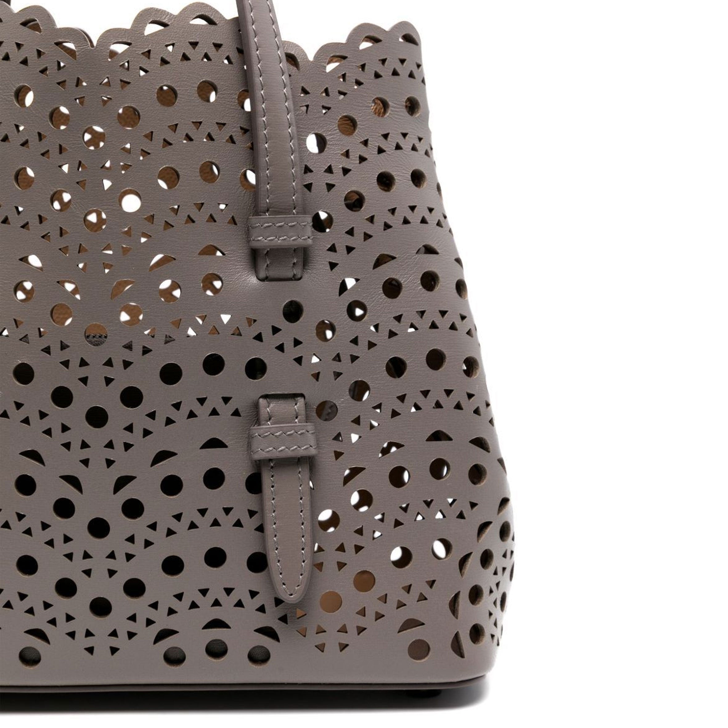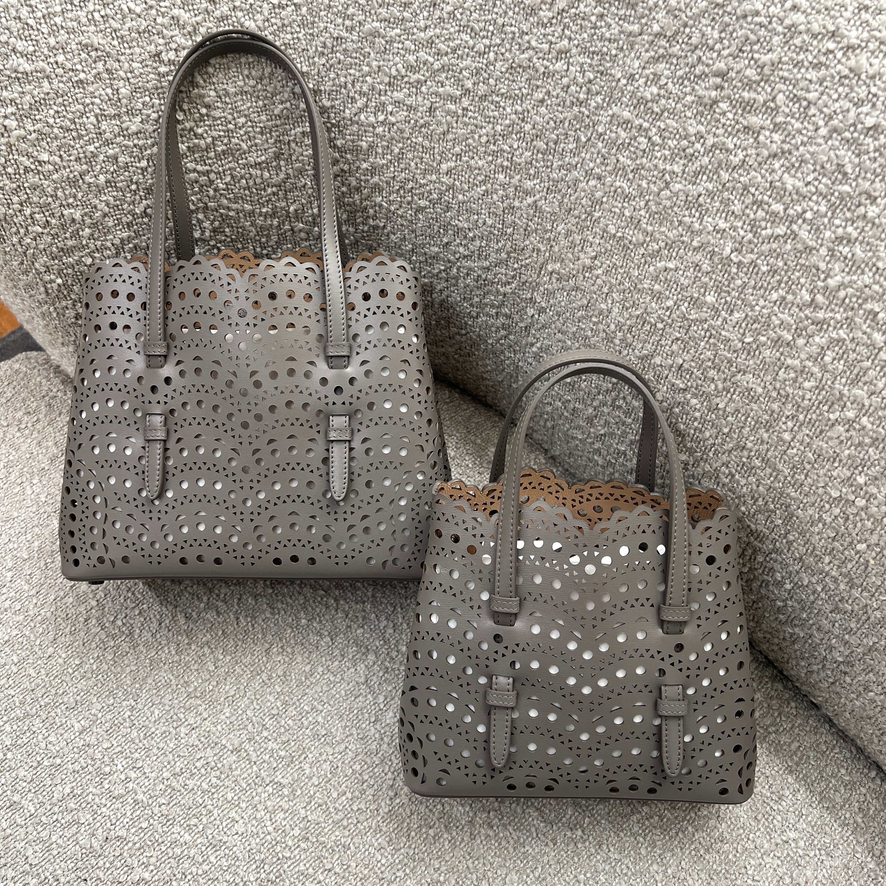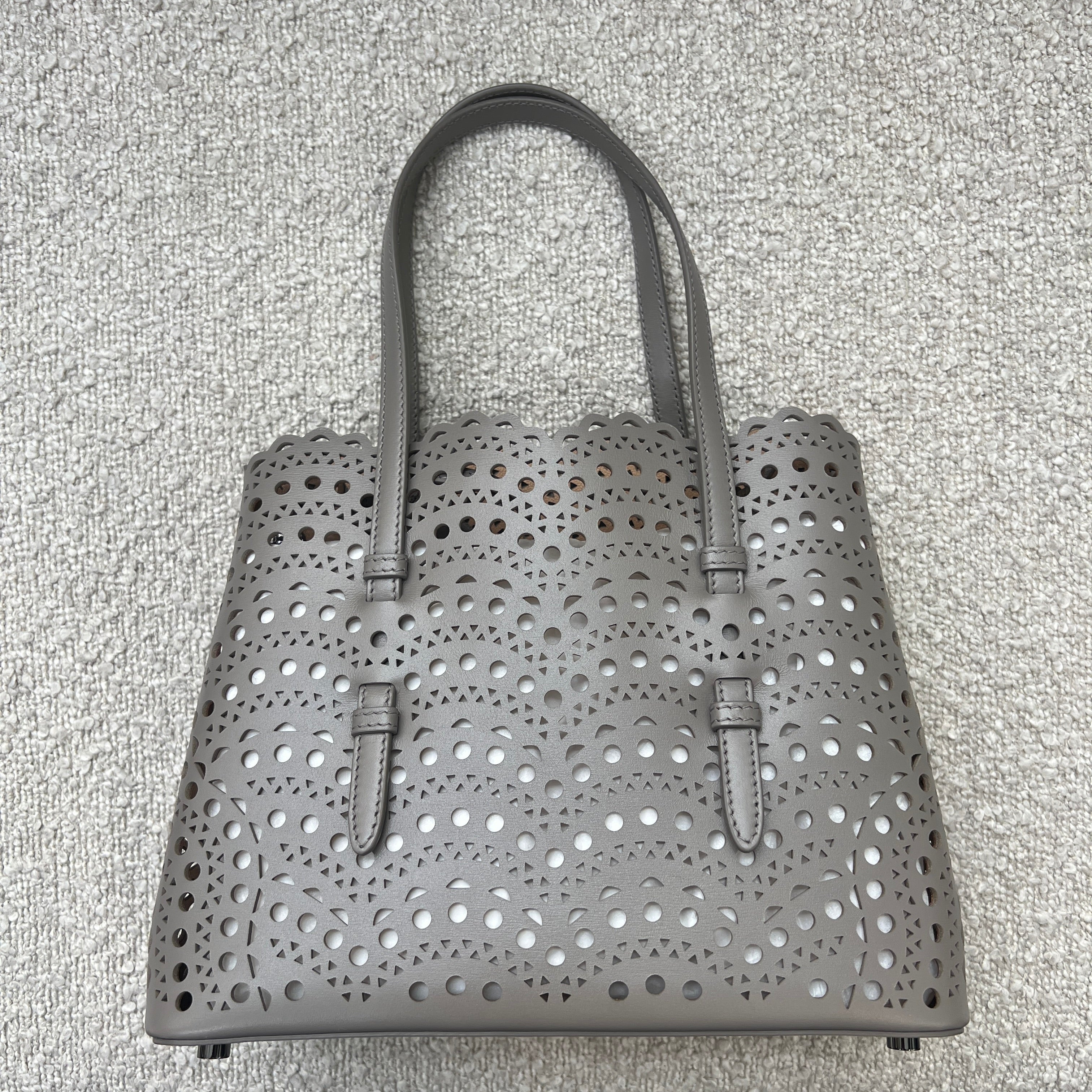 Discover the Alaia Small Tote Bag in Wave Pattern – a blend of lace-inspired beauty and architectural elegance. Its snap-fastening gusseted sides expand, and it comes with a leather pouch, detachable strap, and galvanized silver hardware. Effortlessly chic for hand or shoulder carry.