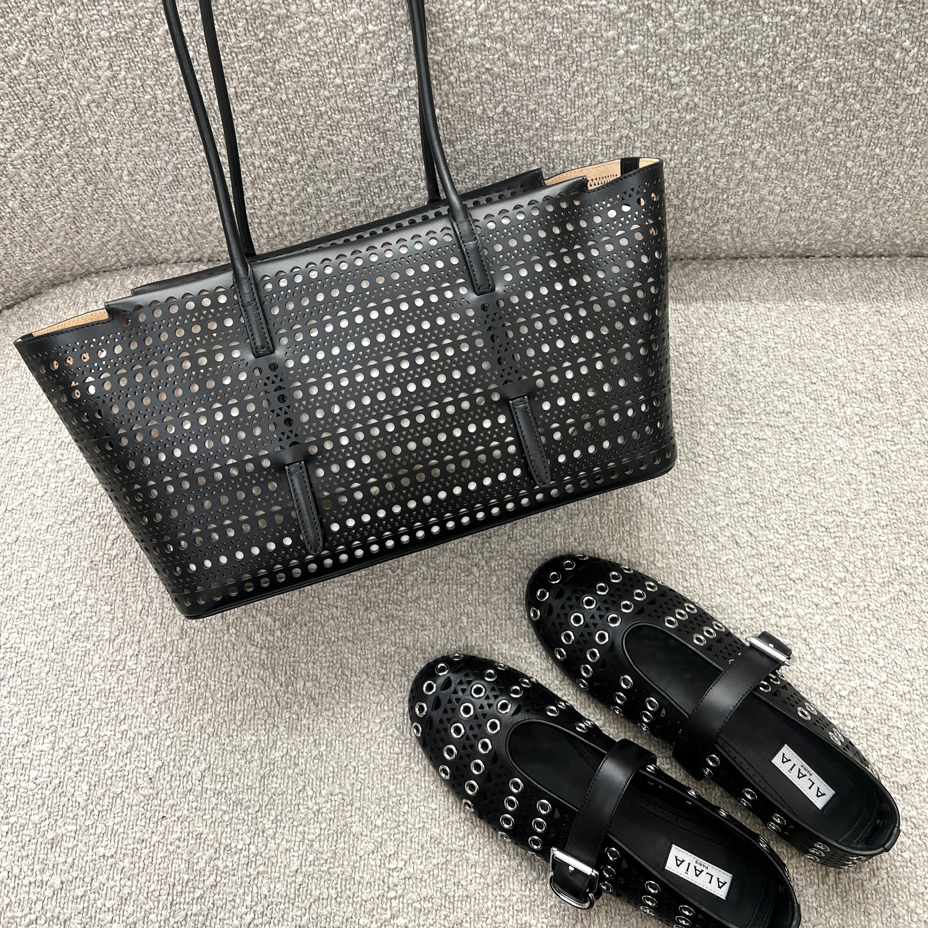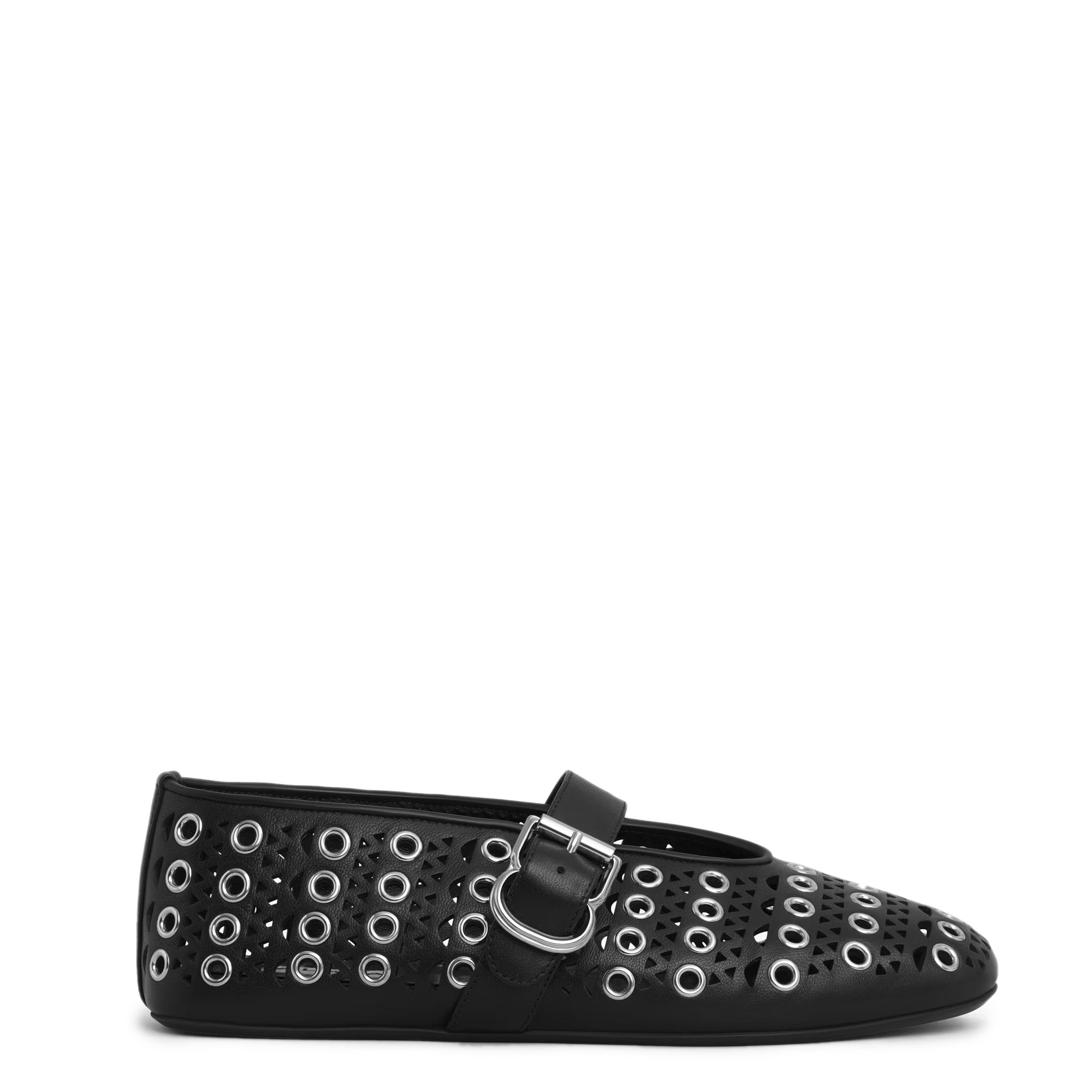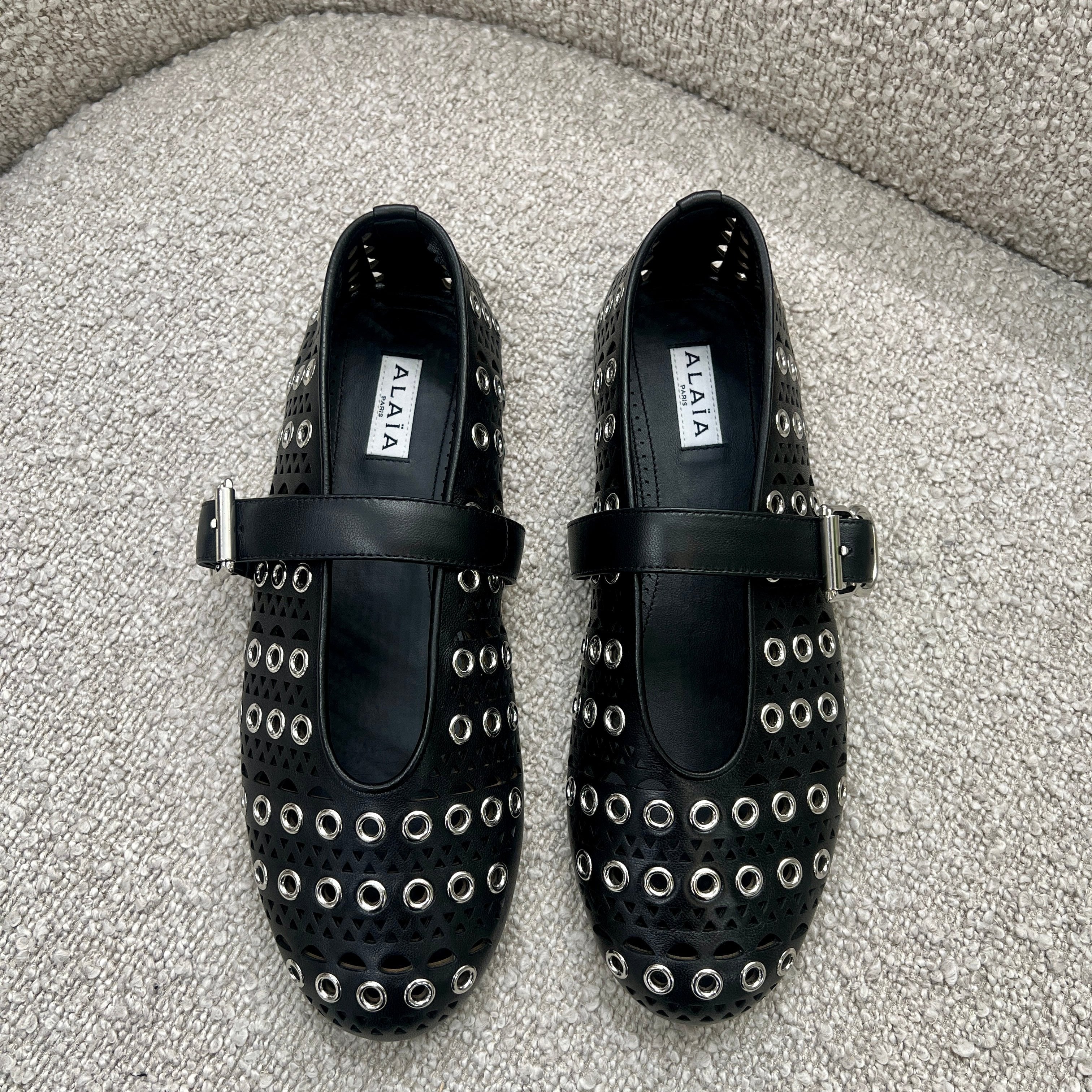 Step into luxury with Alaïa's Ballet Flats inspired by classical Japanese shoes. Lambskin leather perforated with the iconic "Vienne" motif and enhanced by metallic eyelets. Featuring a rubber sole, they provide both comfort and durability, making them a perfect choice for any occasion. Elevate your footwear collection with these exquisite ballet flats from Alaïa.