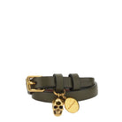 Black leather double wrap bracelet with gold detail skull charm and Alexander McQueen embossed coin.