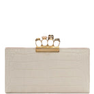 Alexander McQueen croc embossed calf leather Knuckle Flat clutch. Gold-tone skull clasp set with Swarovski crystals. Main interior compartment features two generous zip pockets and is lined in blush suede.