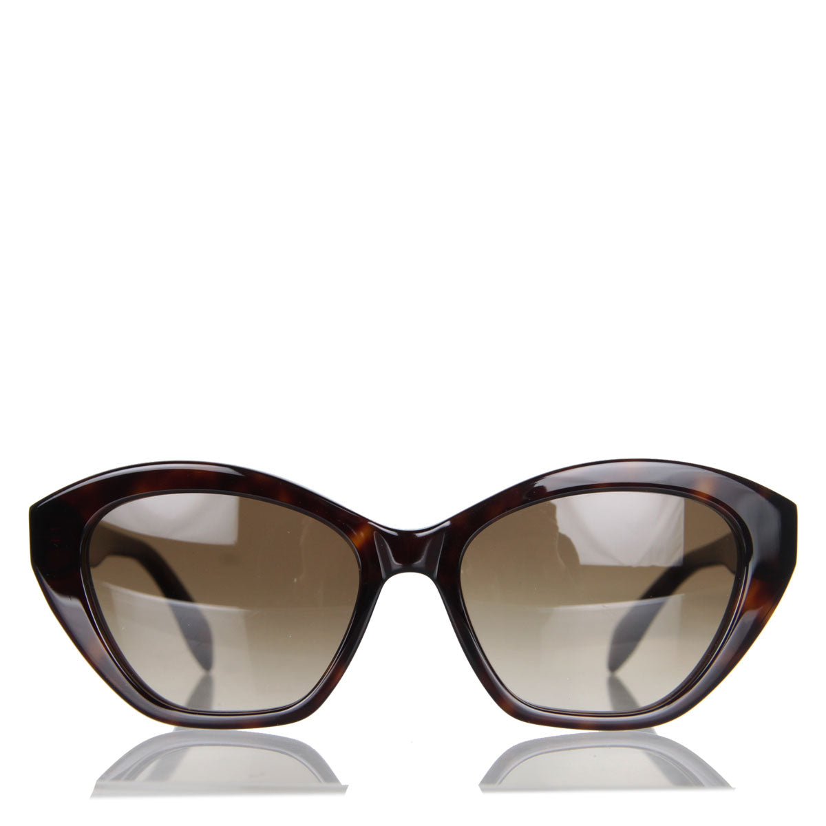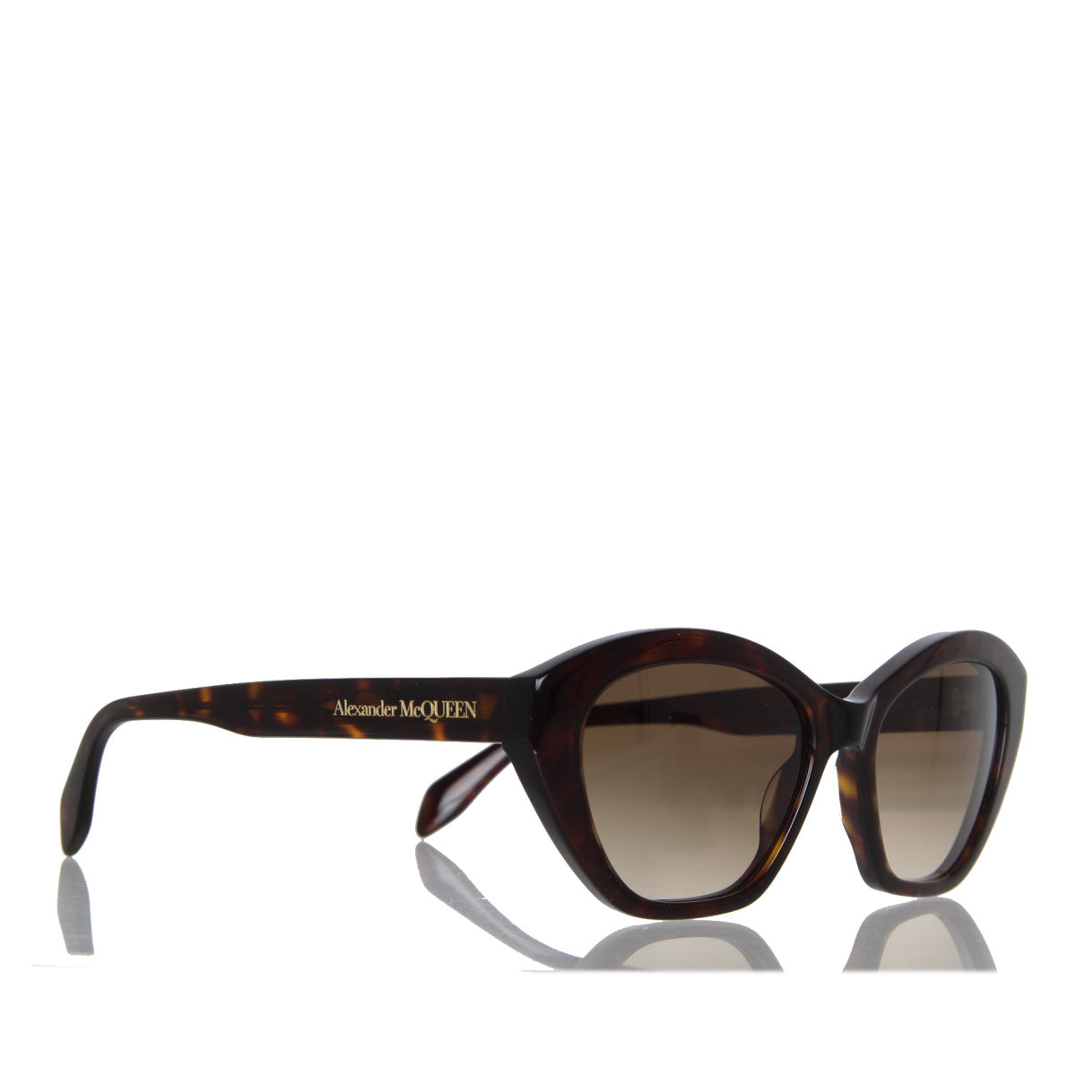 Shiny havana acetate cat eye sunglasses with brown lenses. The sunglasses have bold acetate temples with a lasered Alexander McQueen signature.