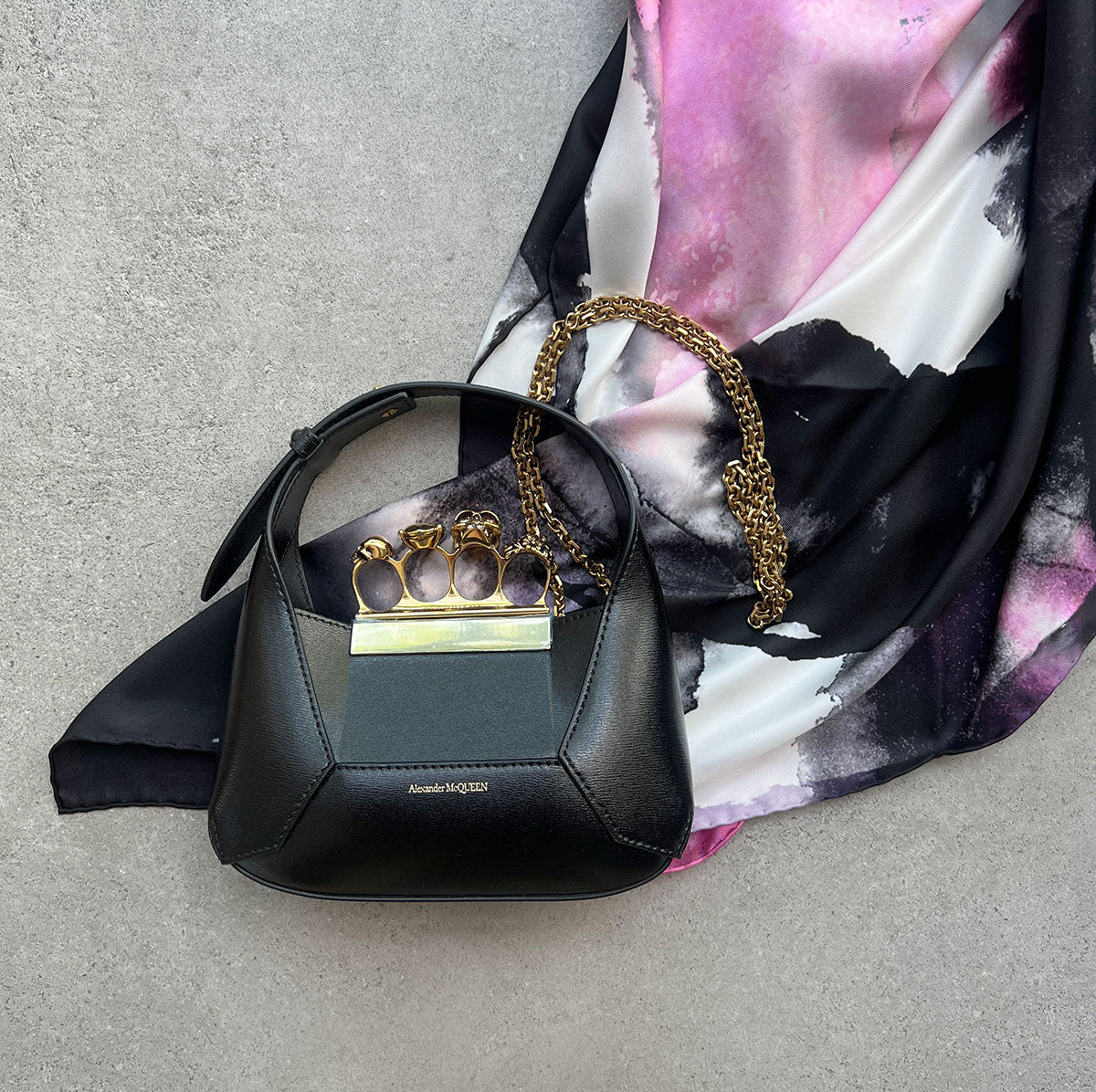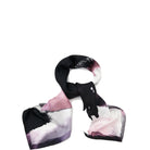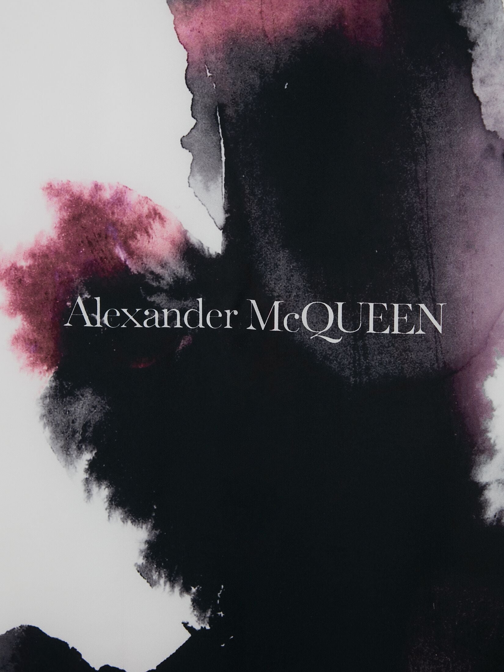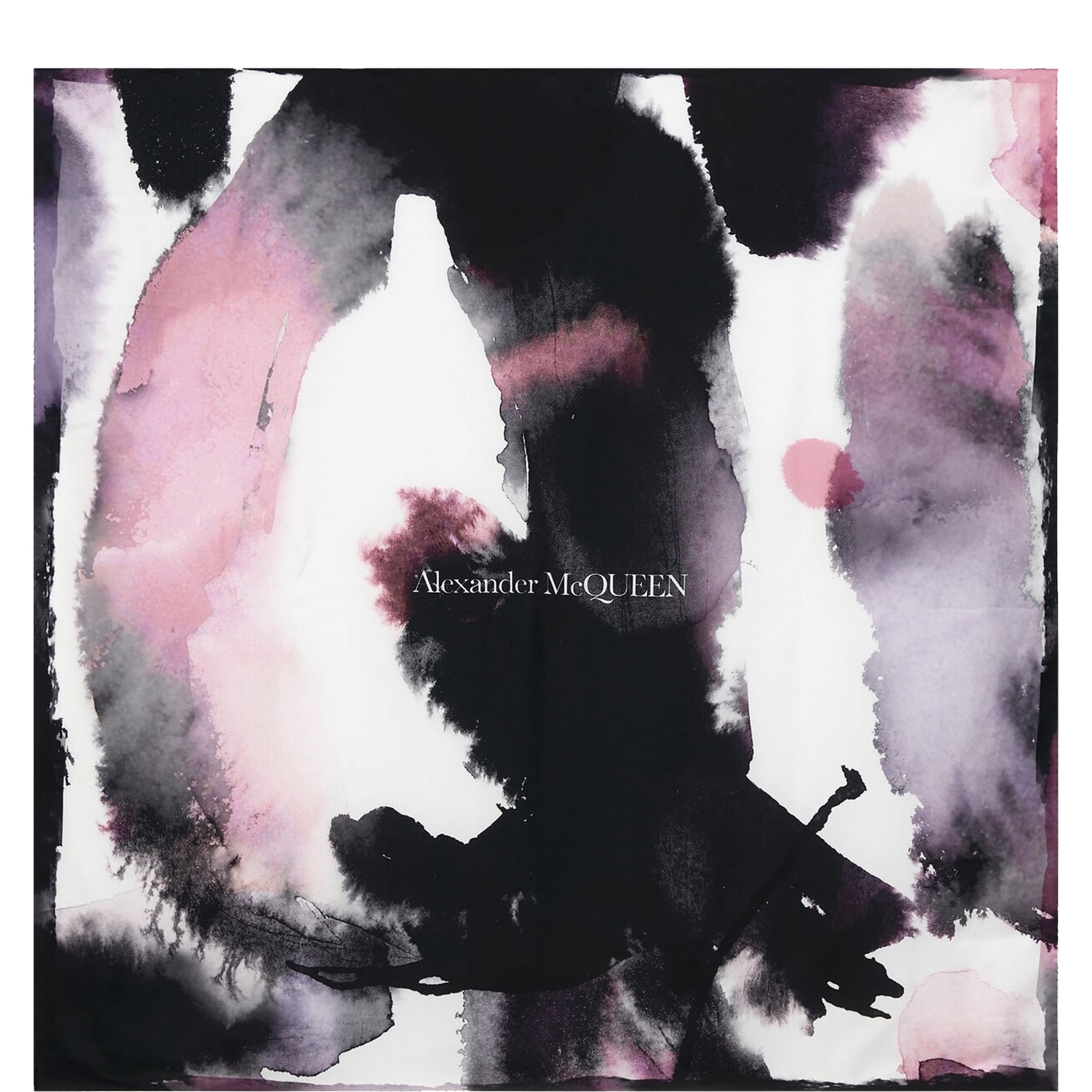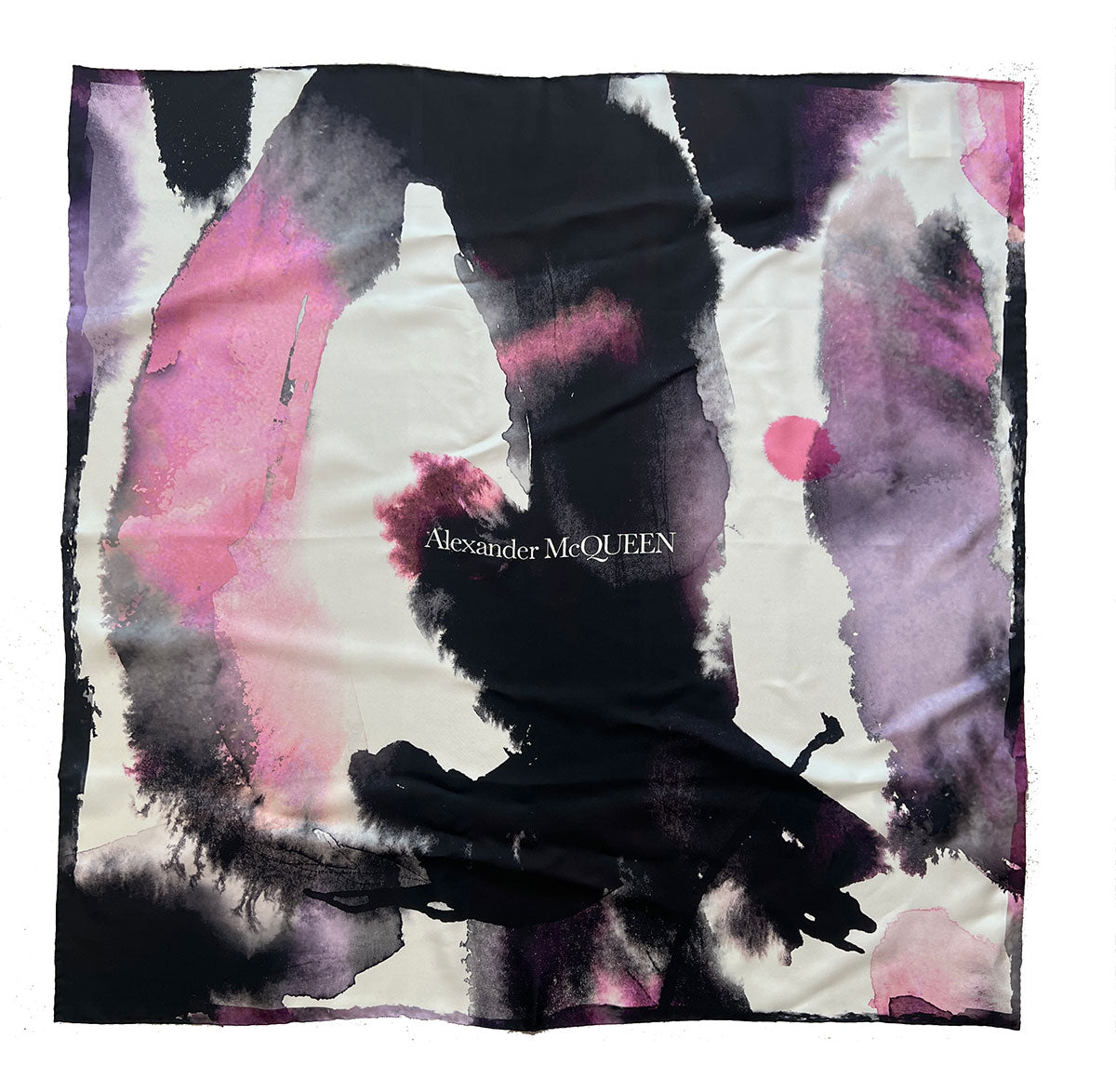 Silk watercolour McQueen scarf. Ivory and black silk twill foulard featuring a zoomed-up version of the Watercolour Graffiti print. Finished with rolled edges and an Alexander McQueen signature in the middle.