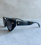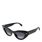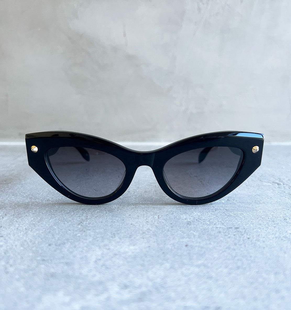Shiny black acetate sunglasses fitted with gradient grey lenses. The sunglasses have a cat-eye shape and are detailed with two light gold metal spike studs on both the front and the temples. Finished with a tonal lasered Alexander McQueen signature.