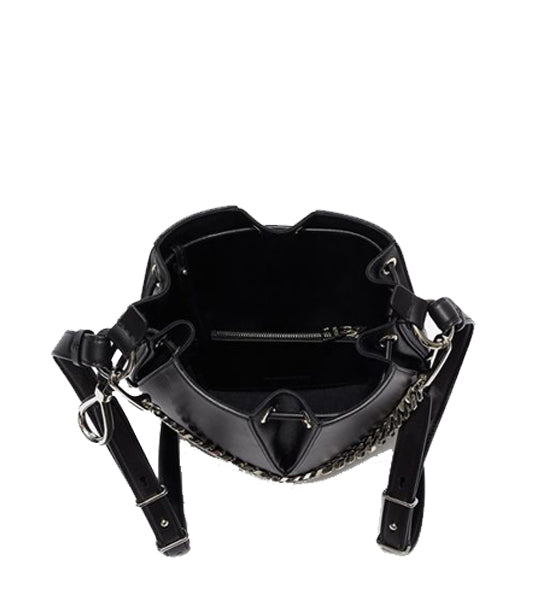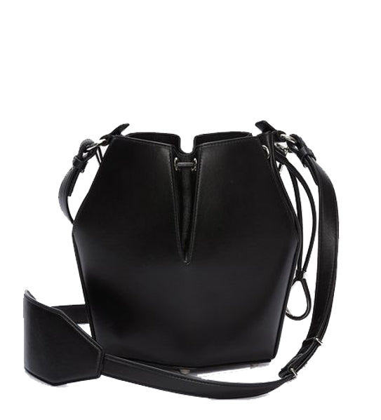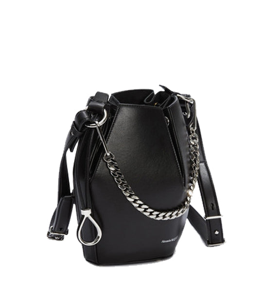 Alexander McQueen black calf leather small bucket bag inspired by signature McQueen tailoring. The bag can be worn in multiple ways: hand-held using the metal chain, with the leather strap on the shoulder or across the body. Features adjustable leather strap, one main compartment and removable zipper pouch.