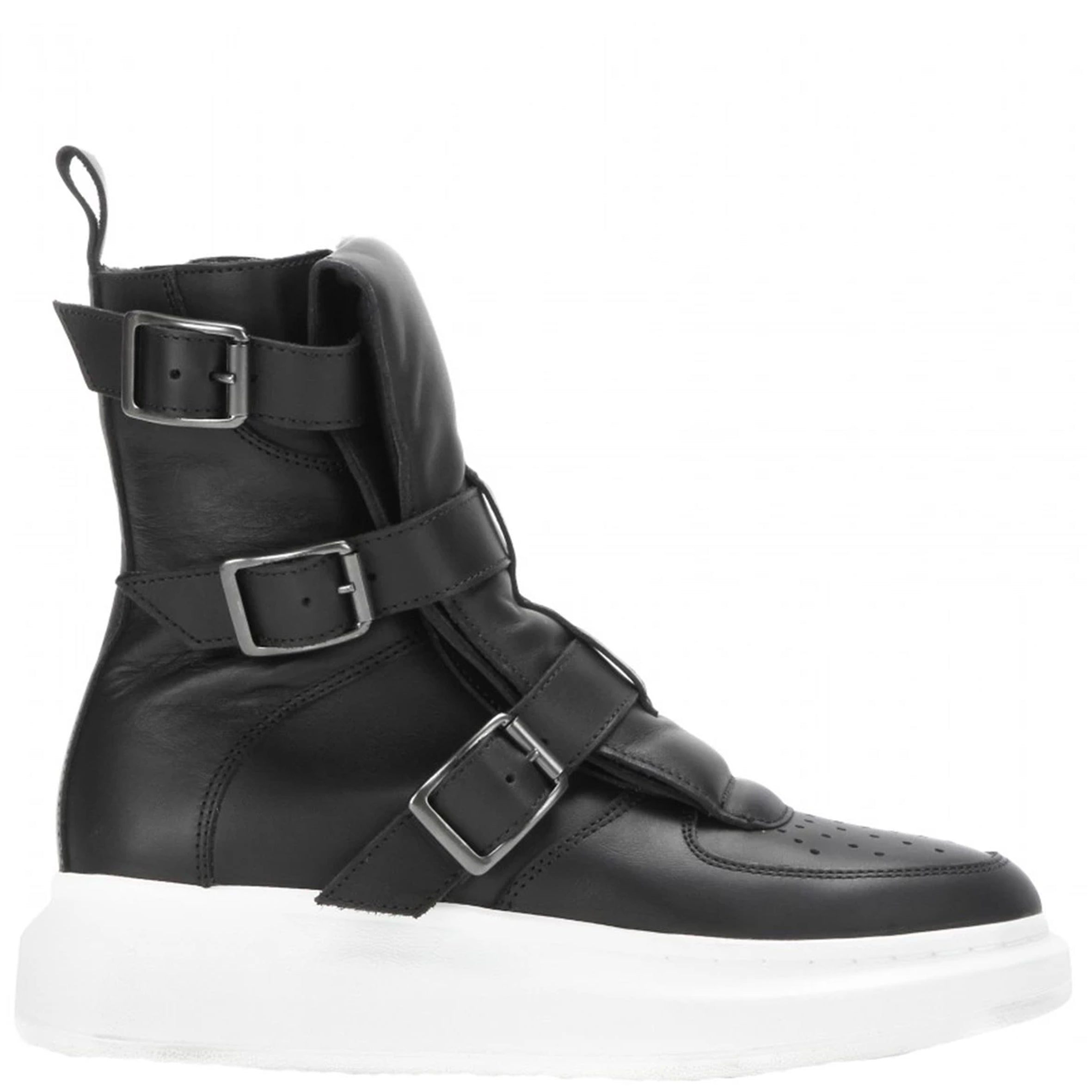 Black leather hi-top sneakers featuring Alexander McQueen's signature chunky exaggerated-sole rubber outsole. Pull tab fastening to the side, multi side buckle fastenings, a round toe, a side zip fastening.