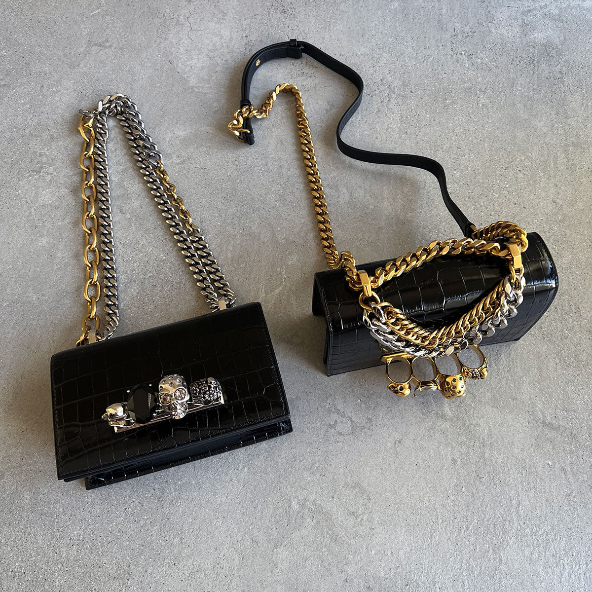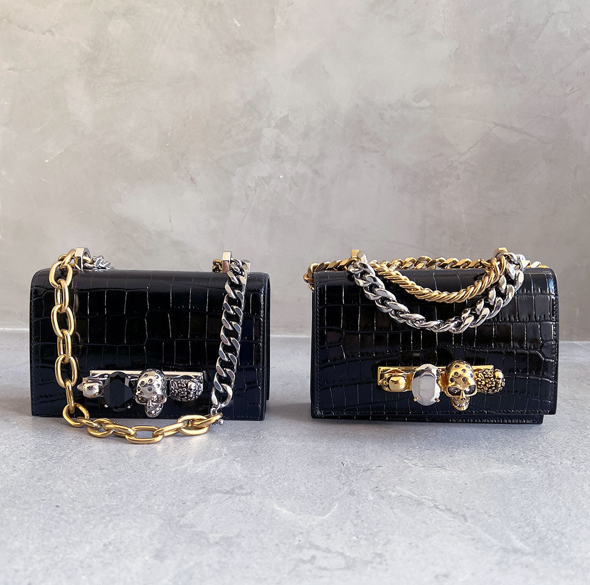 Shiny soft black embossed croc calf leather Mini Jewelled Satchel featuring silver and gold-finished chain details with adjustable leather section. This bag can be worn in multiple ways: carry it in your hand using the ring handle or by doubling up the strap. Alternatively, wear it over the shoulder or across the body using the leather and chain strap.