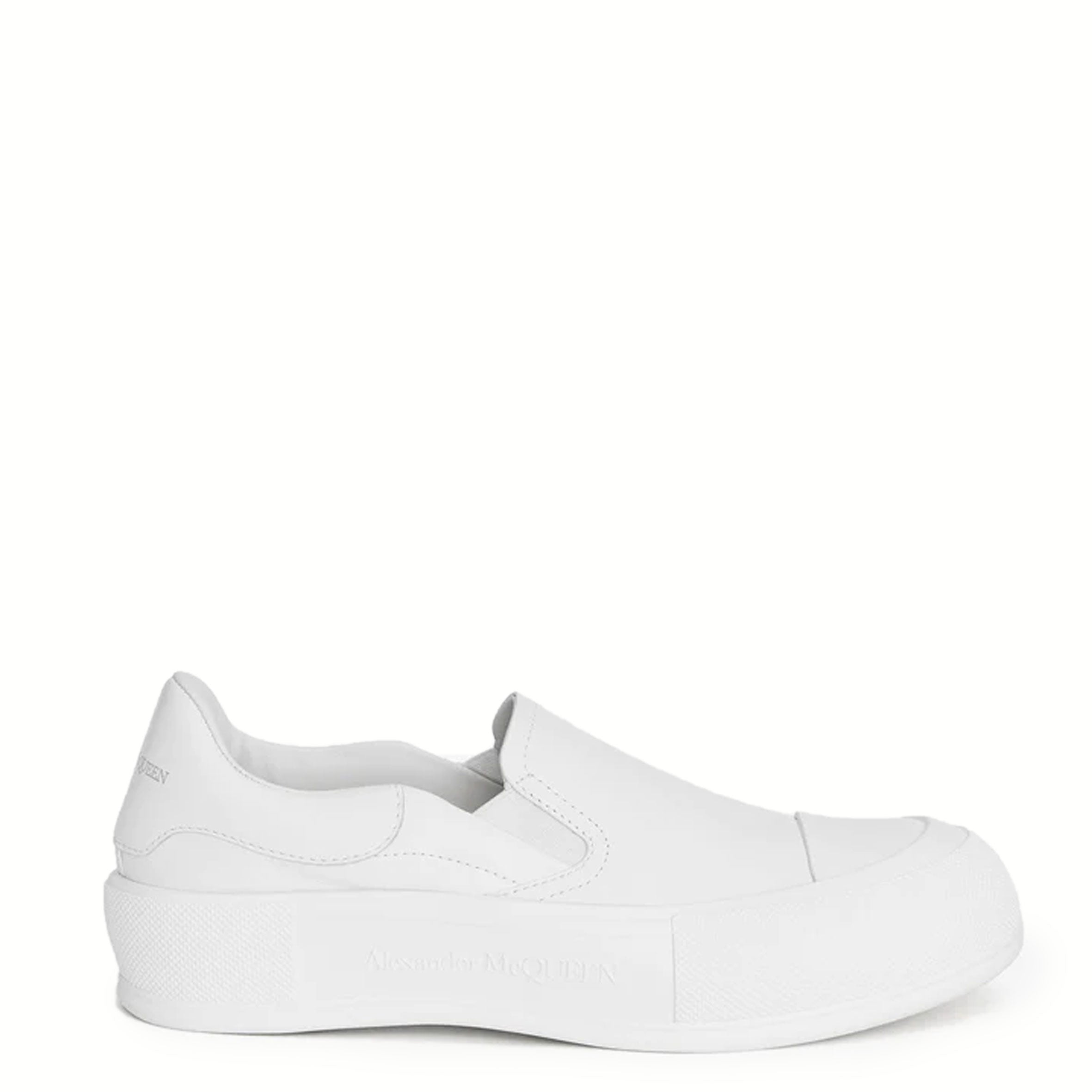 White nappa slip-on Deck plimsoll with a thick oversized rubber sole. The plimsoll is detailed with a rubber wrap sole and tonal Alexander McQueen signature, finished with a signature heel counter. Round toe shape silhouette details rubber toe cap.