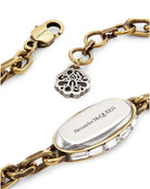 Alexander McQueen double signet bracelet is crafted of gold-tone brass with an antique finish. This edgy piece features a skull-embossed pendant with a crystal baguette border on a bold chain and lobster clasp.