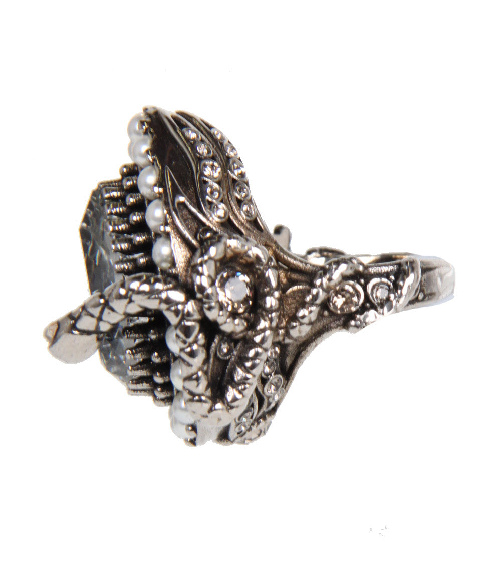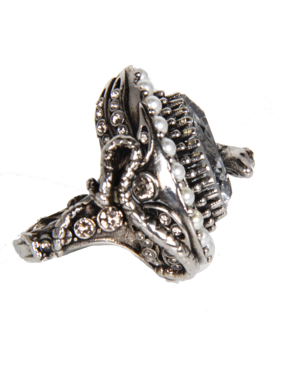Alexander McQueen antique silver-finished drop ring with snake detailing. The drop ring is made of a Swarovski crystal, surrounded by faux pearls.