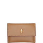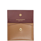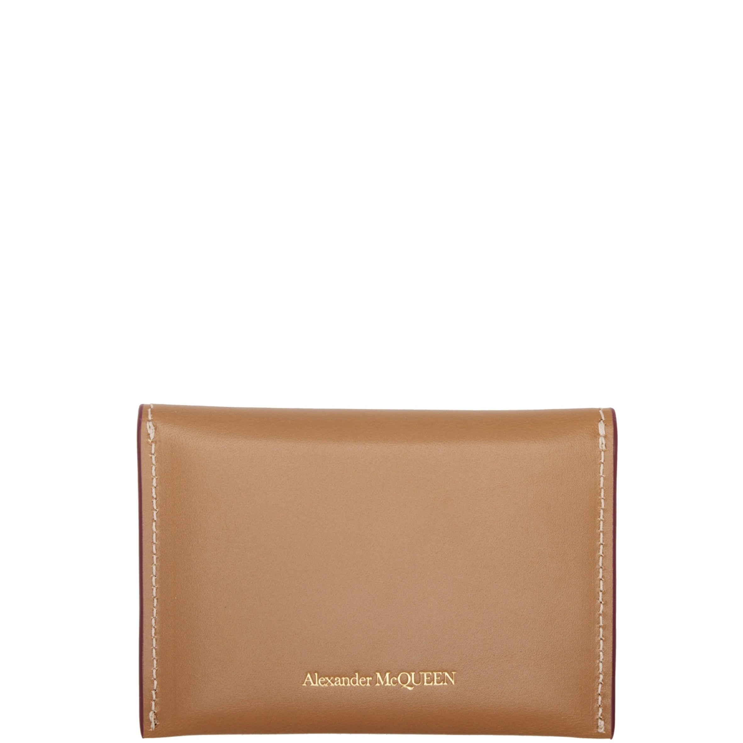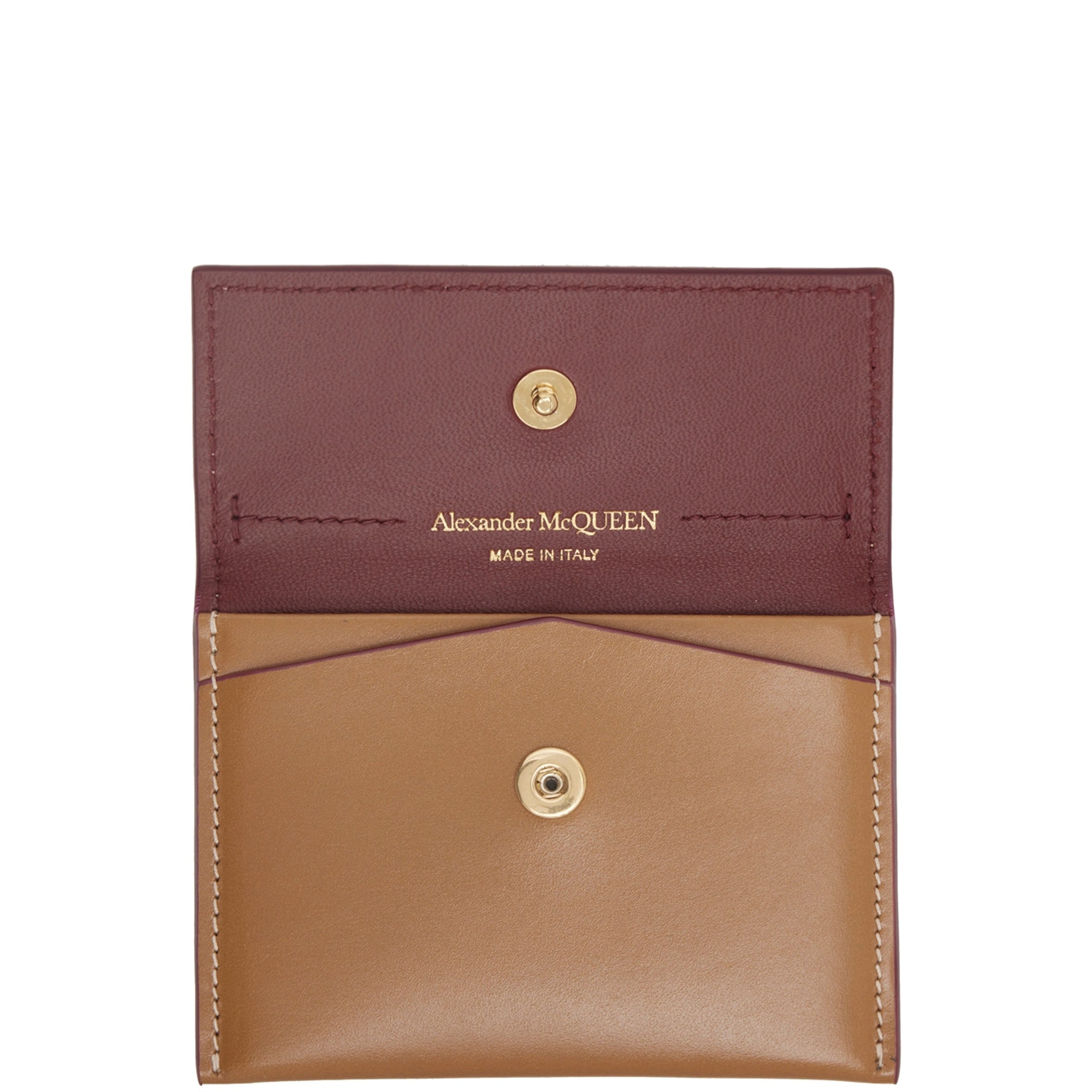 Calfskin leather envelope card holder with a decorative metal skull. Features one central compartment. Brass hardware with a silver finish.