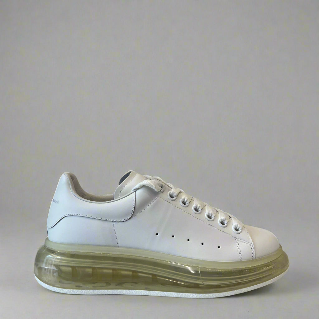 White smooth calf leather lace up sneaker with rounded toe. The sneaker features large flat laces and is finished with an Alexander McQueen signature on the heel counter, leather tongue and white tab. Oversized clear sole.