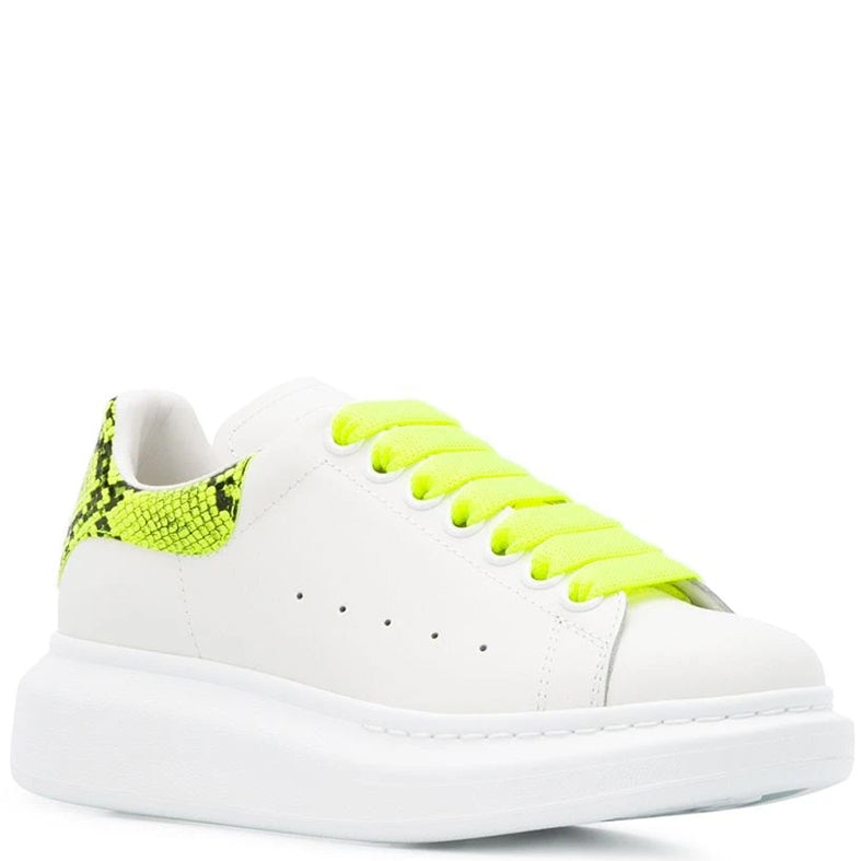 White smooth calf leather lace up sneaker with rounded toe and trimmed with cobra neon yellow heel detail. The sneaker features large flat laces and is finished with an Alexander McQueen signature on the heel counter and leather tongue. Oversized rubber sole.