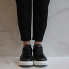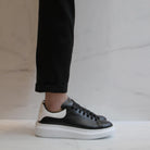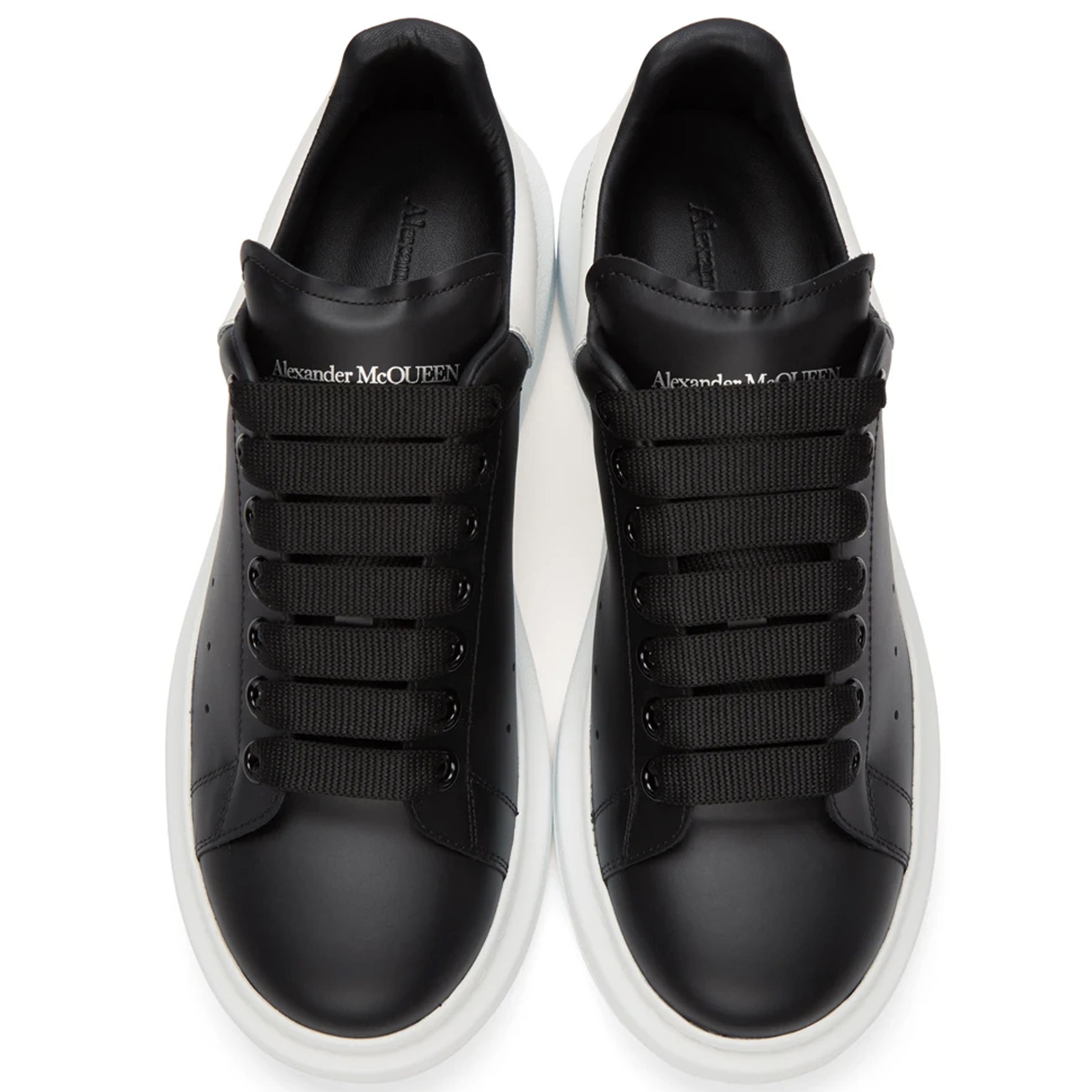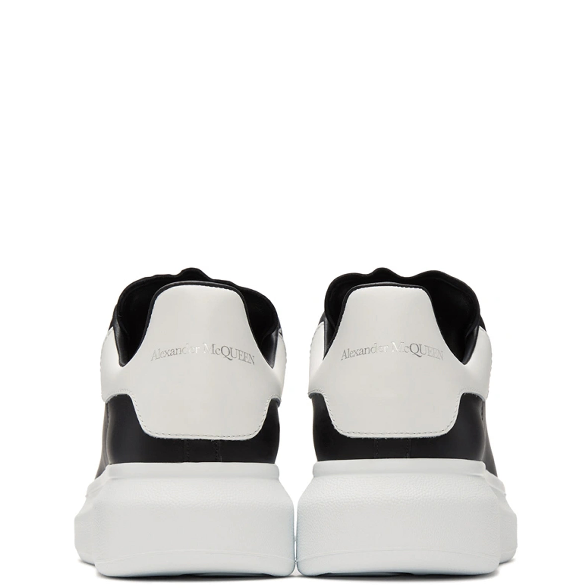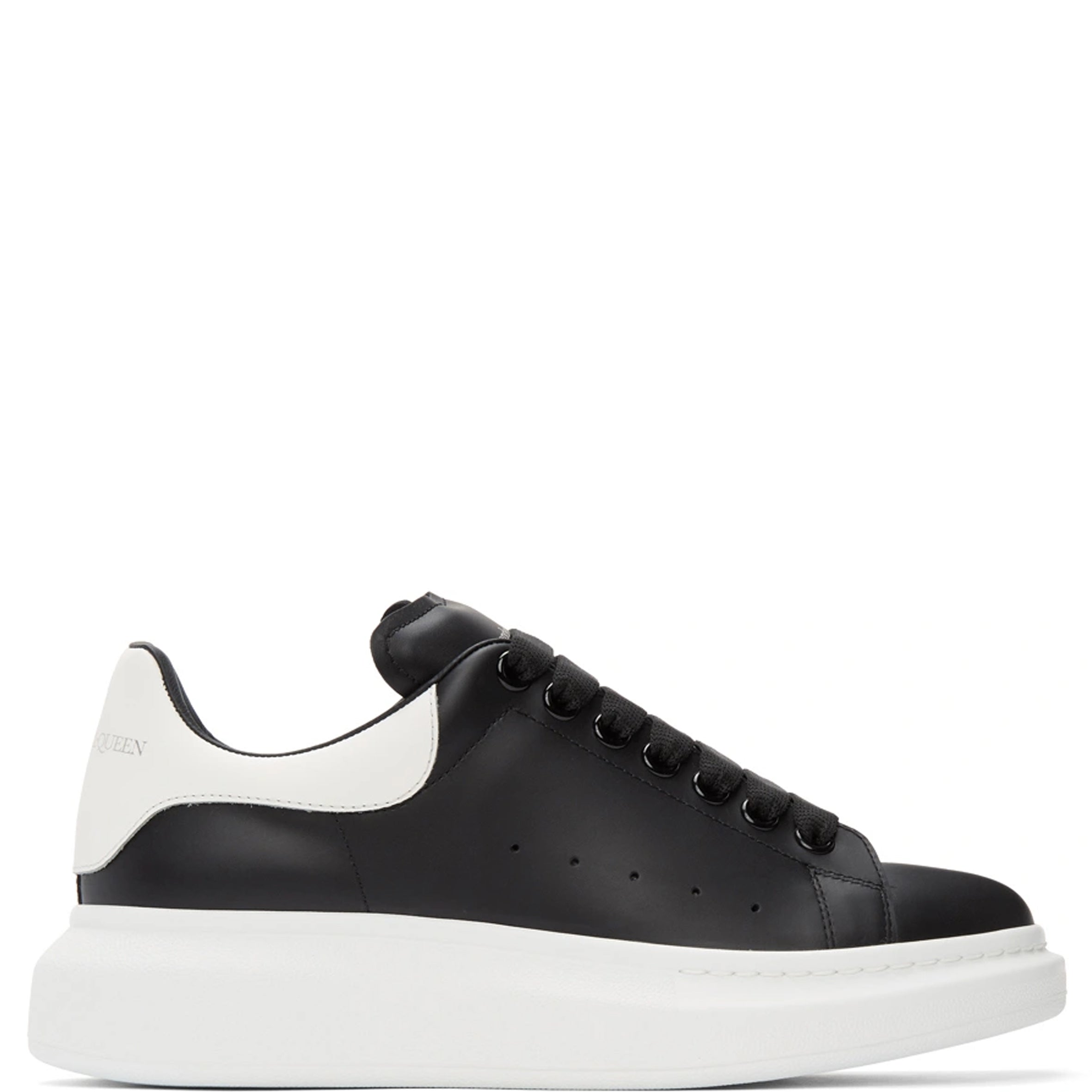 White smooth calf leather lace up sneaker with rounded toe and trimmed with black suede heel detail. The sneaker features large flat laces and is finished with an Alexander McQueen signature on the heel counter and leather tongue. Oversized rubber sole. E = wide fit.