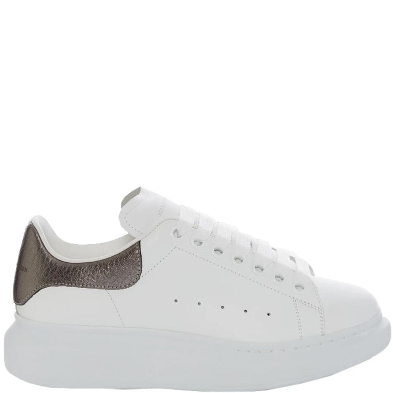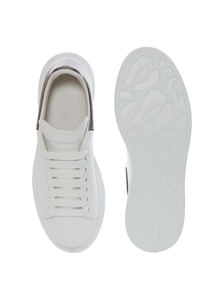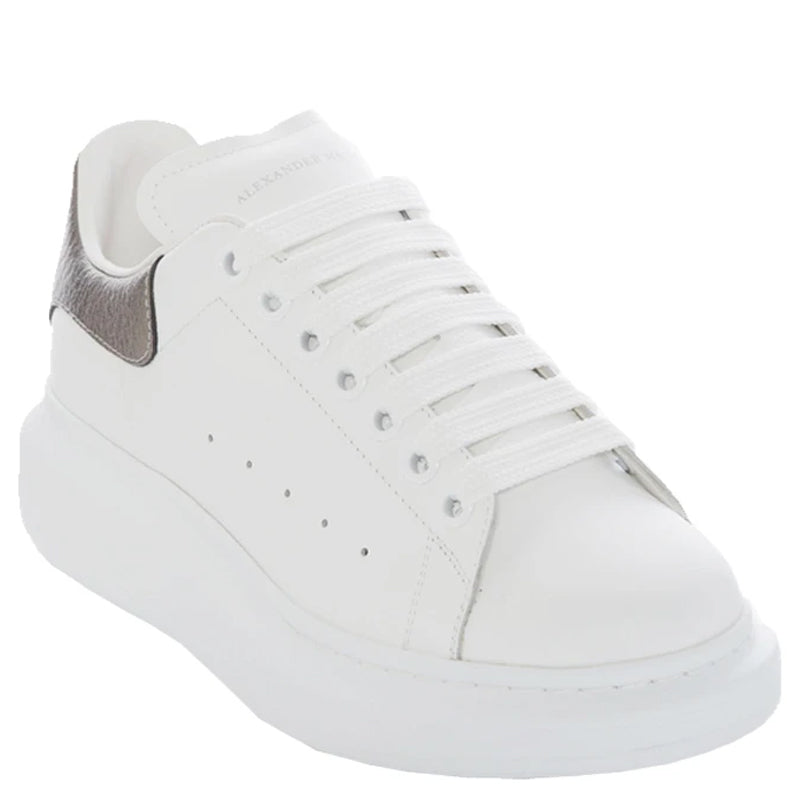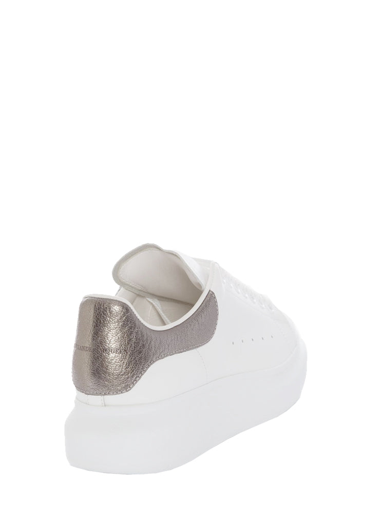 White smooth calf leather lace up sneaker with rounded toe and trimmed with metallic grained lamb leather heel detail. The sneaker features large flat laces and is finished with an Alexander McQueen signature on the heel counter and leather tongue. Oversized rubber sole.