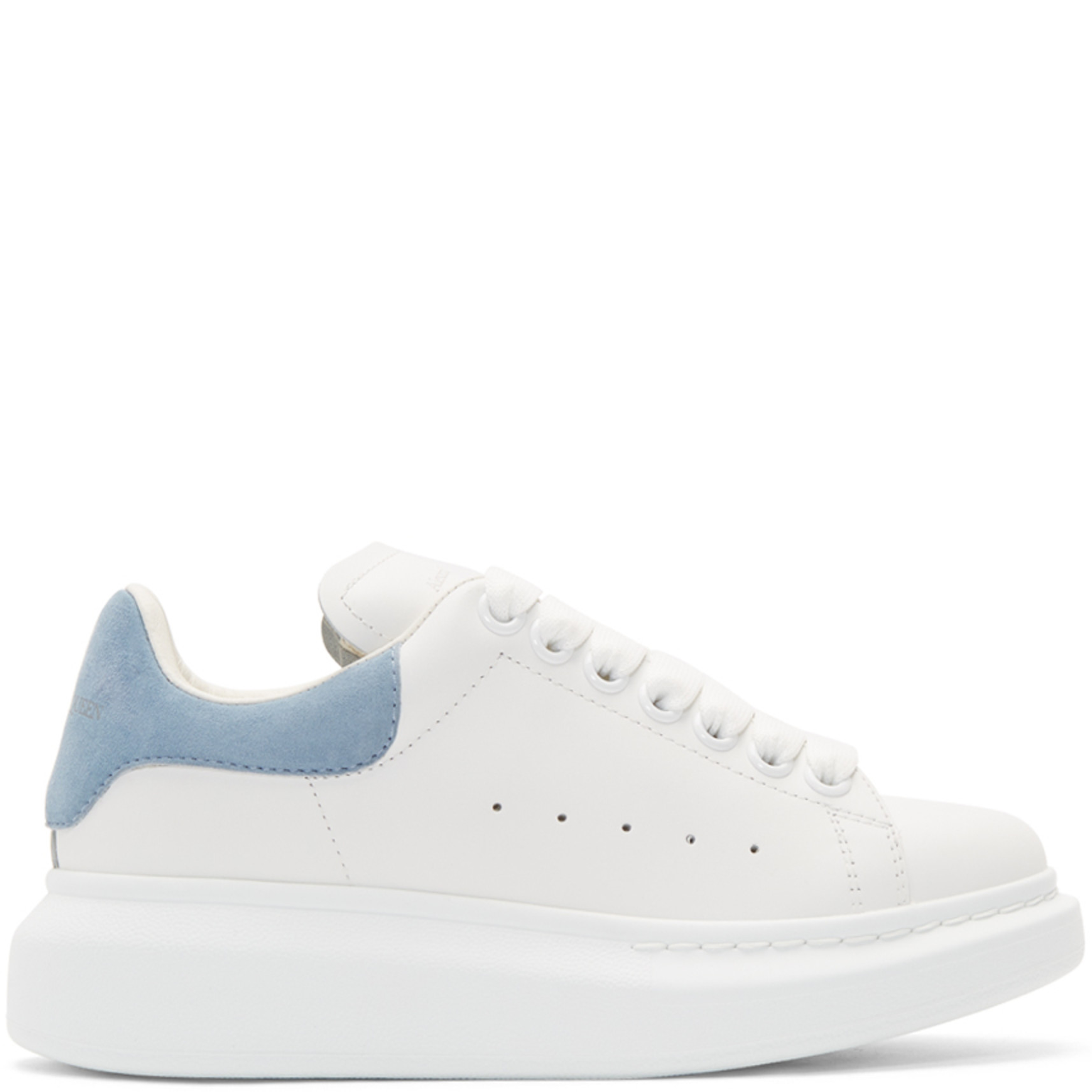 White leather paneled sneakers from Alexander McQueen featuring a round toe, a lace-up front fastening, a brand embossed tongue, a brand embossed insole and a white rubber exaggerated-sole.