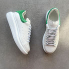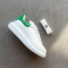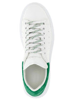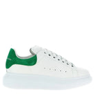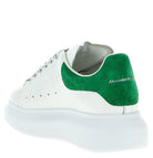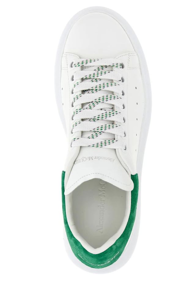 White smooth calf leather lace up sneaker with rounded toe and trimmed with hali pink suede heel detail. The sneaker features large flat laces and is finished with an Alexander McQueen signature on the heel counter and leather tongue. Oversized rubber sole.