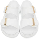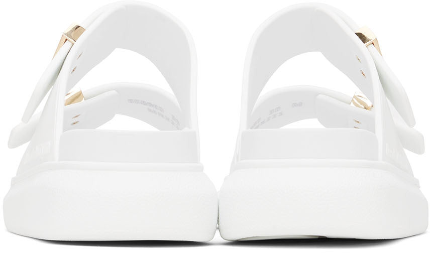 Black rubber slide featuring signature Alexander McQueen exaggerated rubber soles, with gold hardware. A hybrid of a sneaker and a slide, these features a round toe silhouette with a metal hardware bar slide and engraved with signature Alexander McQueen.