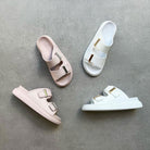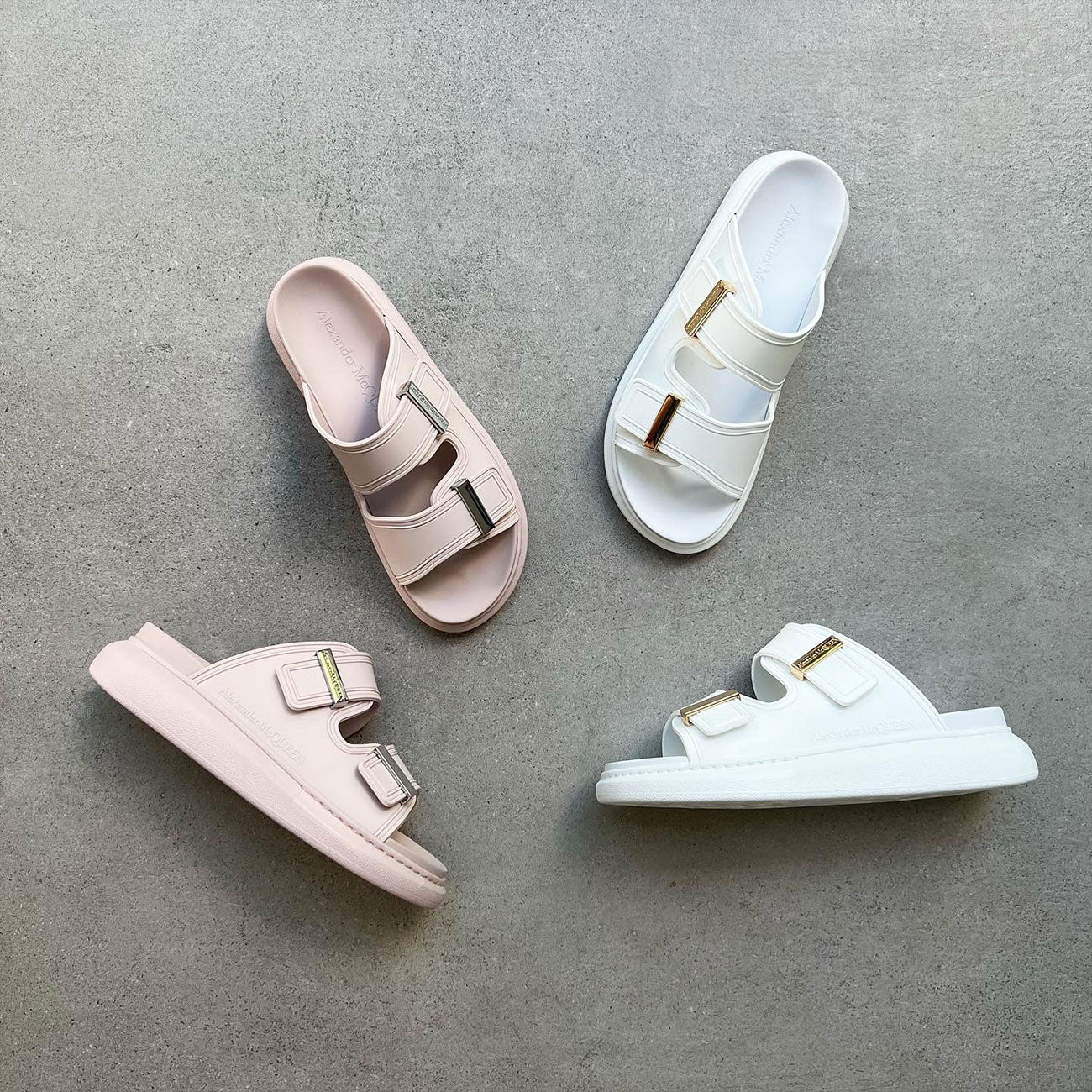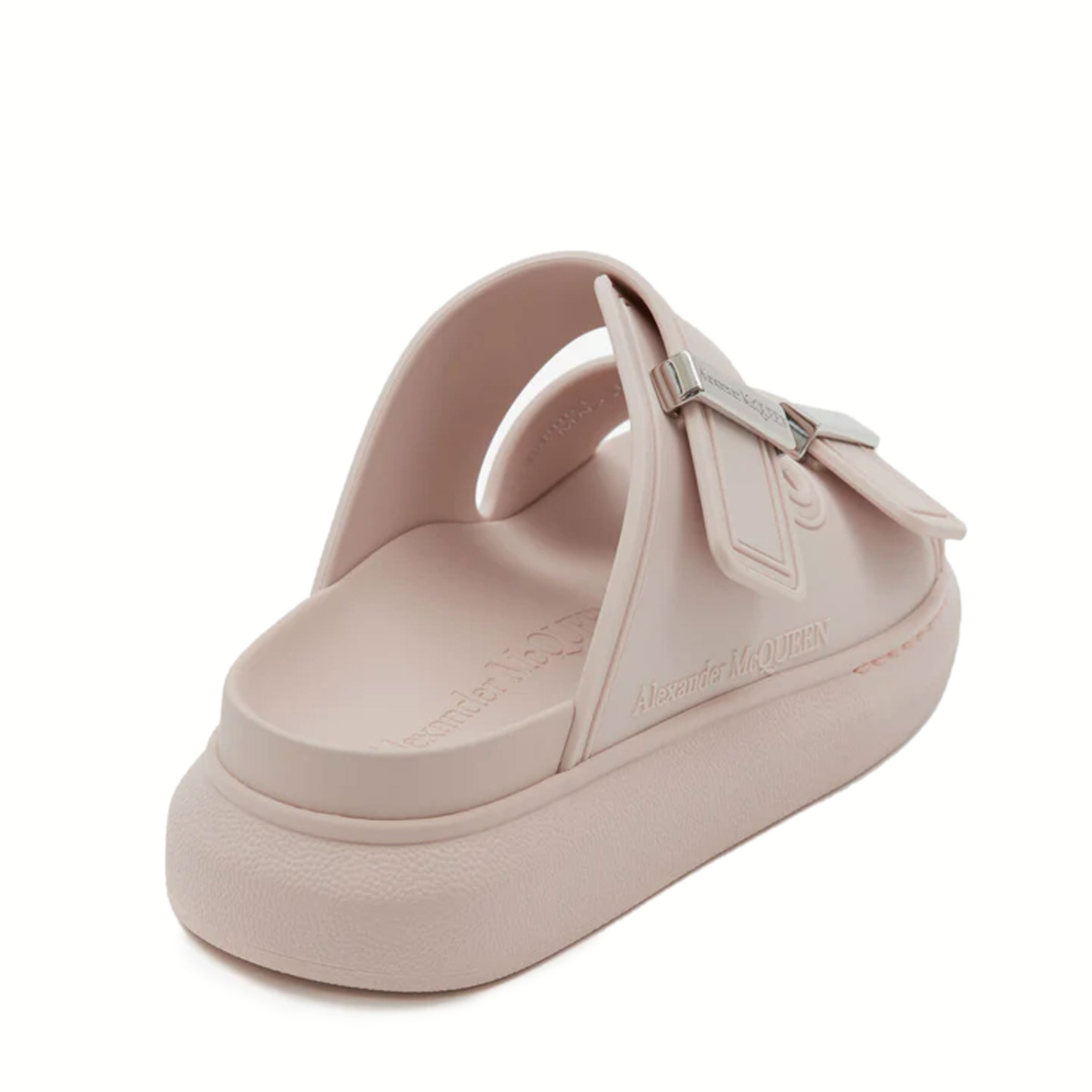 Rose rubber slide featuring signature Alexander McQueen in high relief, silver hardware and an oversized rubber sole. The slide features a round toe silhouette with a metal hardware bar slide and engraved with signature Alexander McQueen.