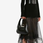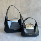 Black smooth calfskin leather Jewelled Hobo bag featuring an antique gold-finished handle adorned with Swarovski-encrusted rings. The unique silhouette of the Jewelled Hobo bag is inspired by the faceted stone that sits on the Skull Four Ring, and features leather panels that are cut and re-assembled together. This bag can be worn either hand-held or over the shoulder.