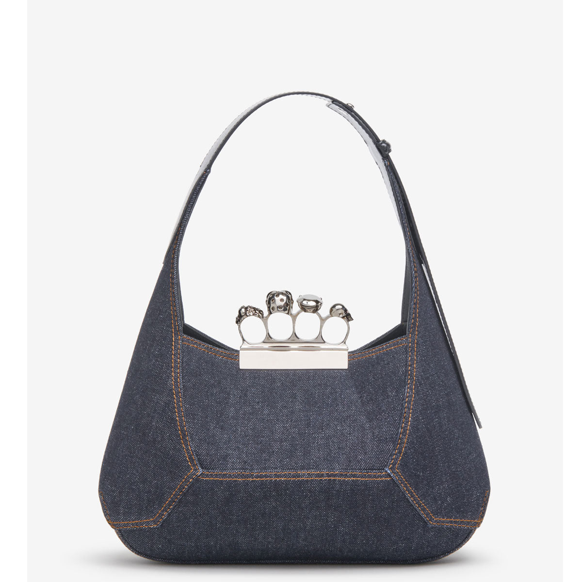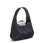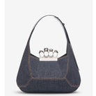 Blue denim Jewelled Hobo with contrasted colour stitching, featuring an antique silver-finished handle adorned with Swarovski-encrusted rings. The unique silhouette of the Jewelled Hobo is inspired by the faceted stone that sits on the Knuckle, and features panels that are cut and re-assembled together. This bag can be worn either hand-held or over the shoulder.