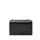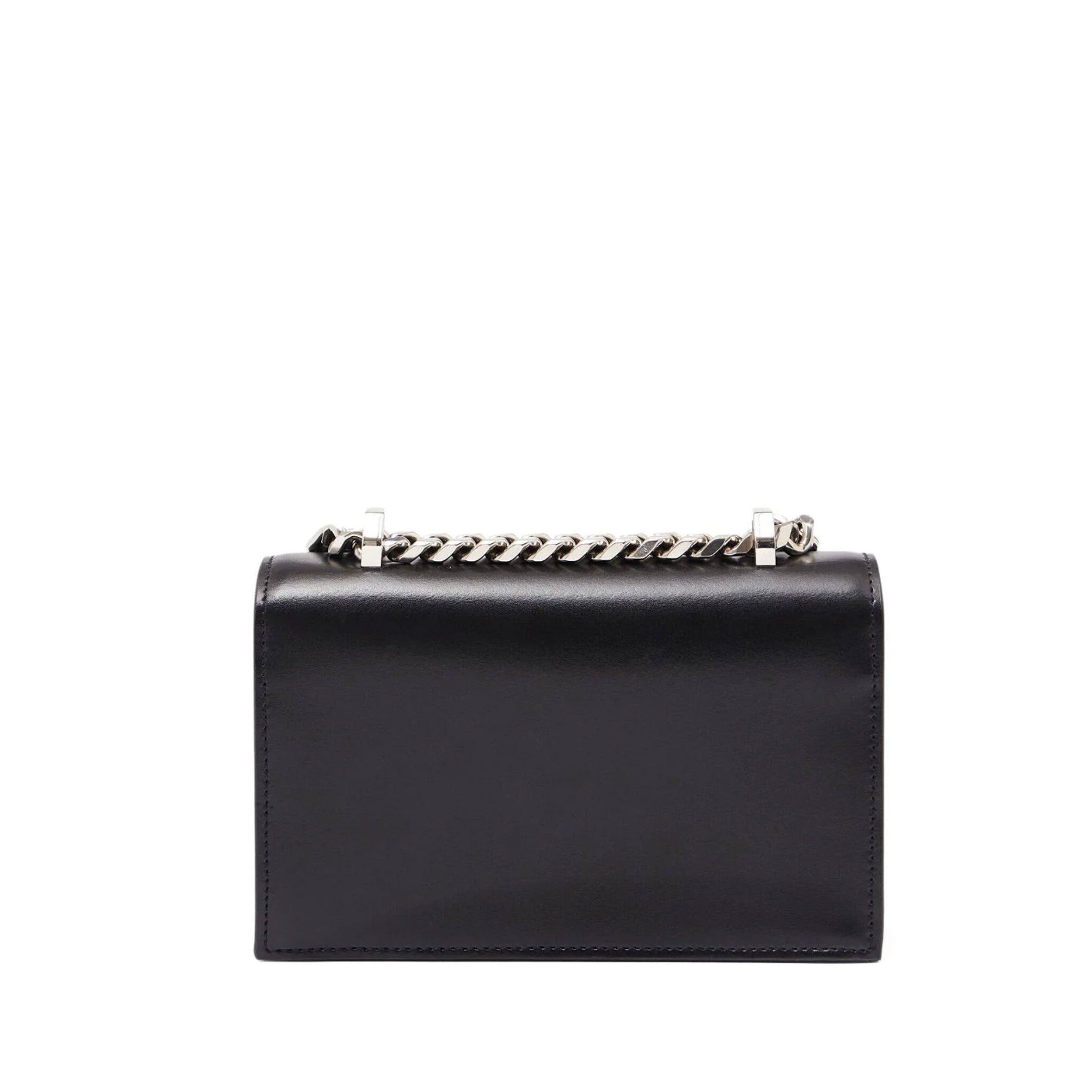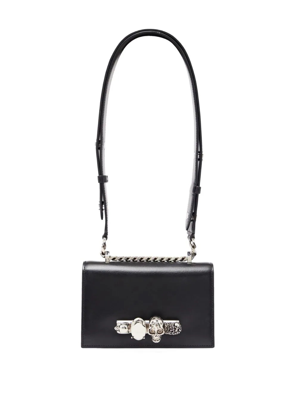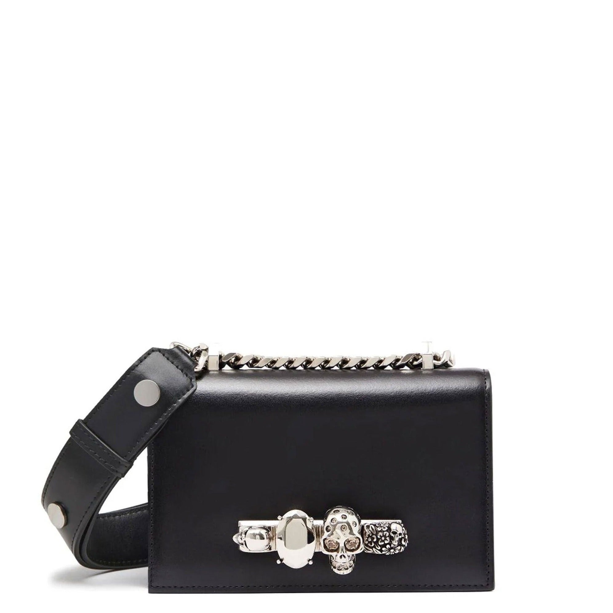 Alexander McQueen's 'Jewelled Satchel' features shiny black calfskin and is topped with a signature knuckleduster that's embellished with the label's iconic swarovski crystal-encrusted skulls and features a wide biker-inspired leather strap. This bag can be worn in multiple ways, carried by hand using the ring handle, over the shoulder or cross body using the long leather strap. The inside contains one main black suede lined compartment with one flat card slot. Can accomodate a smartphone.