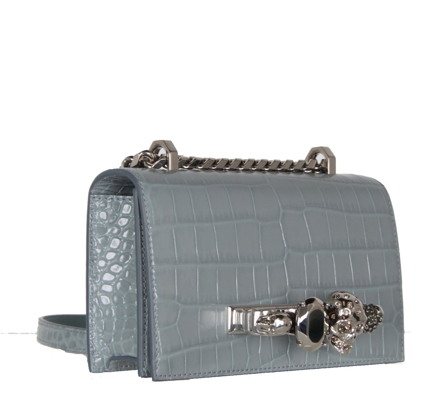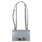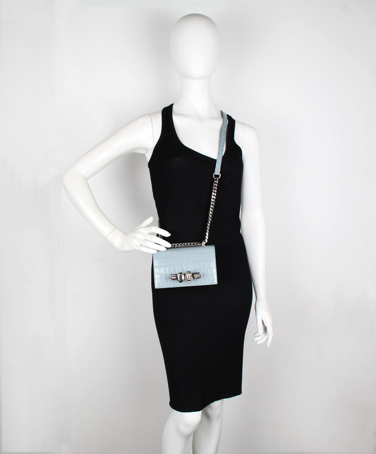 Shiny blue grey embossed croc calfskin leather Mini Jewelled Satchel. This bag can be worn in multiple ways: carry it in your hand using the ring handle or by doubling up the strap. Alternatively, wear over the shoulder or across the body using the leather and chain strap.