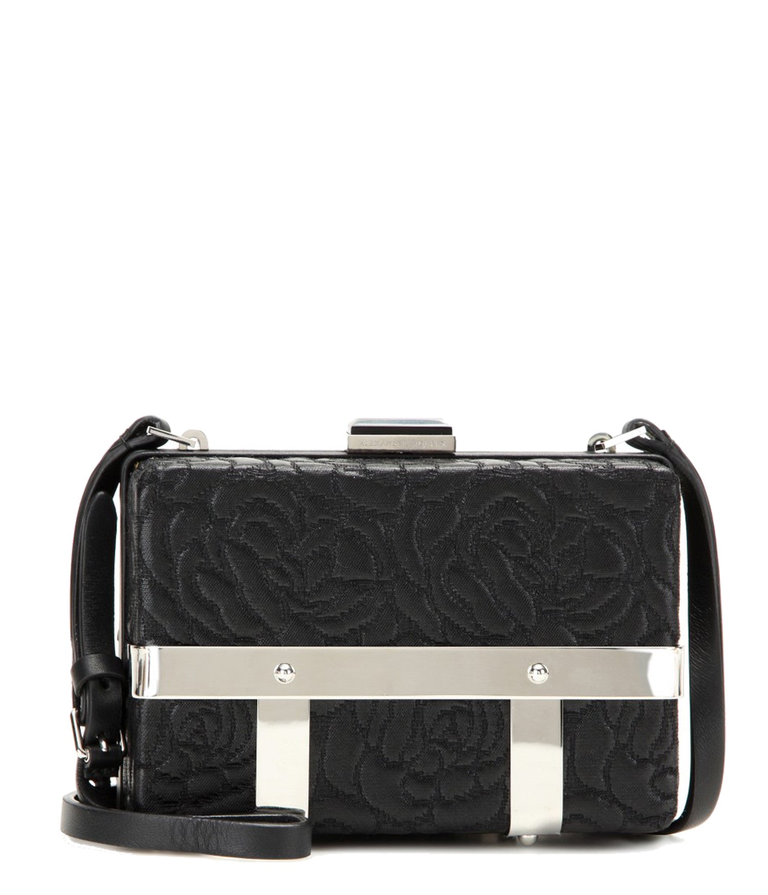 Black Large Caged Bag featuring stitched black fabric with a floral embossing pattern. Metal caged base, shoulder strap and metal top closure. Metal detailing lends this feminine piece a luxe gothic edge. Adjustable leather shoulder strap. Clasp fastening. Suede lining, inner slot pocket.