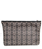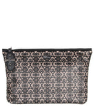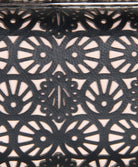Legend Pouch, Laser Cut-out. Black and beige leather knucklebox clutch with laser overlay detail and antique-finish hardware.