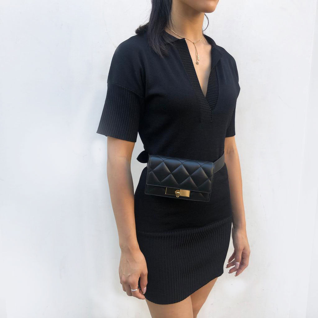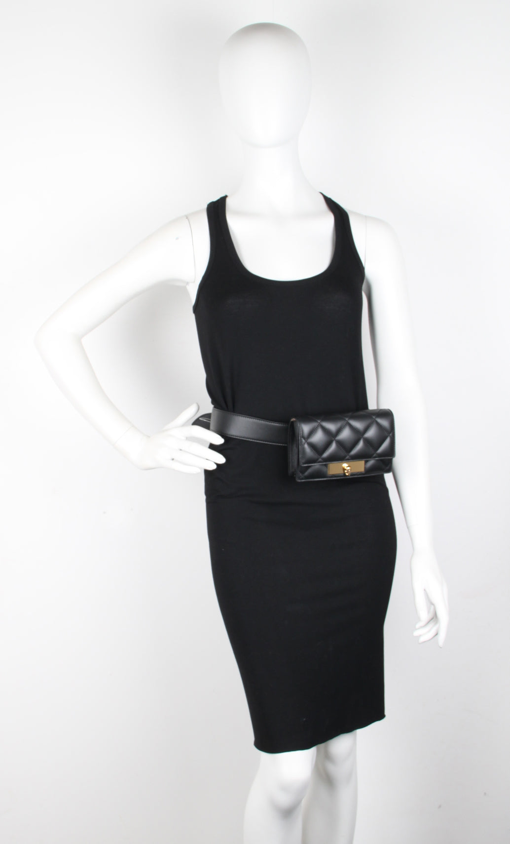 The quilted McQueen Lock belt bag comes with a detachable adjustable belt strap with buckle closure. It has a front flap with clasp closure and skull detail. An internal card slot and contrasting colour leather lining.
