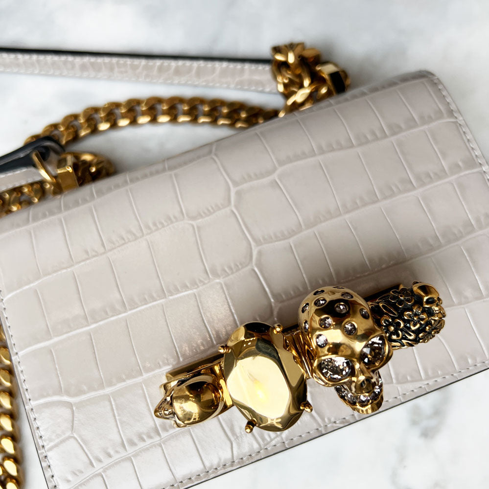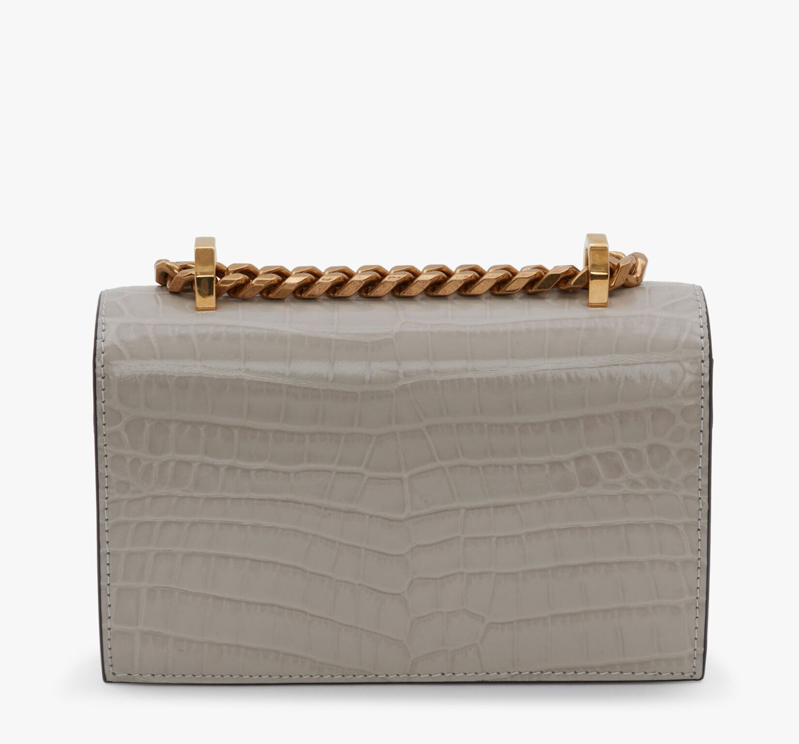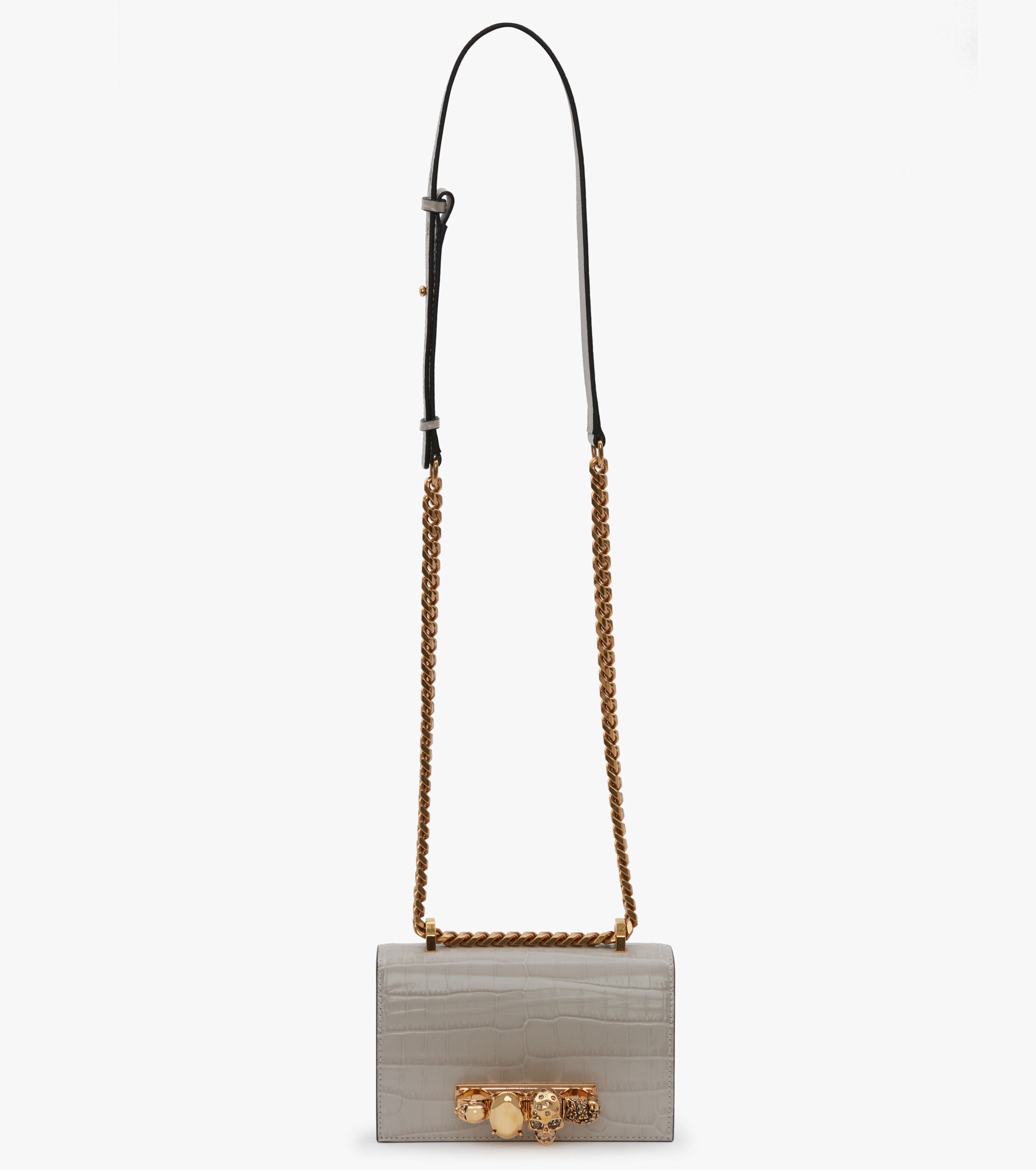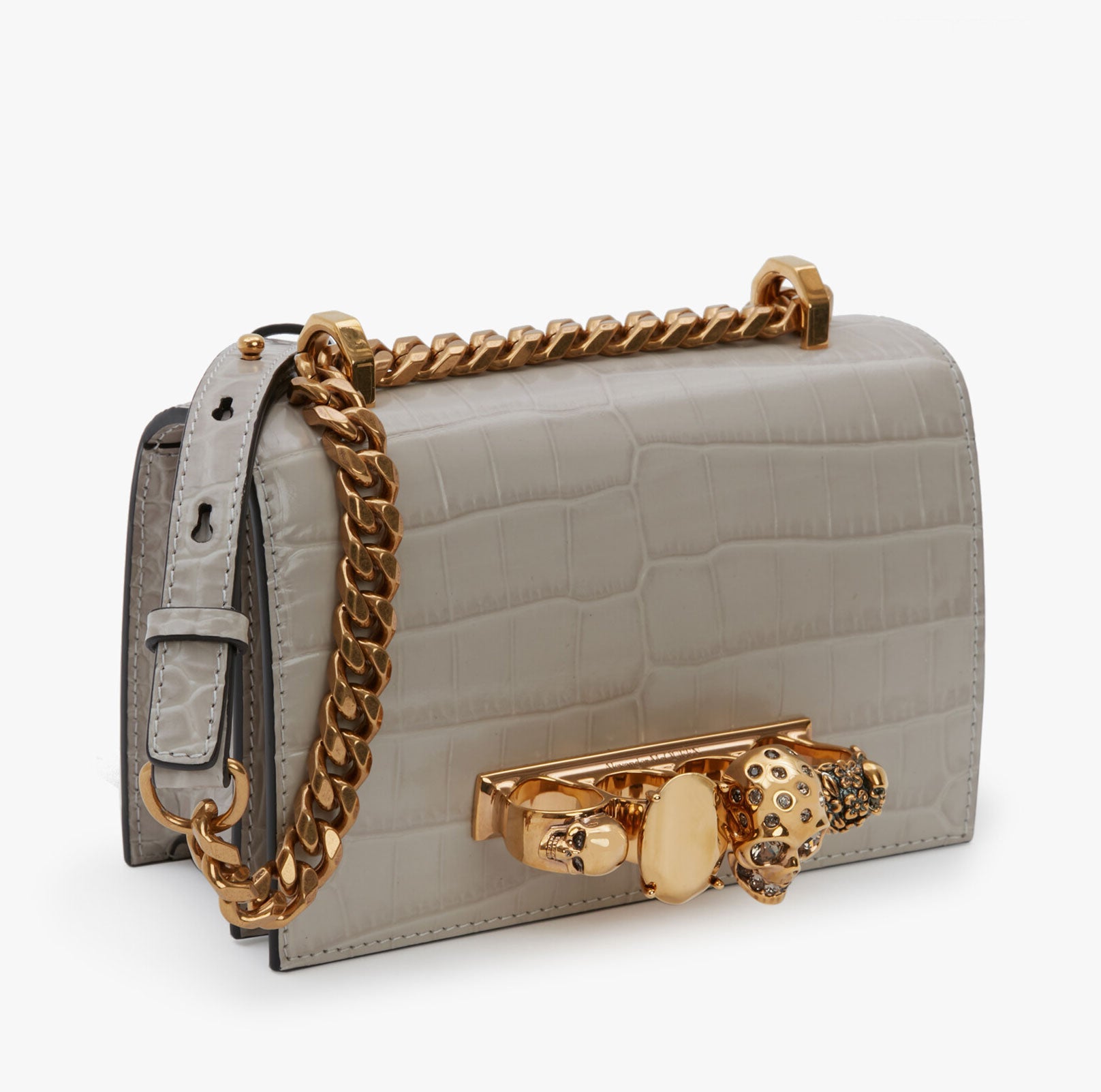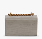 Shiny faded grey embossed croc calfskin leather Mini Jewelled Satchel. This bag can be worn in multiple ways: carry it in your hand using the ring handle or by doubling up the strap. Alternatively, wear over the shoulder or across the body using the leather and chain strap.