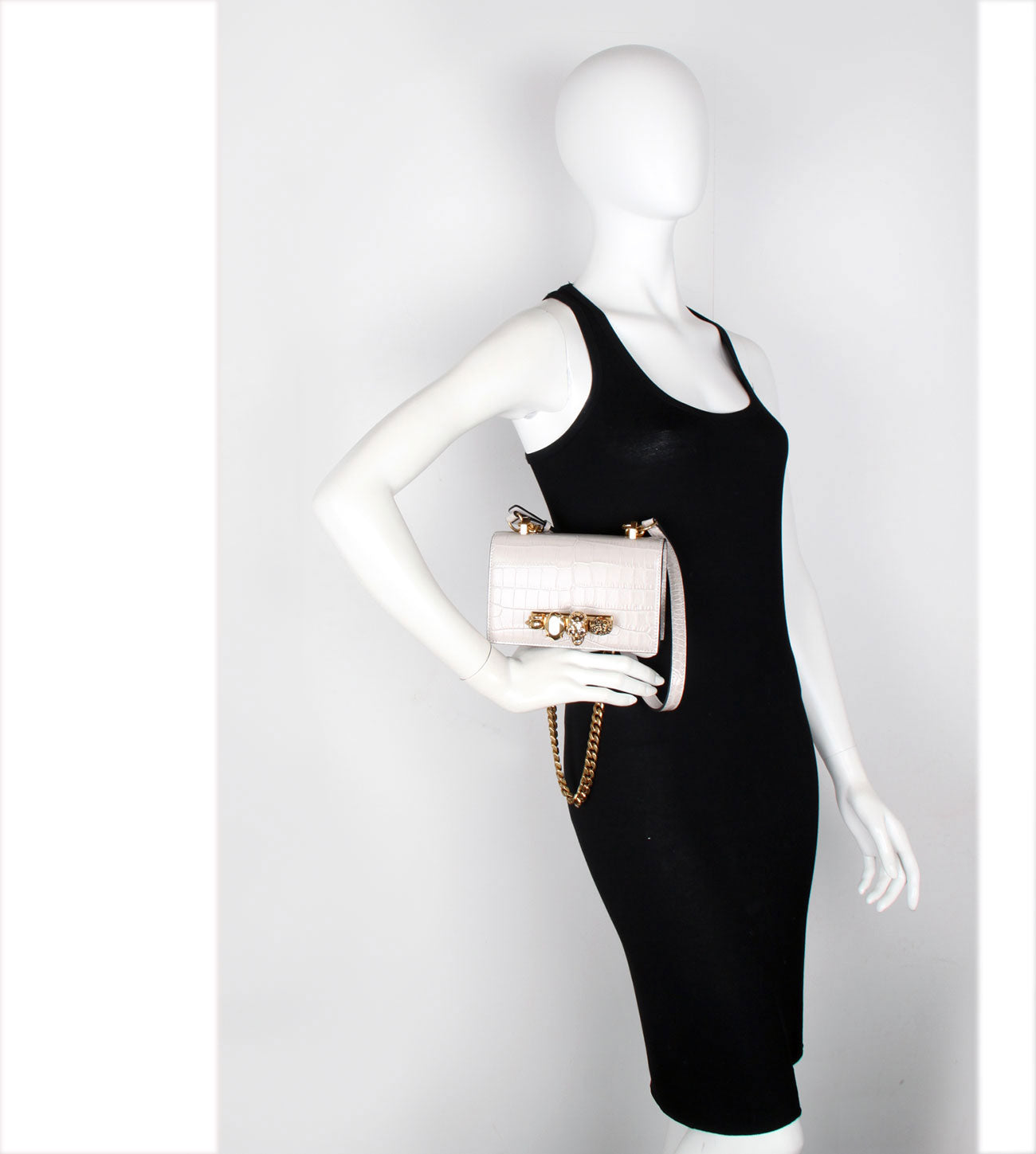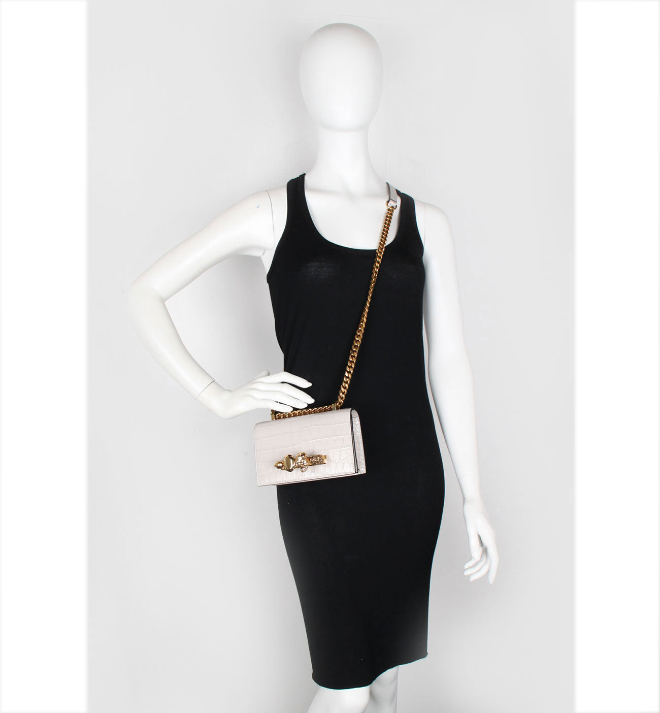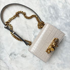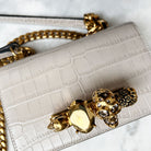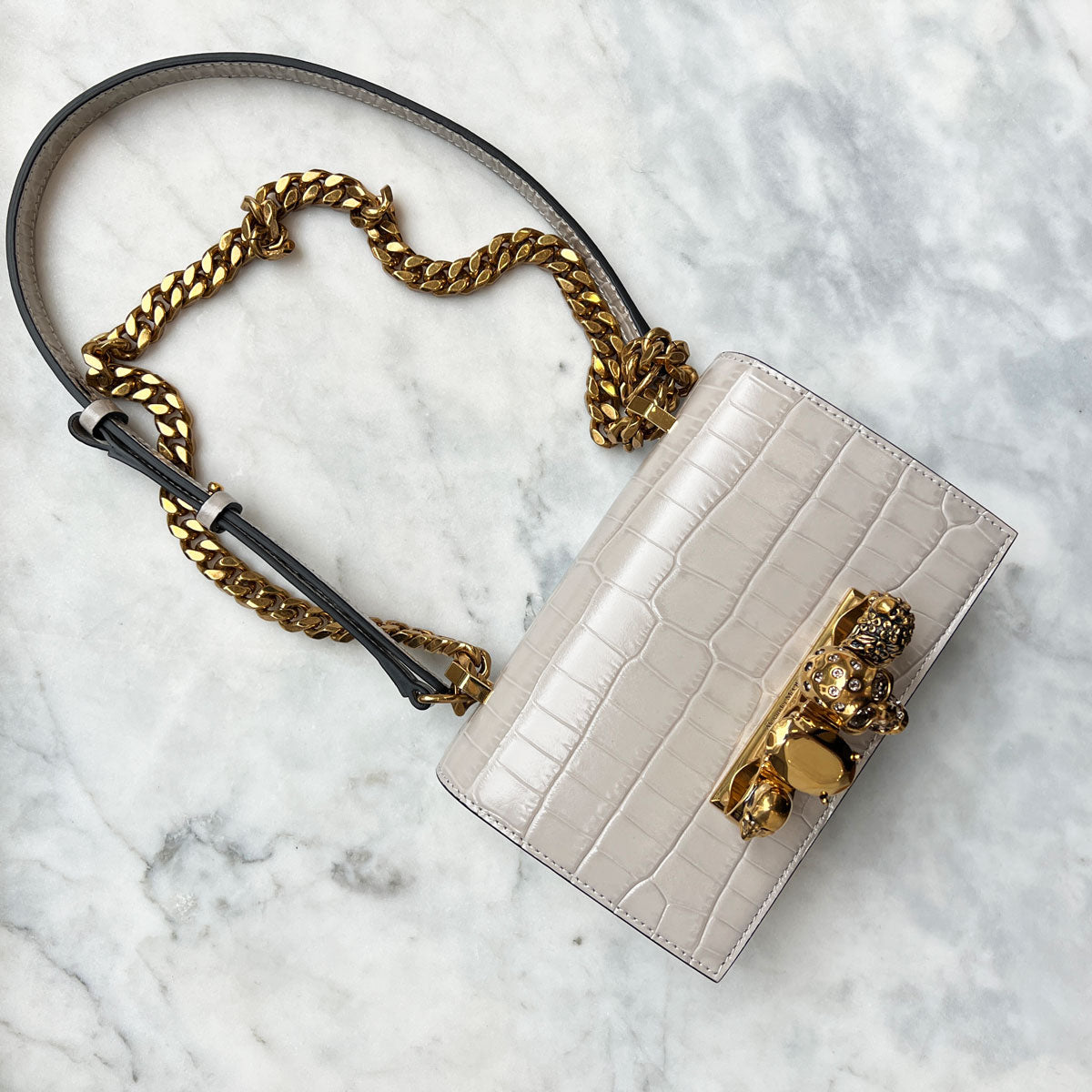 Shiny faded grey embossed croc calfskin leather Mini Jewelled Satchel. This bag can be worn in multiple ways: carry it in your hand using the ring handle or by doubling up the strap. Alternatively, wear over the shoulder or across the body using the leather and chain strap.