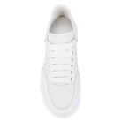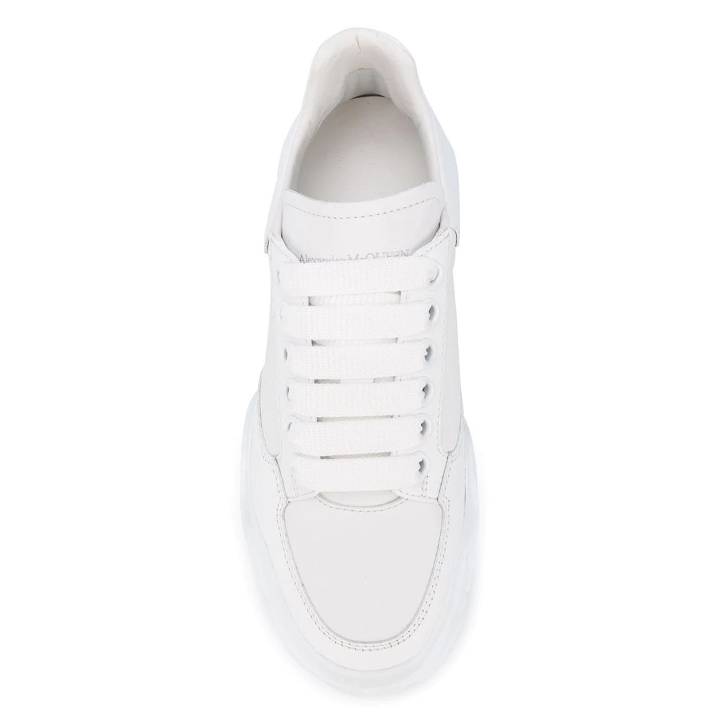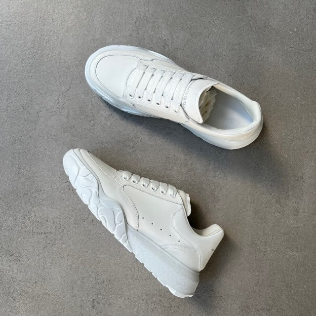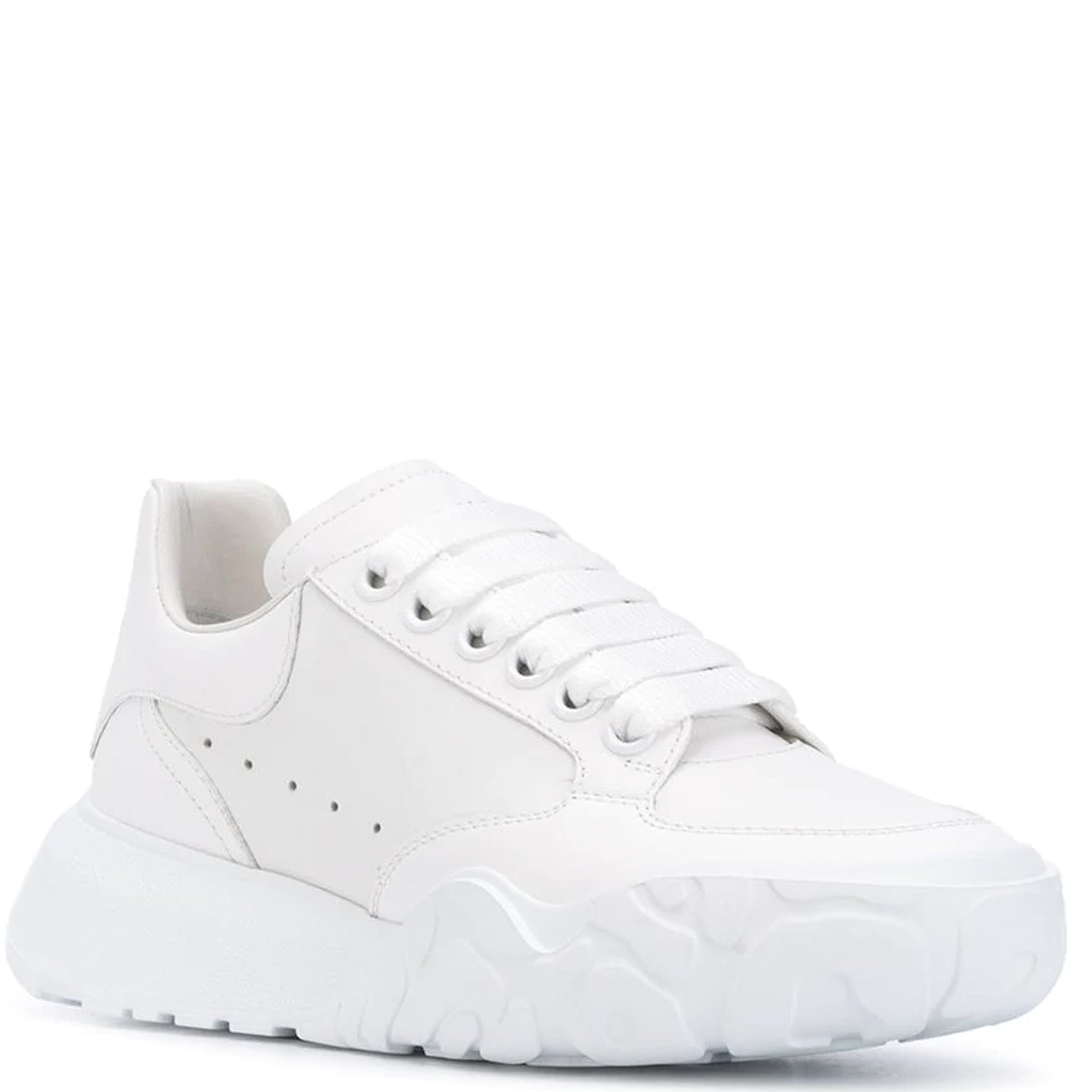 The sneaker features large flat laces and finished with an Alexander McQueen signature on the heel counter. Over-sized clear sole with signature stamp design.