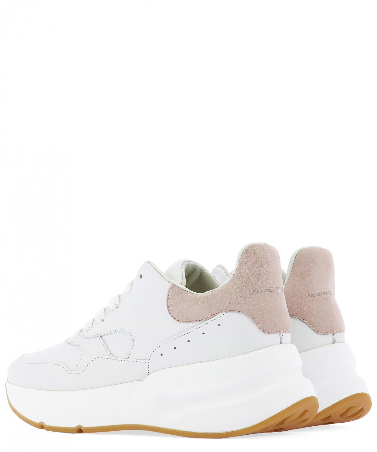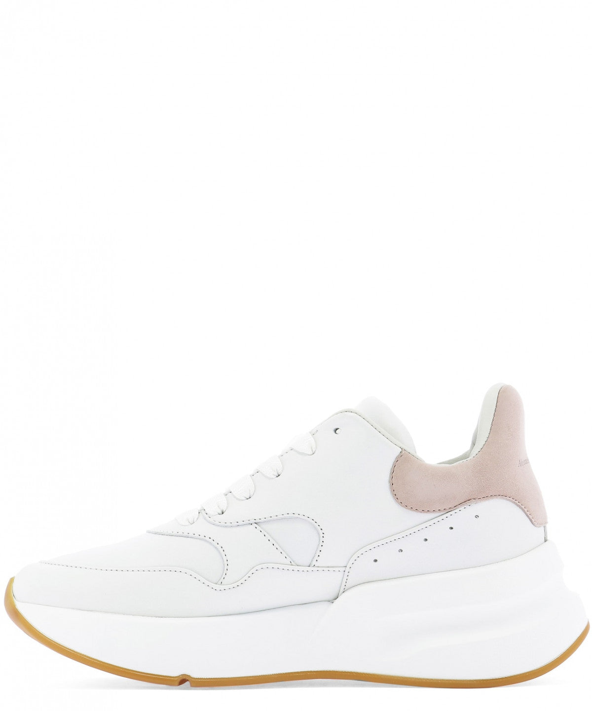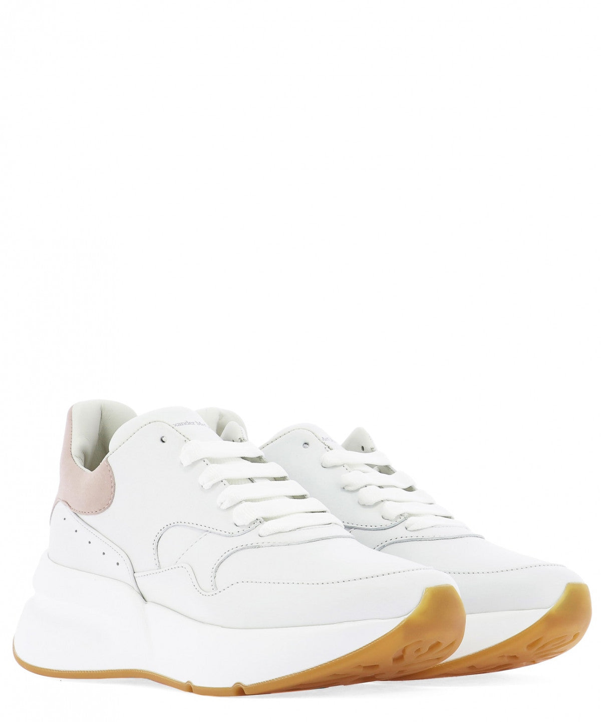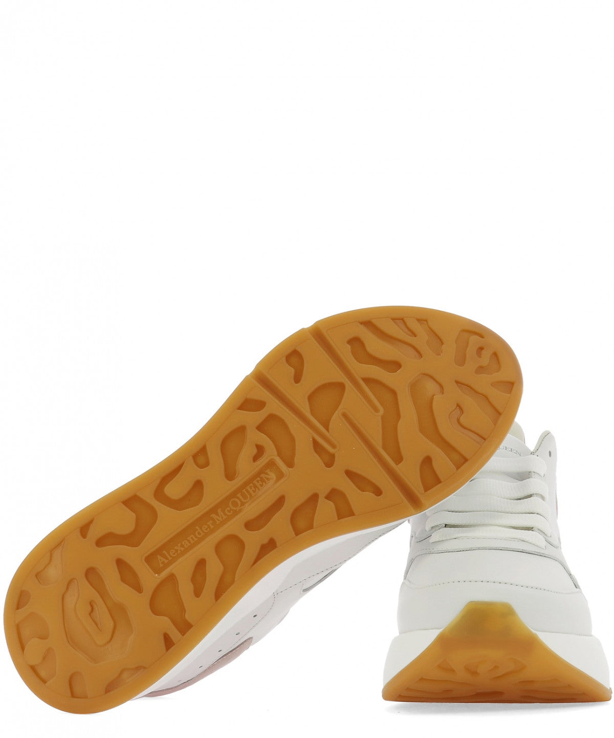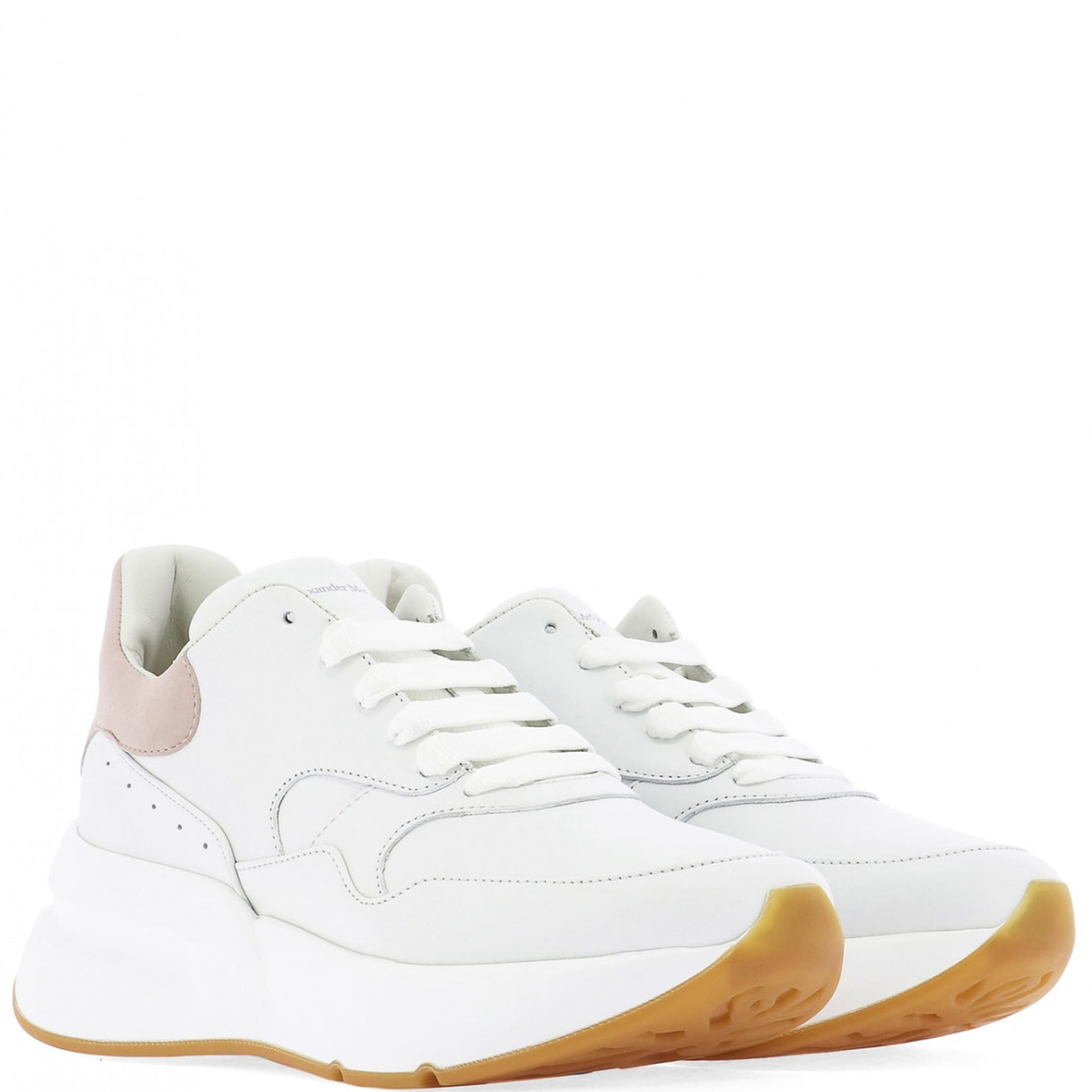 Oversized Runner with a pieced and patched upper silhouette in white calfskin leather. The sneaker features large flat laces, a patchouli padded heel counter and tongue with an Alexander McQueen signature. Oversized runner sole with a leopard stamp design. The sneakers come with an additional set of shoelaces.