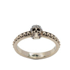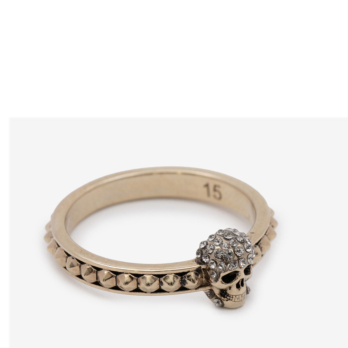 Pale gold-finished skull ring embellished with Swarovski crystals. Brass hardware.