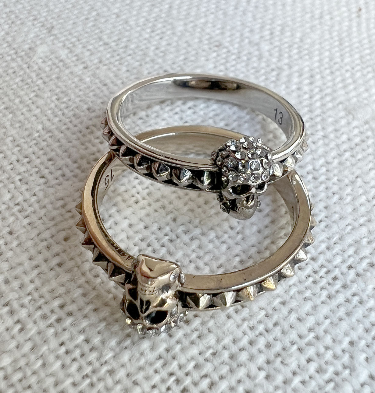 Silver-finished skull ring embellished with Swarovski crystals. Brass hardware.