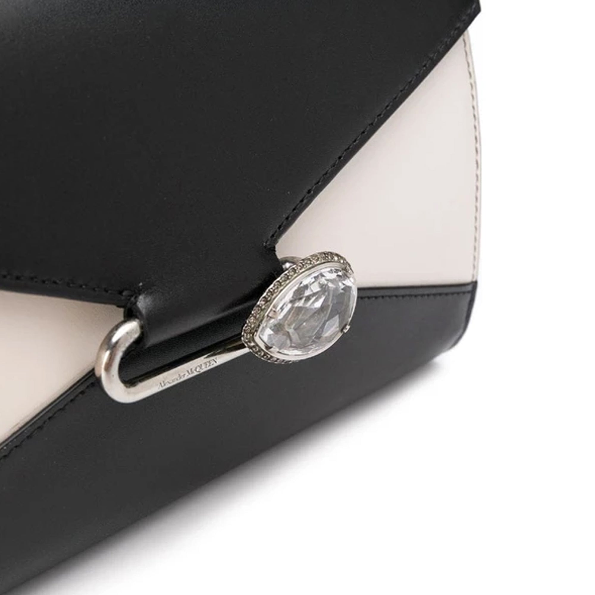 This Pin bag is crafted from smooth black and cream leather with a crystal-embellished pin fastening at the front. Featuring a silver tone chain strap, a front pin fastening, crystal embellishments, an internal zipped pocket and multiple interior card slots.