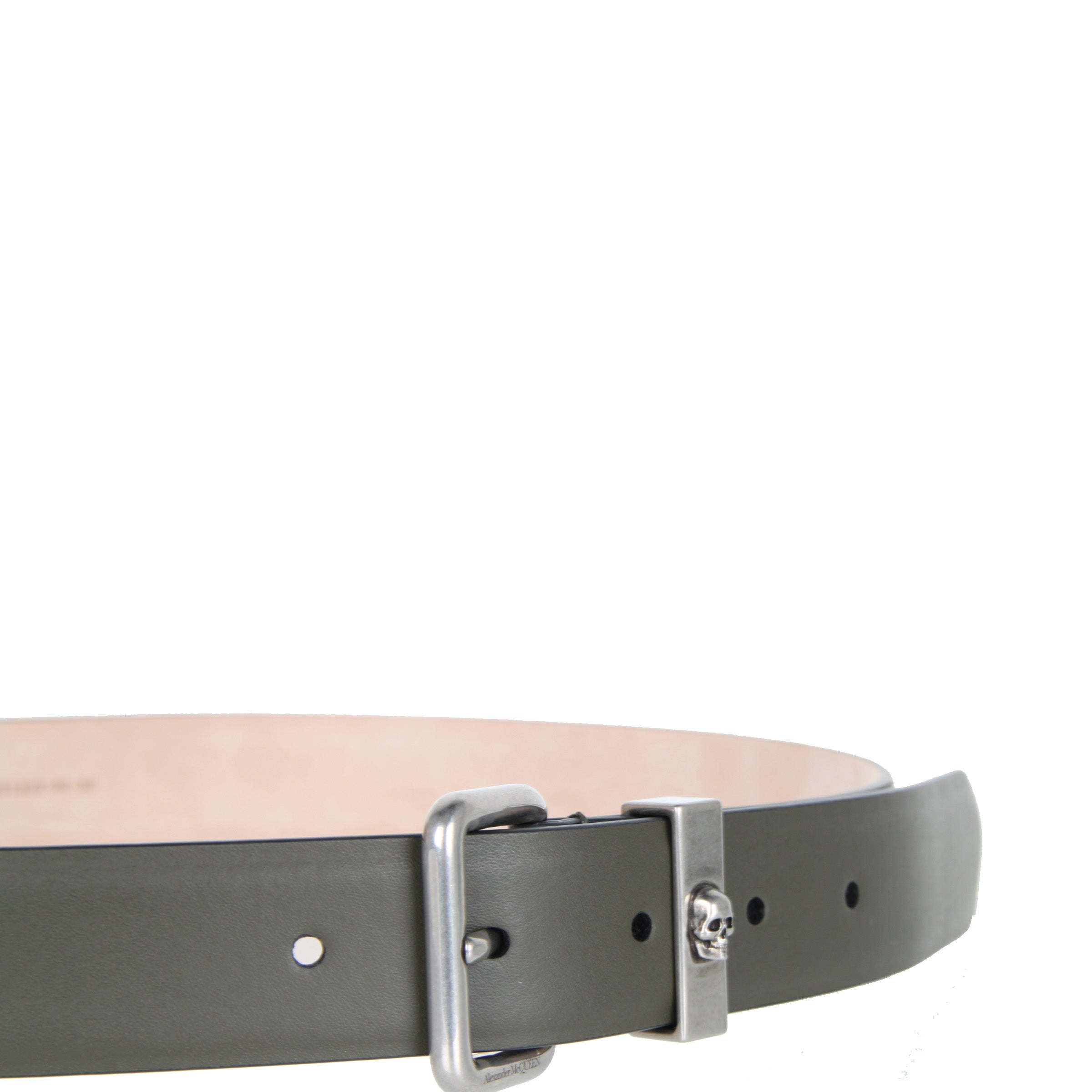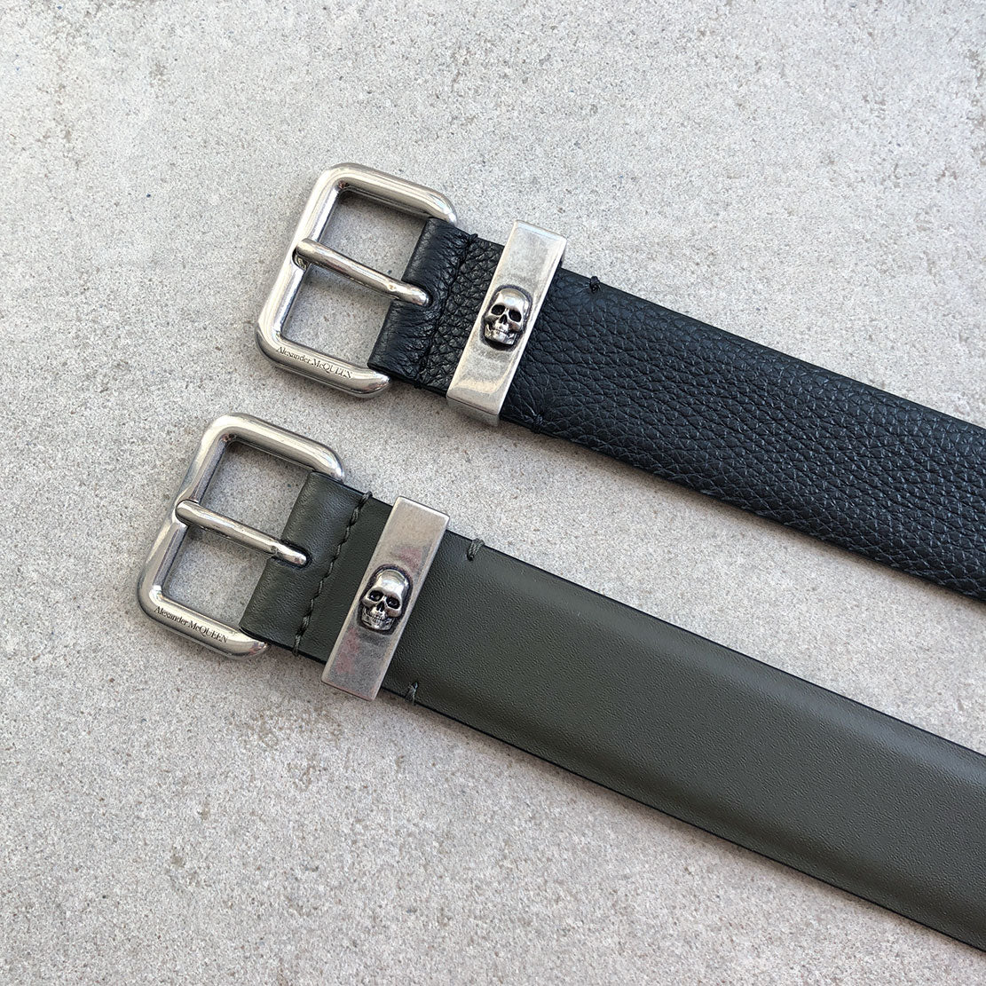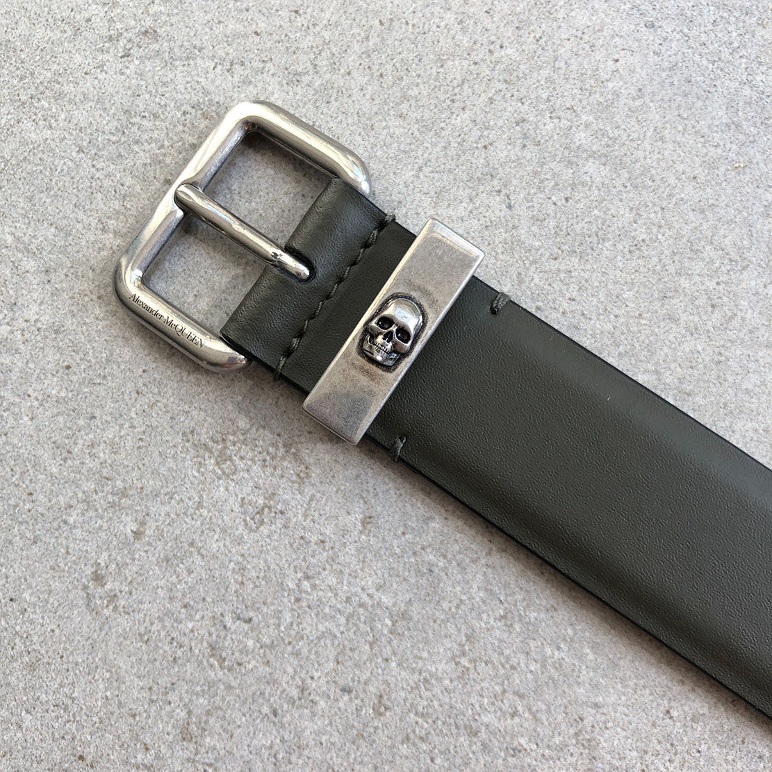Khaki green smooth calf leather belt detailed with a tonal Biker Skull print. Finished with a skull engraved buckle in dark antique silver.