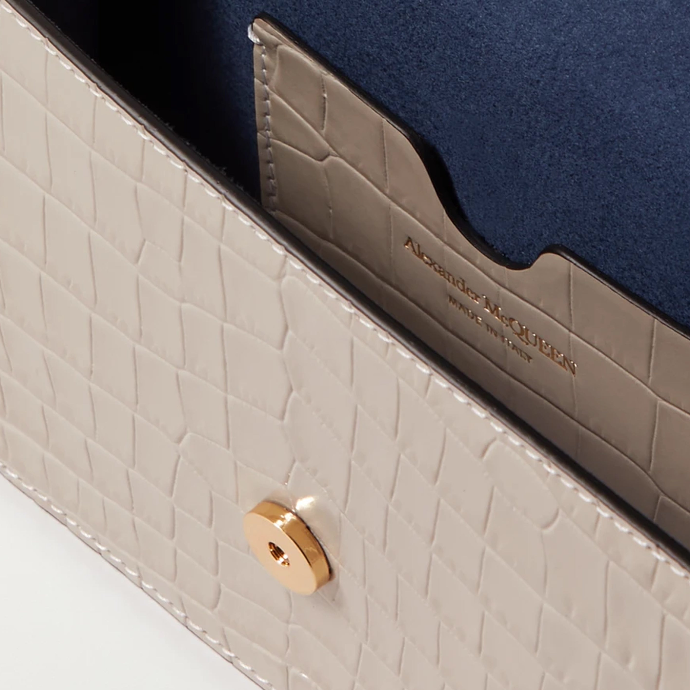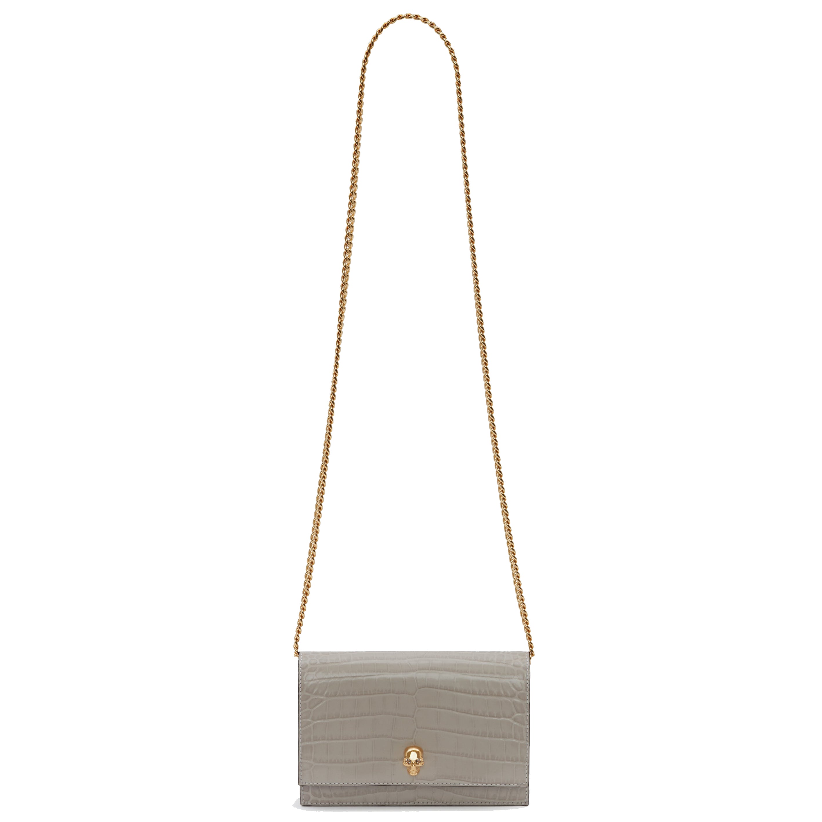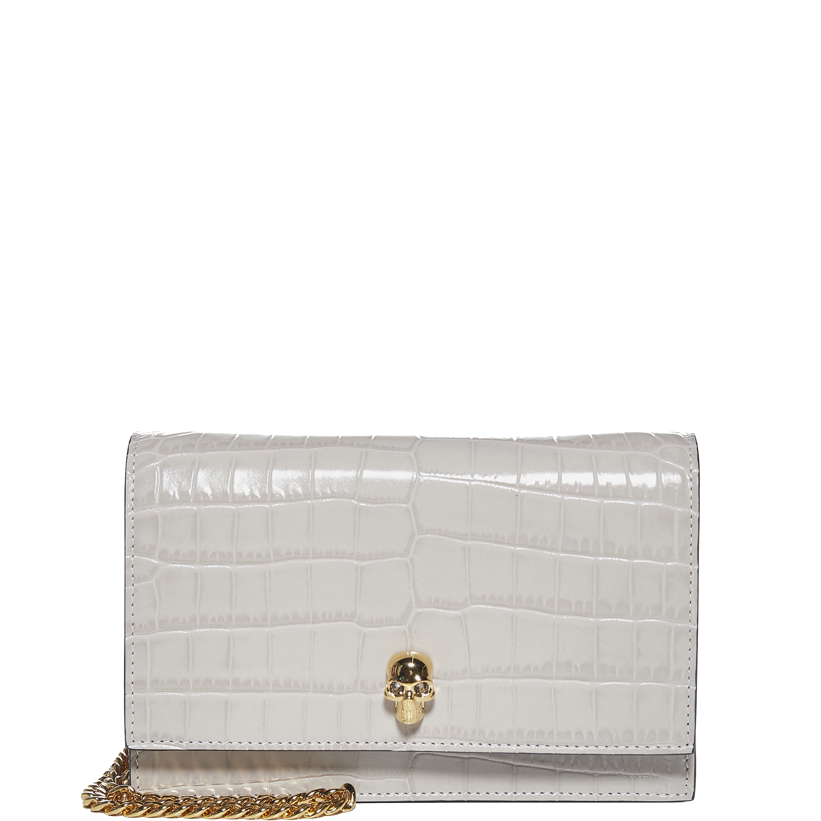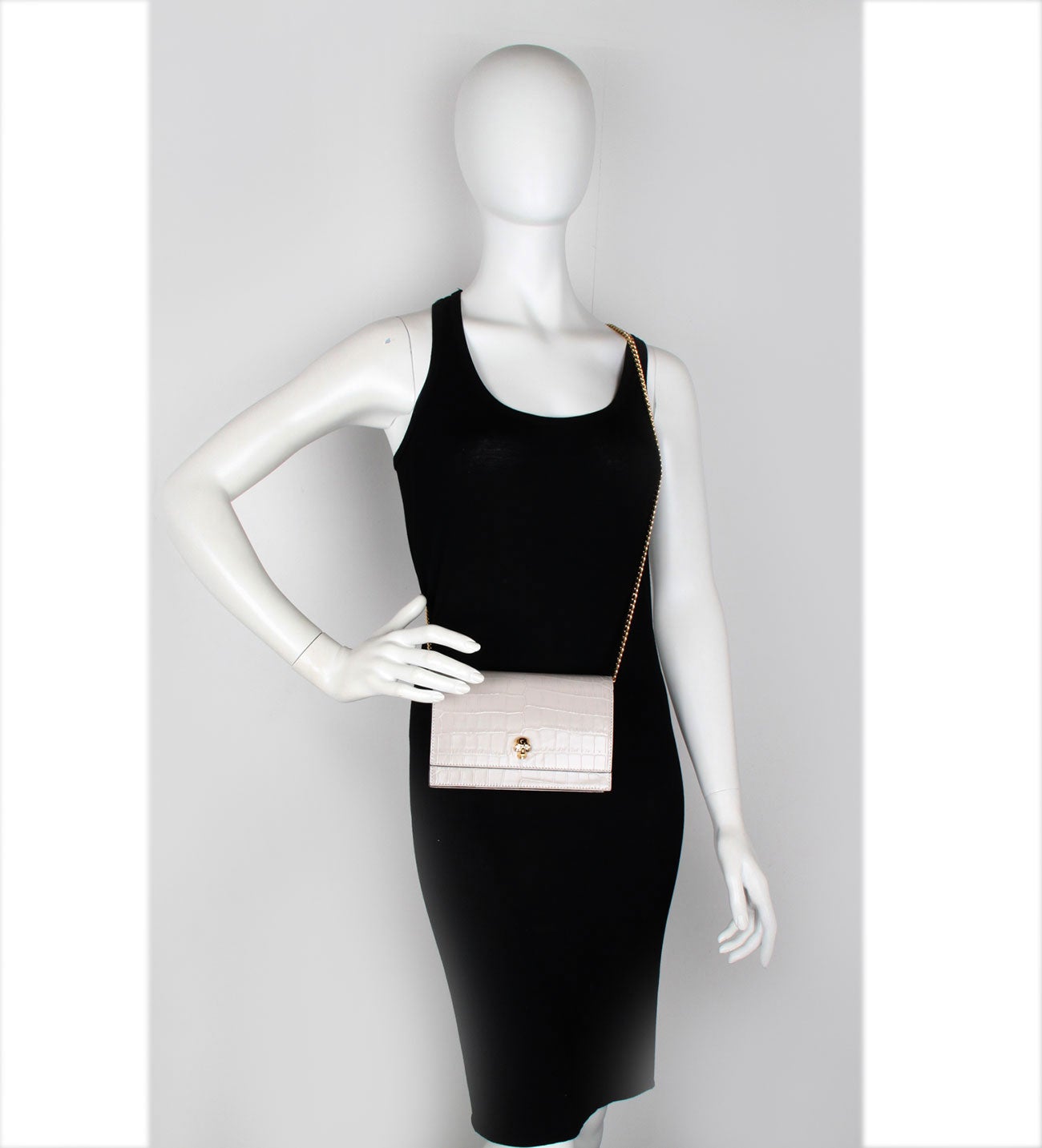 Alexander McQueen black shiny croc-effect leather Mini Skull bag with a gold finished skull and chain strap. This bag features one central compartment, one card pocket and snap button closure. Accomodates smartphones.