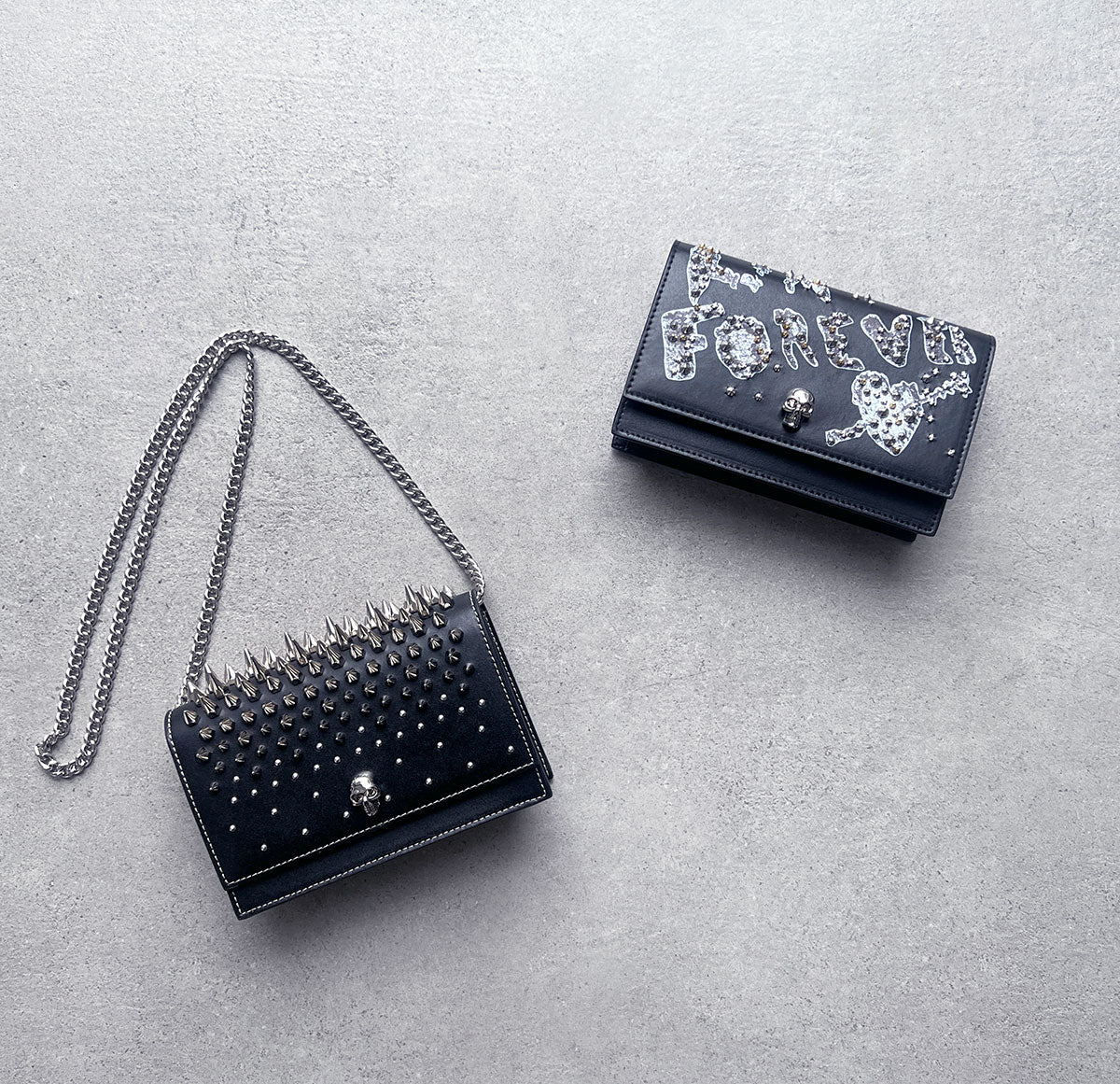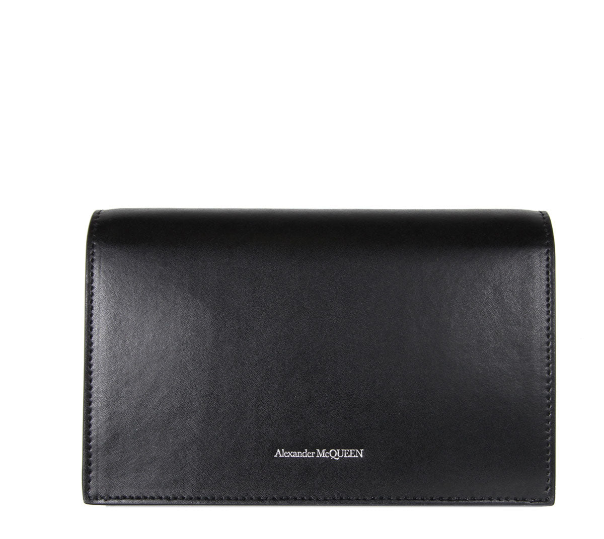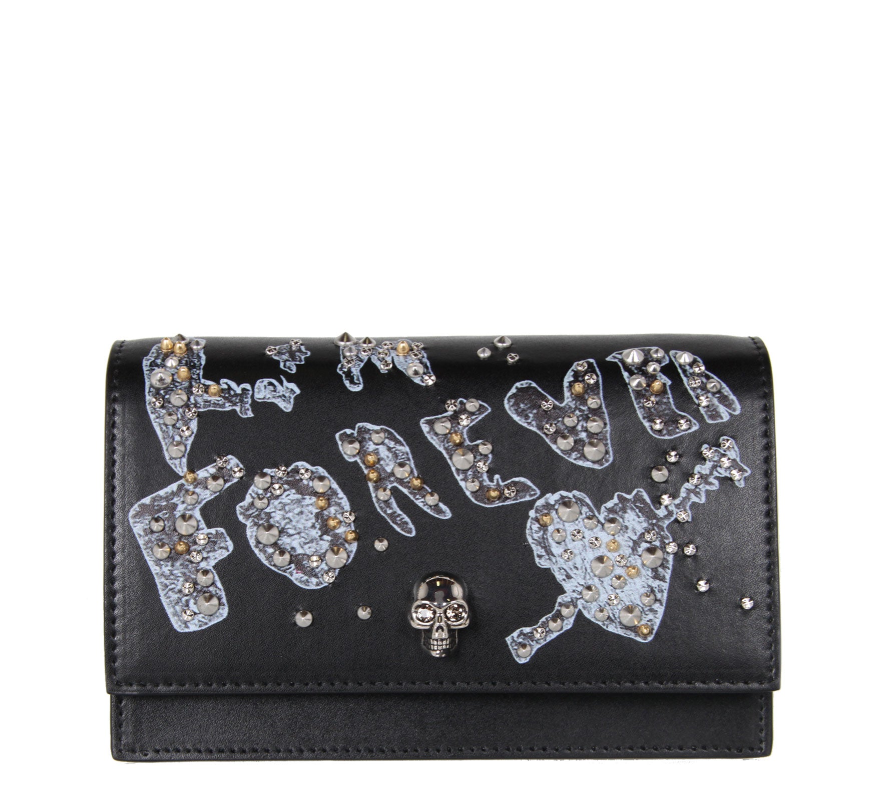 Alexander McQueen lamb leather Mini Skull Bag, detailed with a silver-finished skull and crystal forever AMQ embellishments. Features a snap button fastening, one central compartment and one card pocket. Silver finished chain strap. Accommodates smartphones