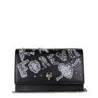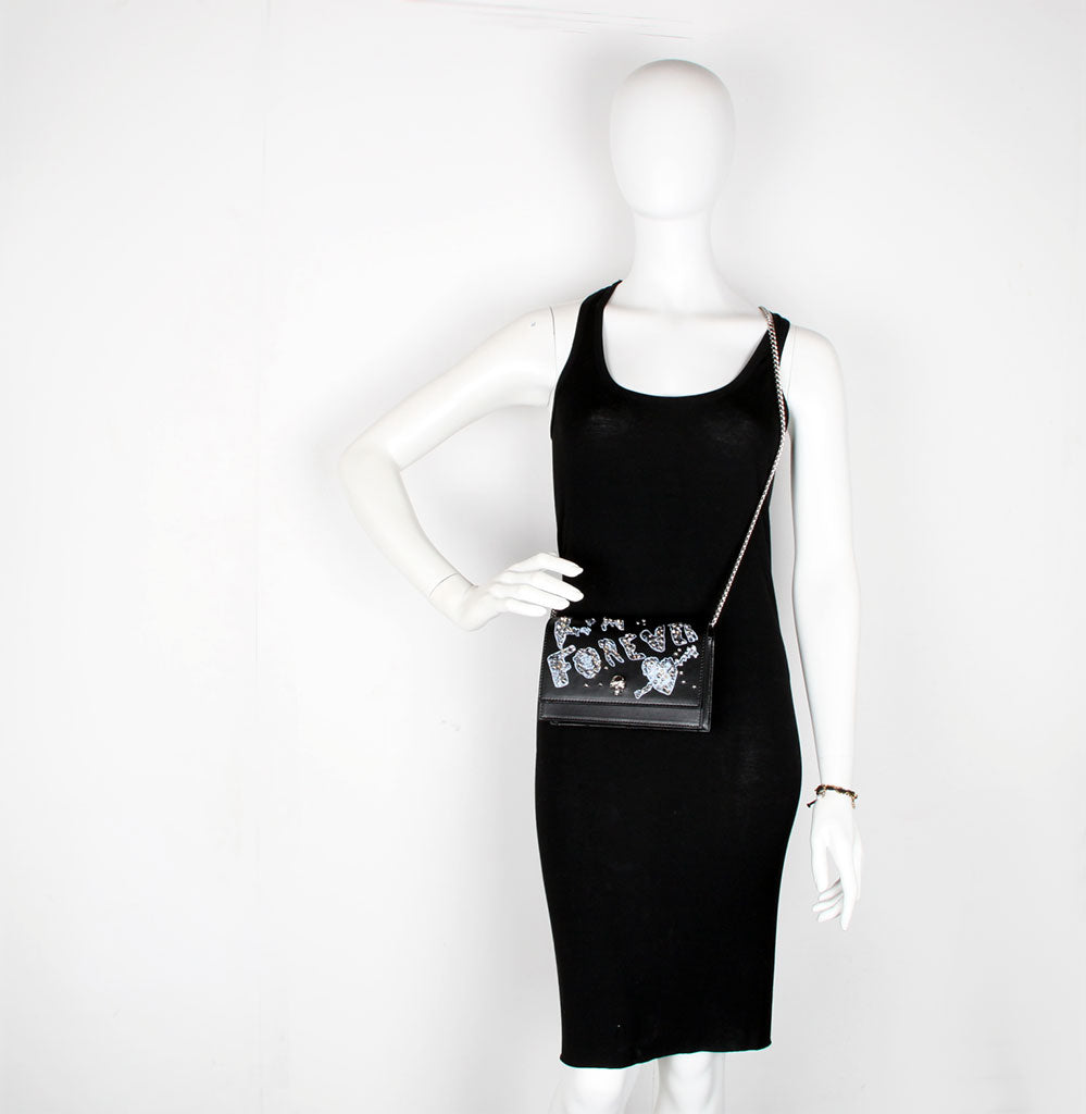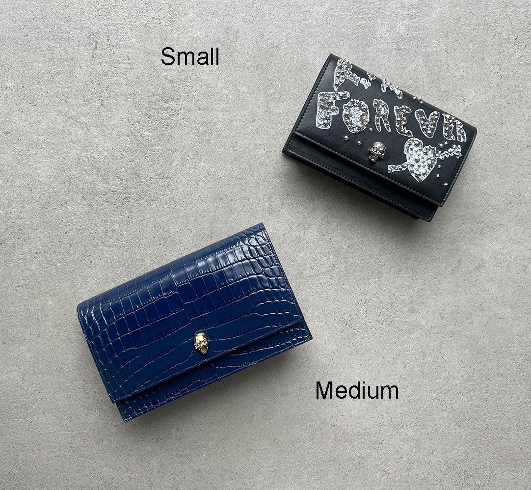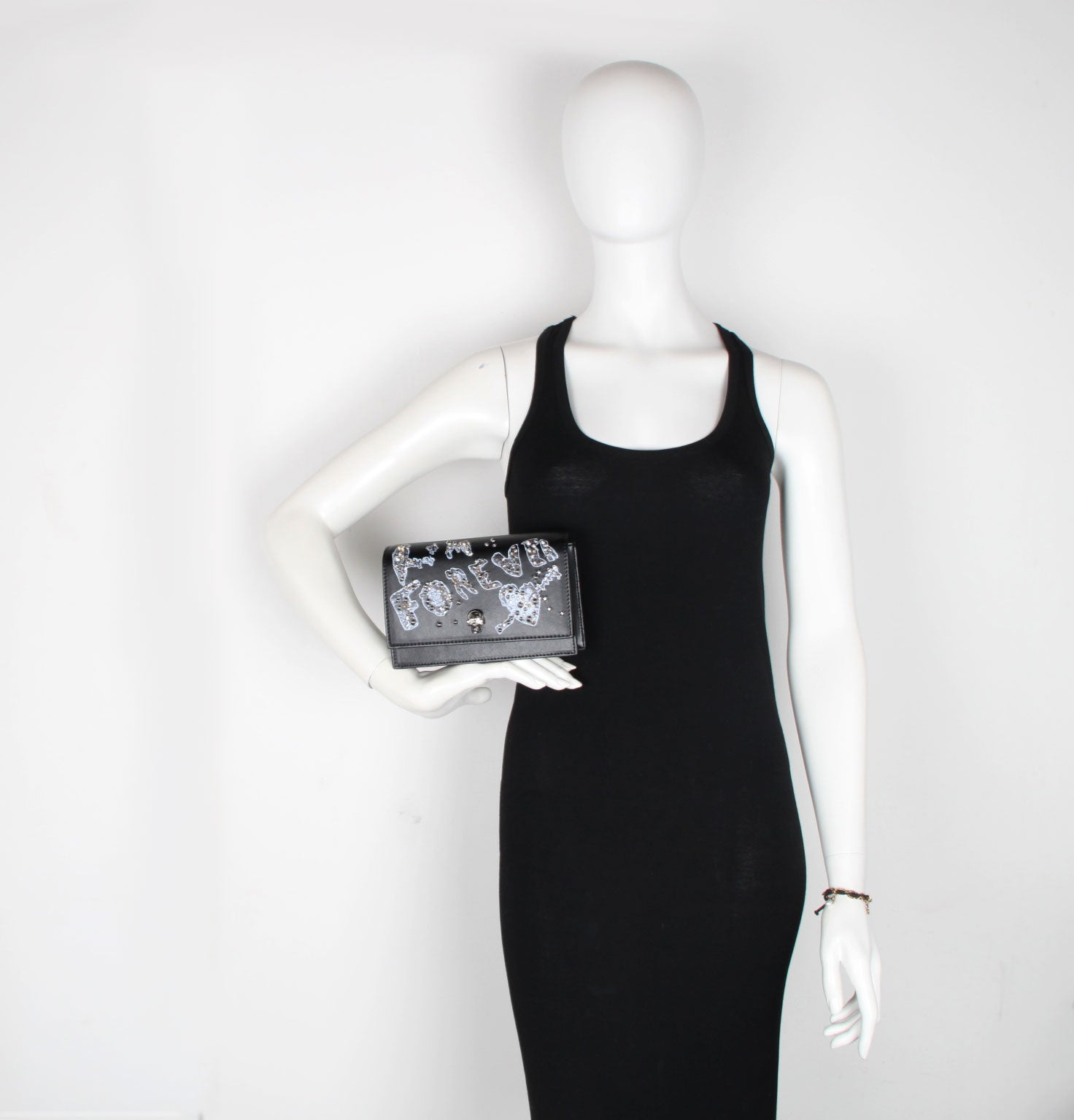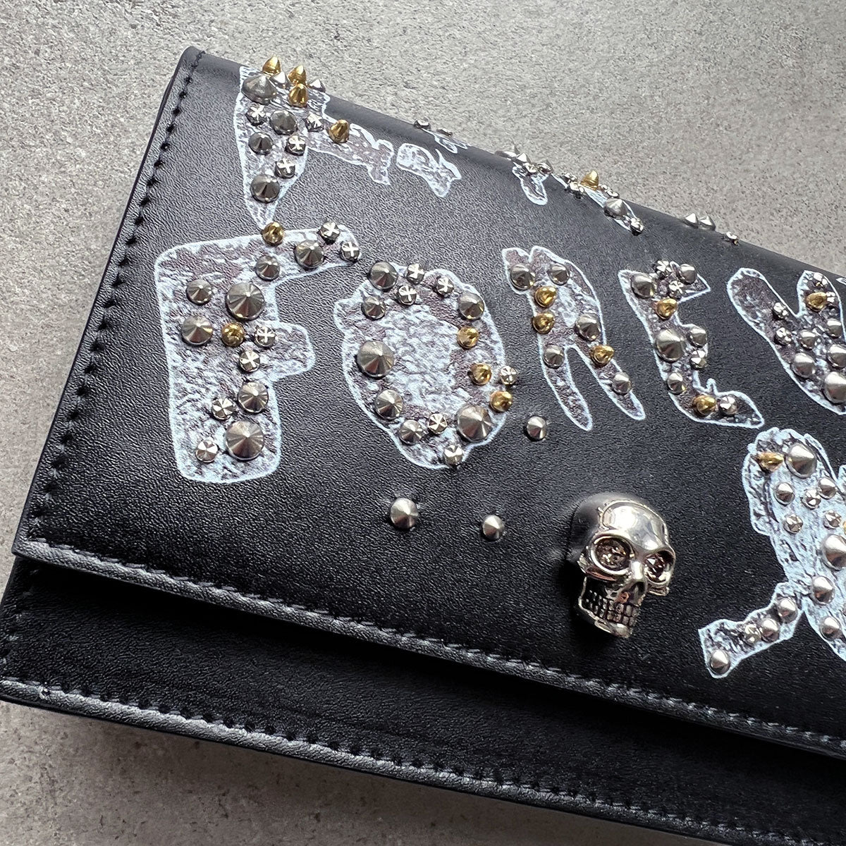 Alexander McQueen lamb leather Mini Skull Bag, detailed with a silver-finished skull and crystal forever AMQ embellishments. Features a snap button fastening, one central compartment and one card pocket. Silver finished chain strap. Accommodates smartphones