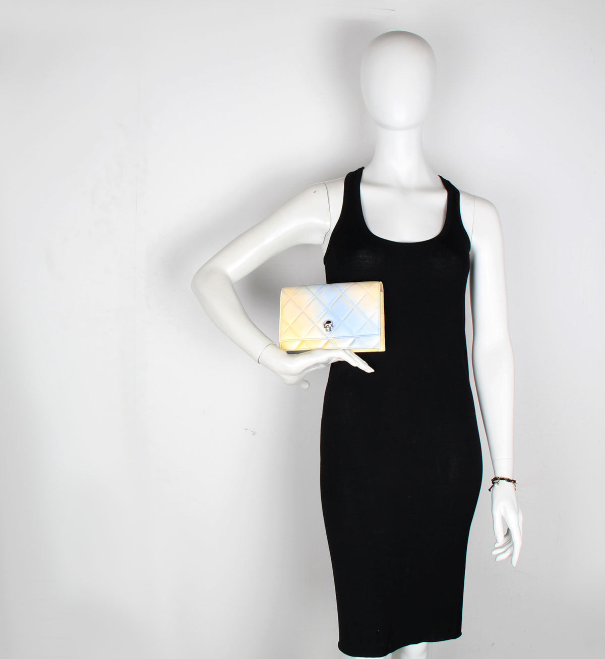 Alexander McQueen tie dye calf leather Mini Skull Bag, detailed with a silver-finished skull. Features a snap button fastening, one central compartment and one card pocket. Silver finished chain strap. Accommodates smartphones