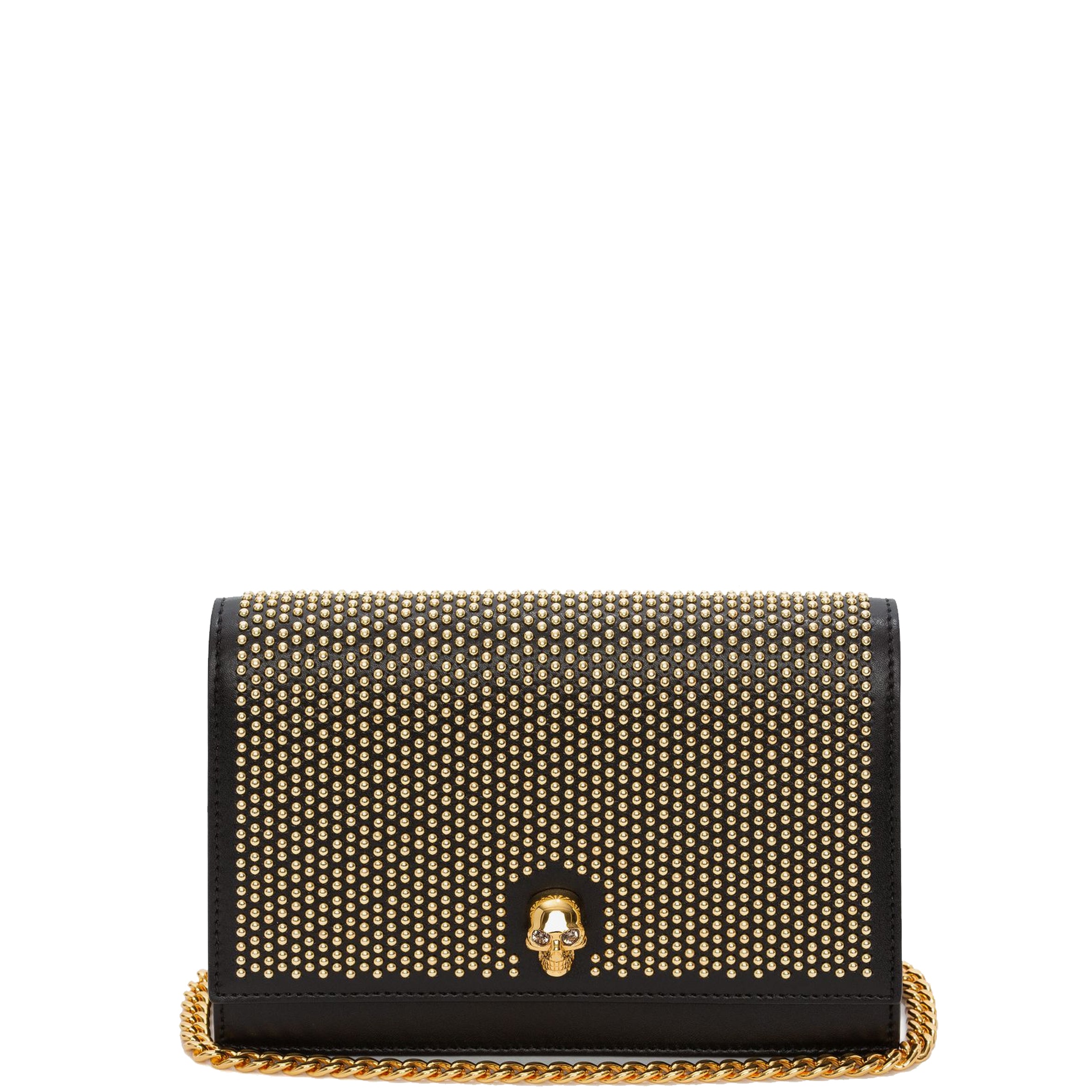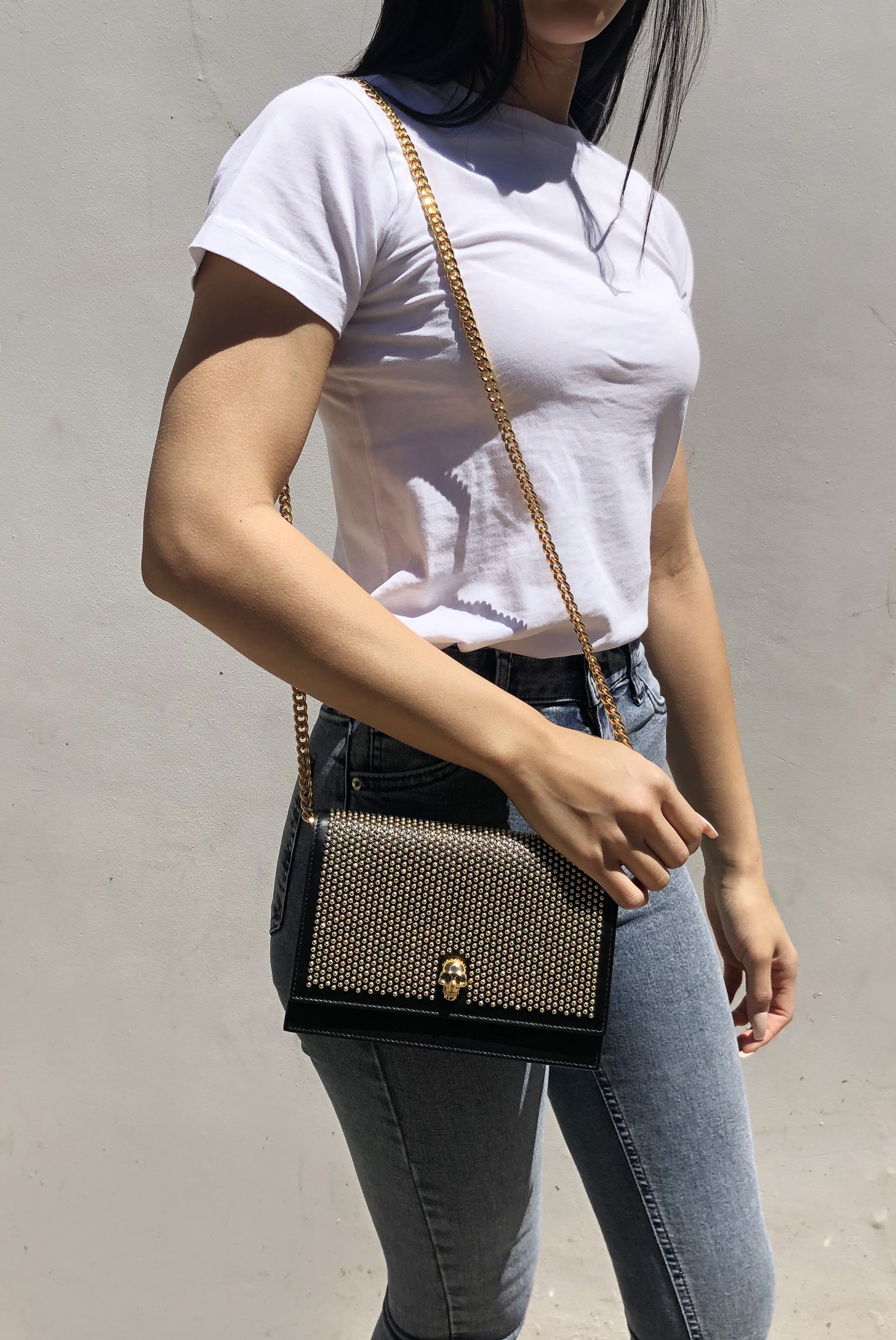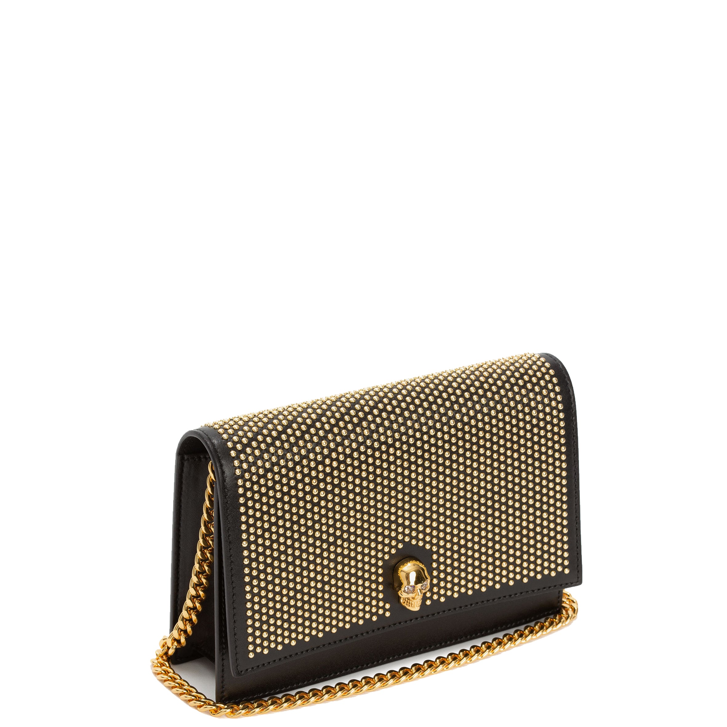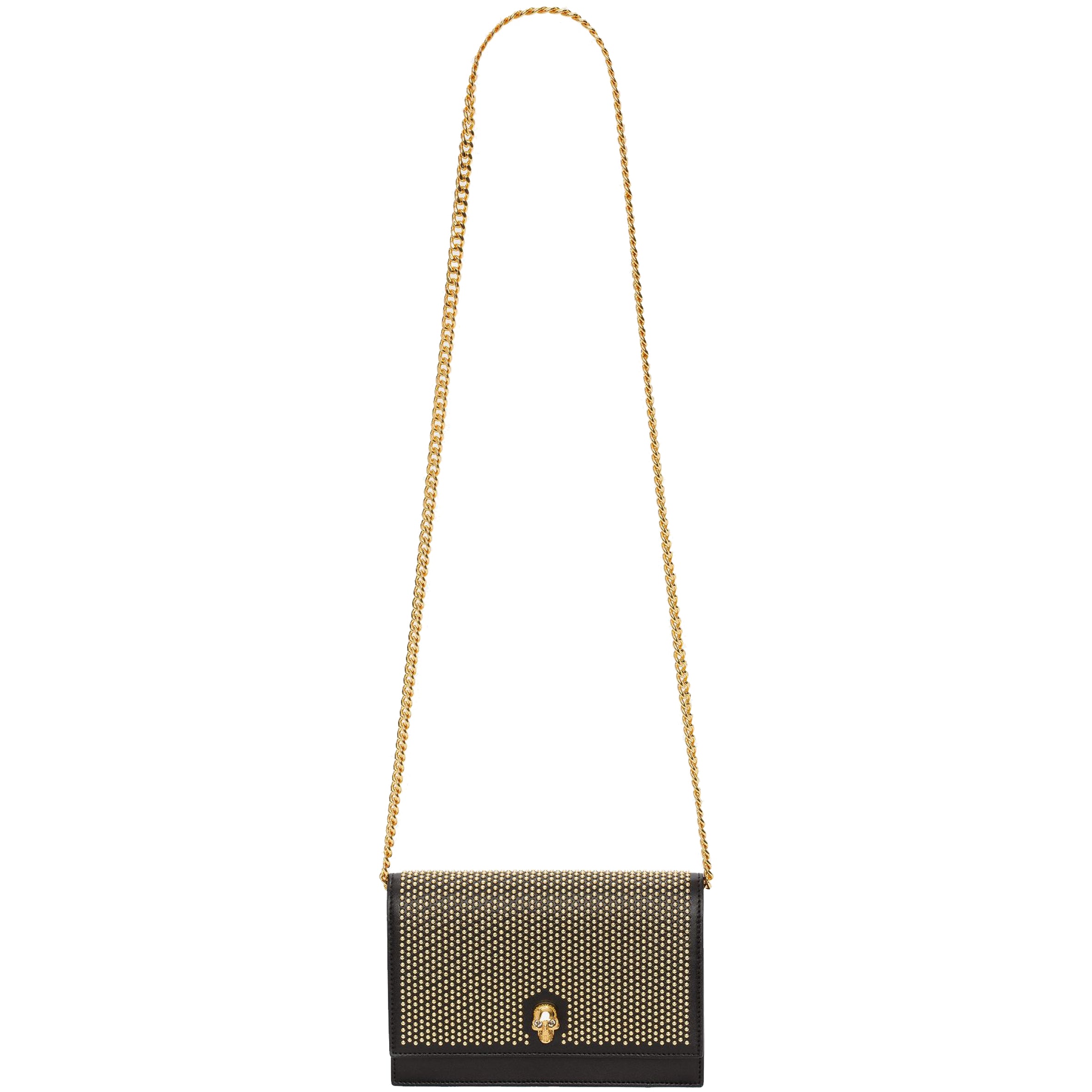 Alexander McQueen black calfskin Mini Skull bag comes embellished with a skull detail and mini gold studs. This bag features one central compartment, one card pocket and snap button closure. Accomodates smartphones.