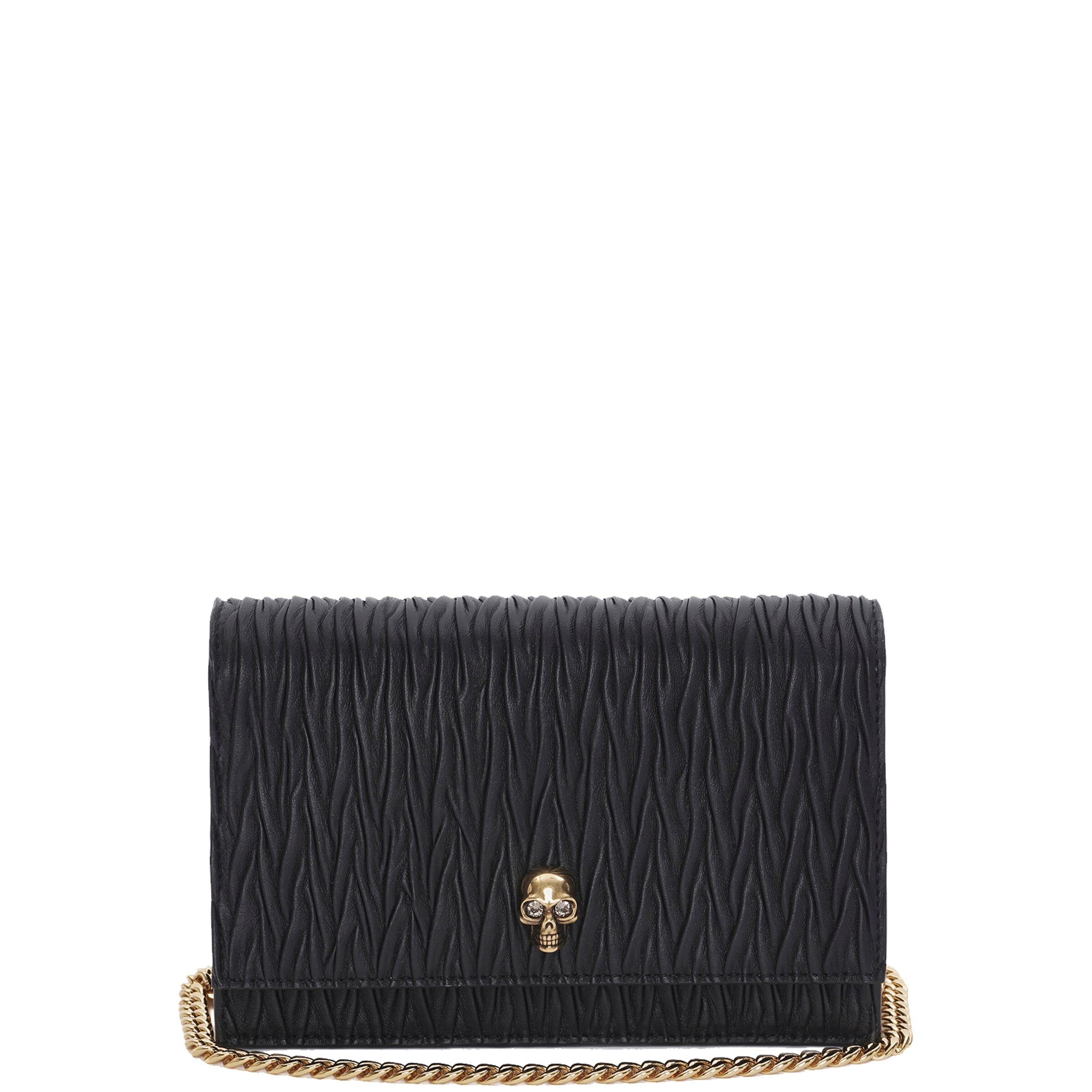 Alexander McQueen Small pleated nappa leather Bag with a Suede-effect lining detailed with a gold-finished skull and chain strap. Features a magnetic closure, one central compartment as well as one card pocket. Accommodates smartphones.