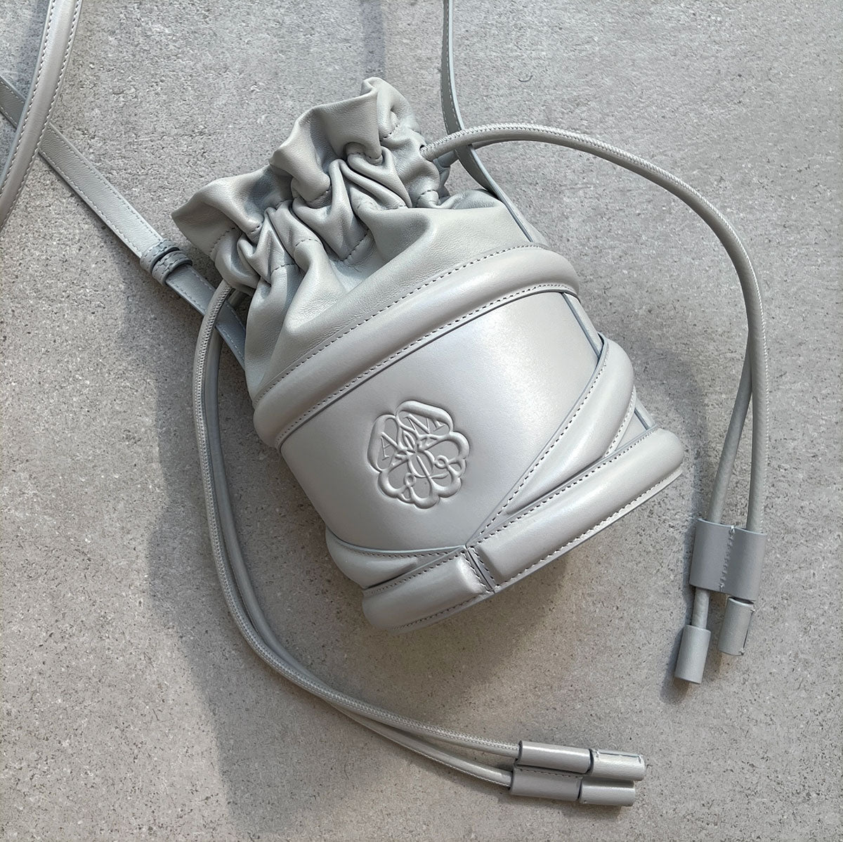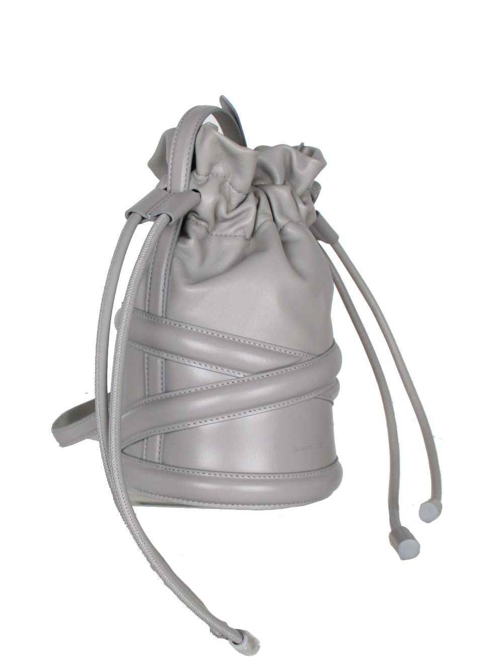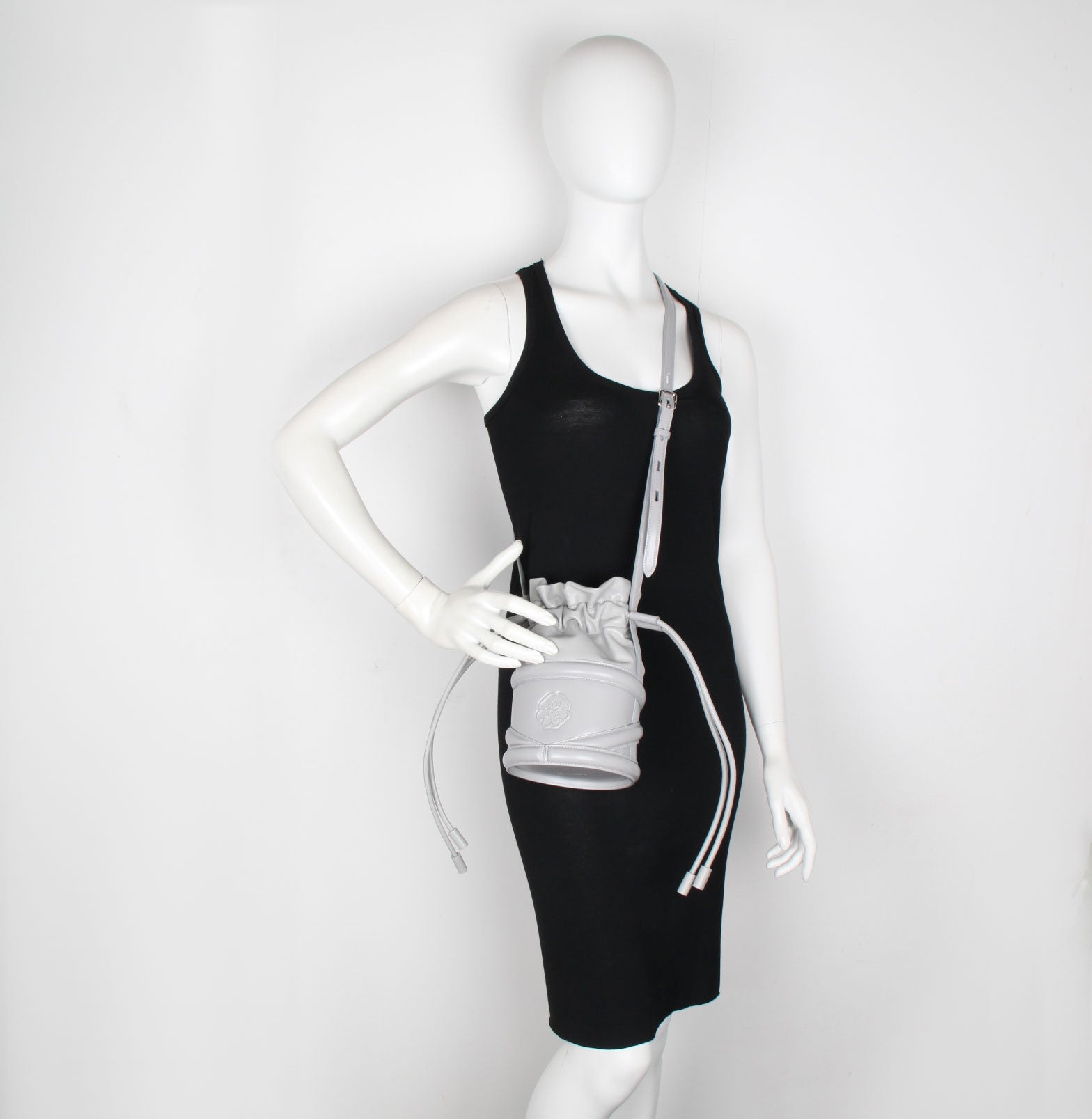 The Soft Curve in pale grey calf leather inspired by the harness silhouette and finished with a lambskin drawstring closure and high frequency debossed Seal Signature. This bag can we worn across the body by using the leather strap or over the shoulder with the strap through the leather loop folded back. It has one main compartment with one leather card compartment. Can accommodate a smartphone