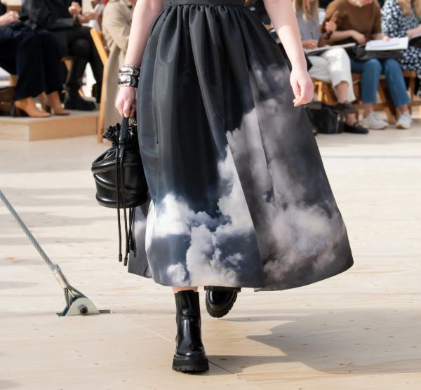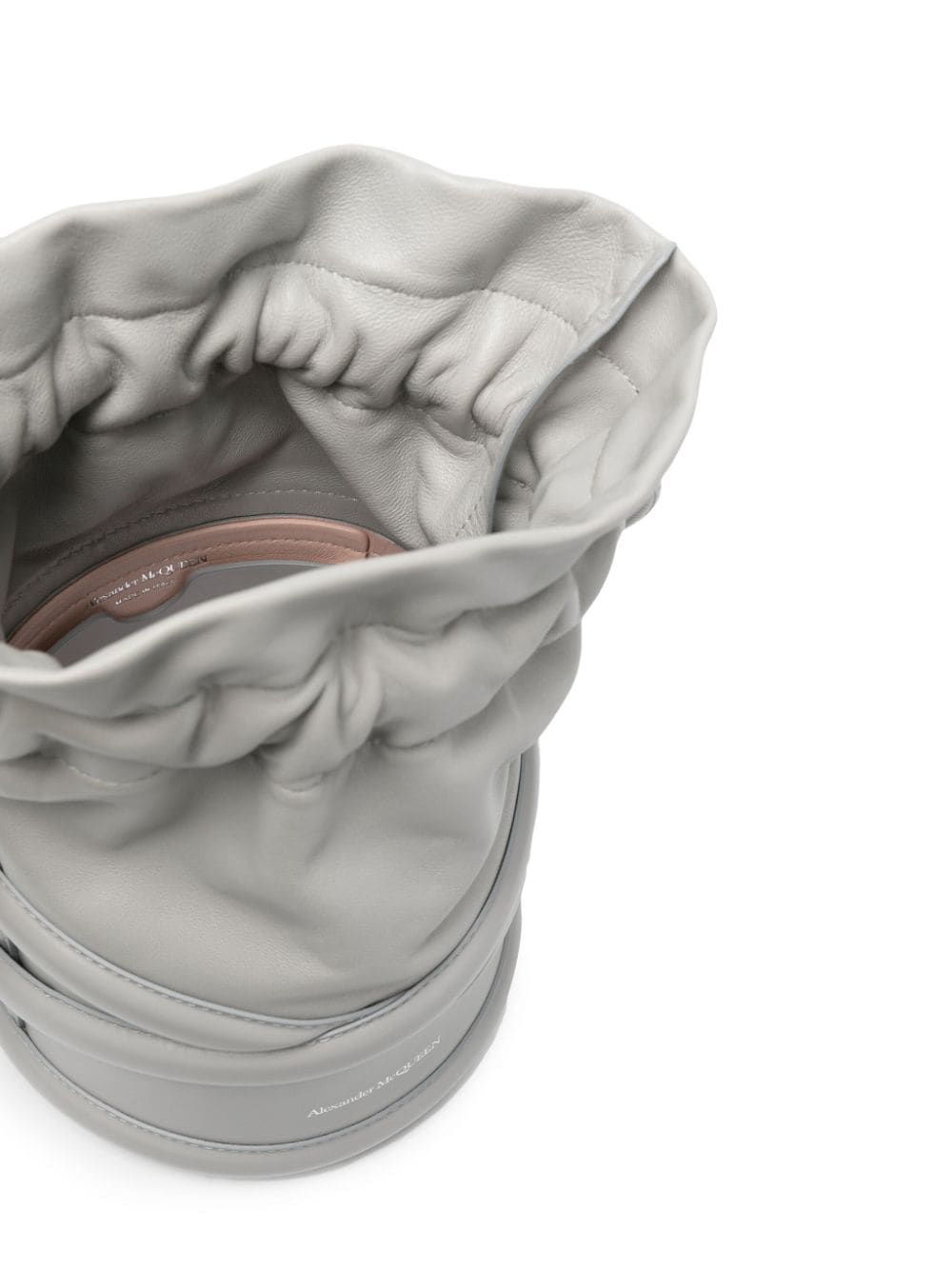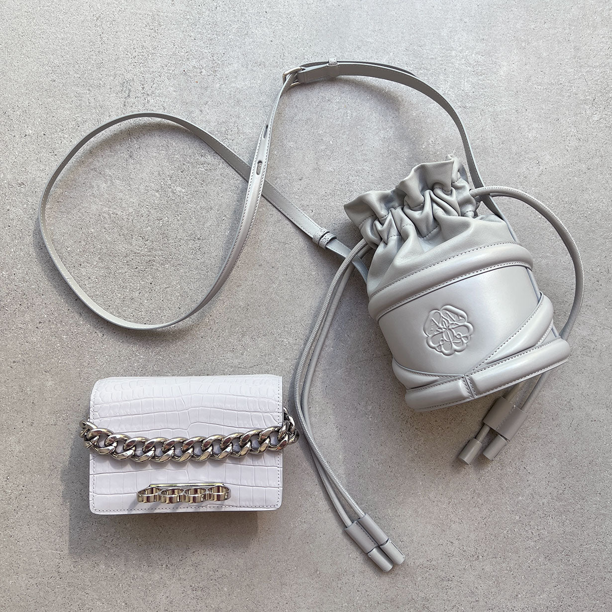 The Soft Curve in pale grey calf leather inspired by the harness silhouette and finished with a lambskin drawstring closure and high frequency debossed Seal Signature. This bag can we worn across the body by using the leather strap or over the shoulder with the strap through the leather loop folded back. It has one main compartment with one leather card compartment. Can accommodate a smartphone