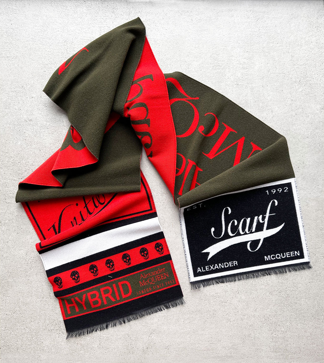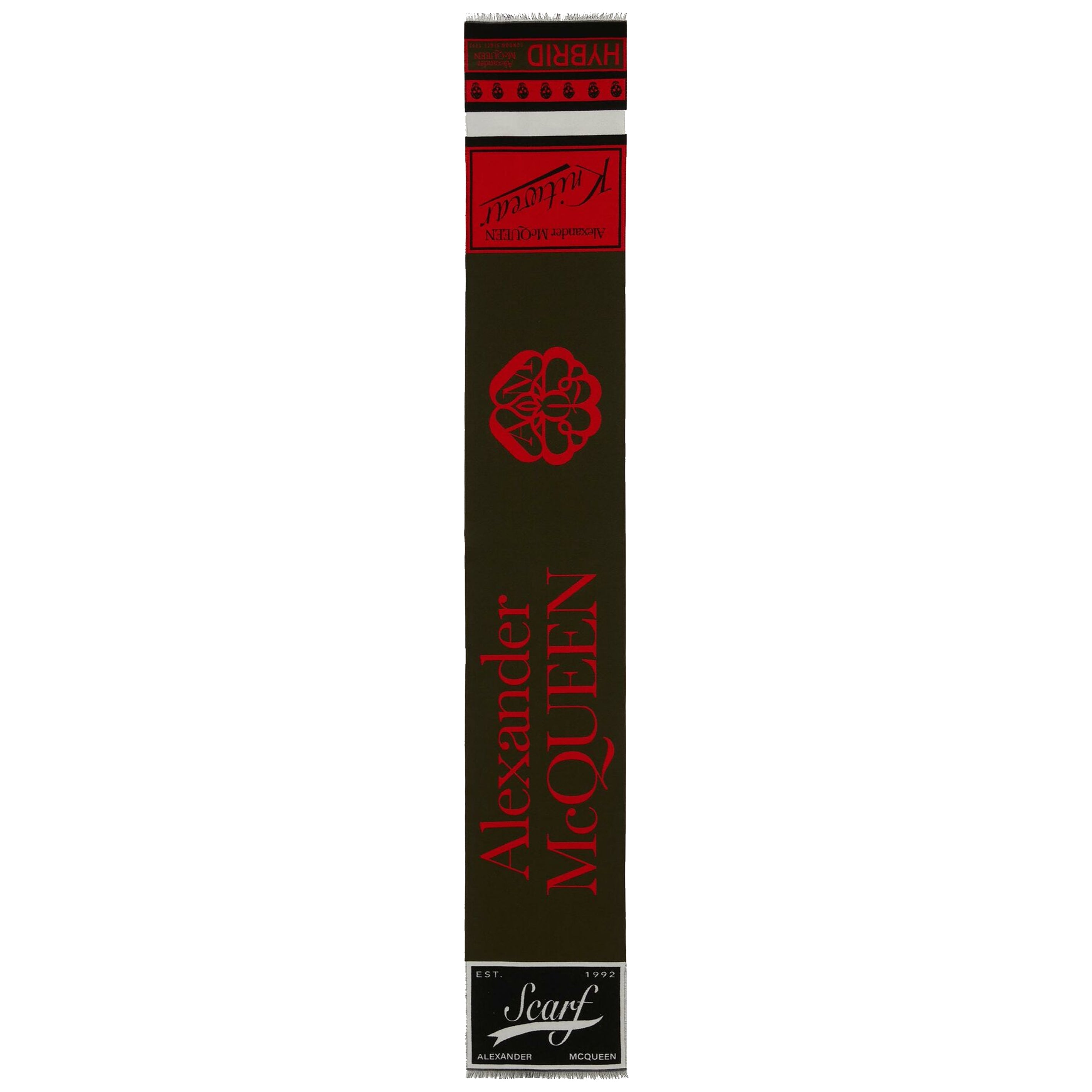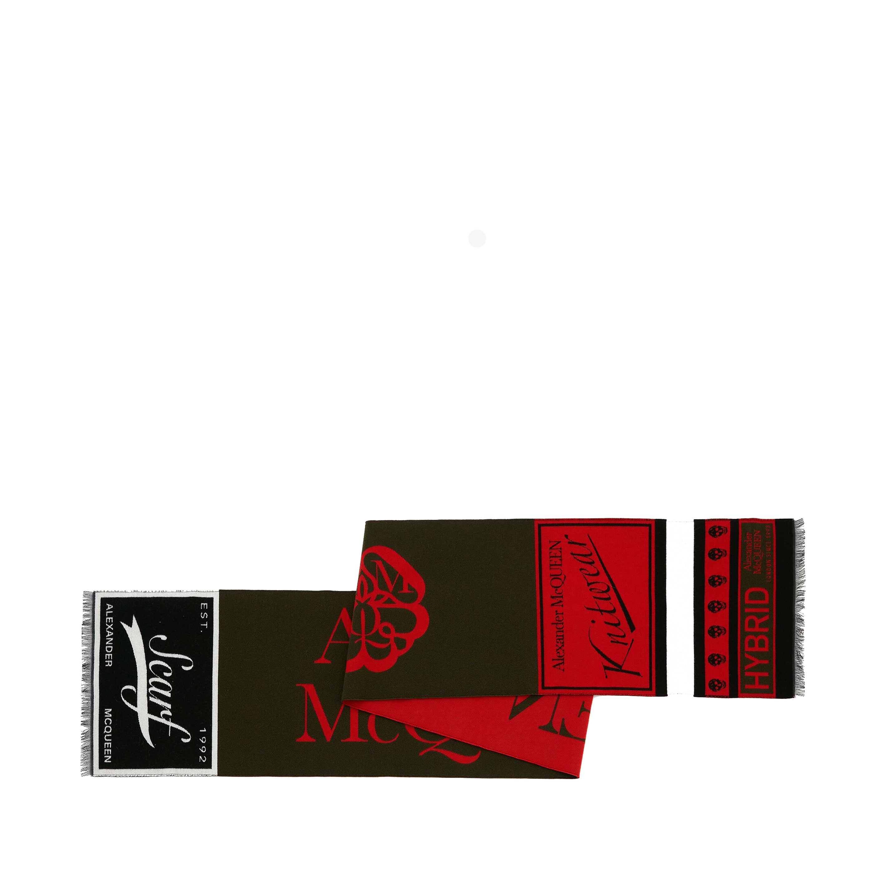 Military green and orange wool jacquard graphic sport scarf with Alexander McQueen signatures and motifs. Finished with frayed edges.