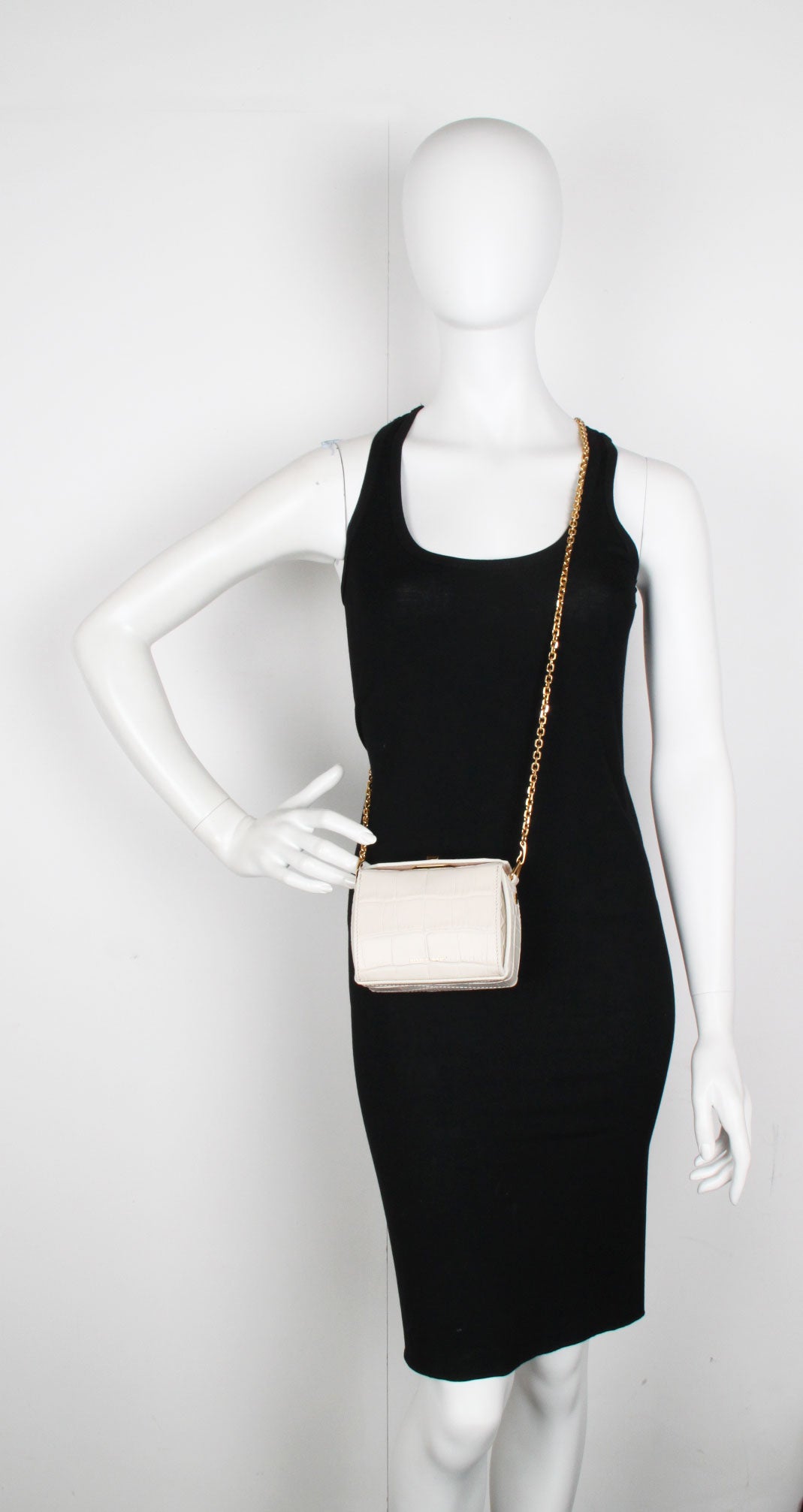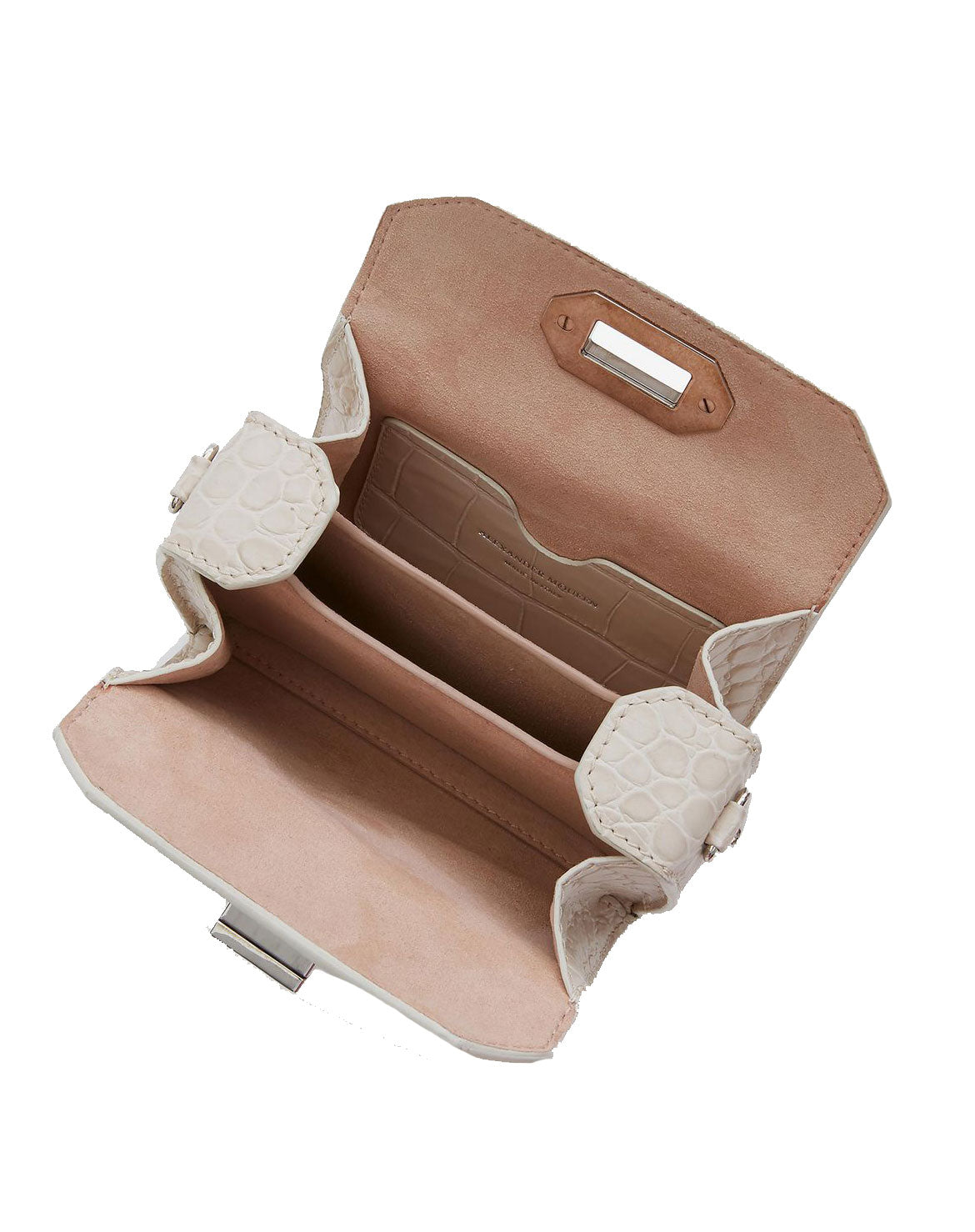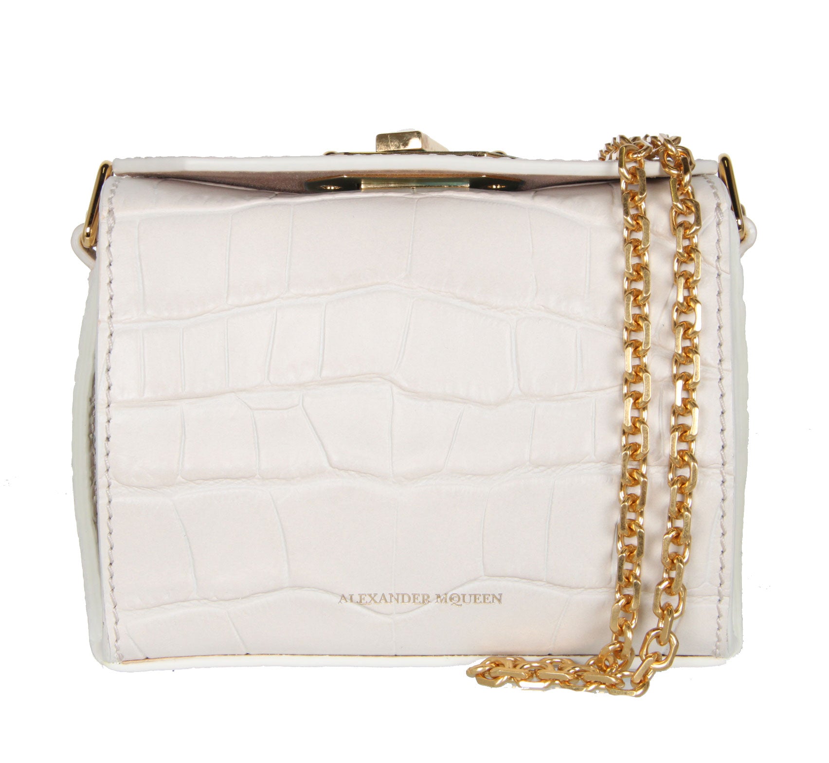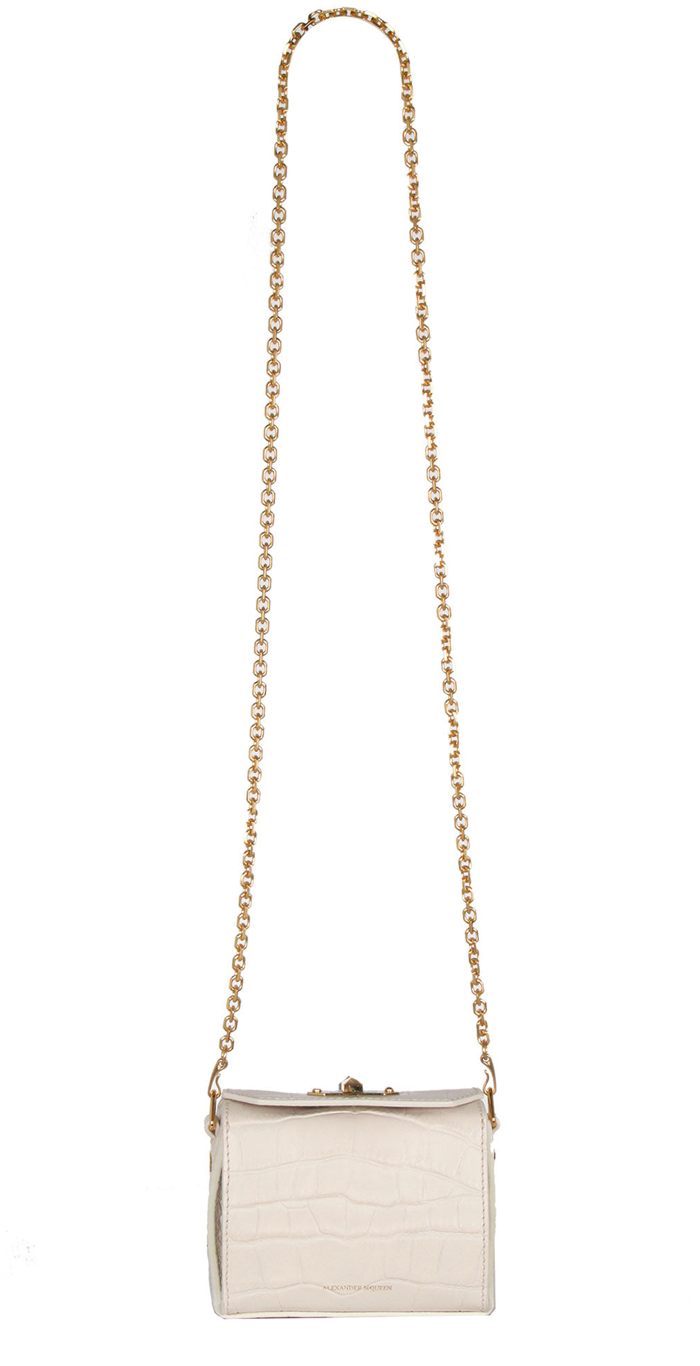 Croc-effect calf leather Nano Box Bag. The bag features a diamond-faceted rotating clasp fastening with two decorative studs, designed exclusively for Alexander McQueen.