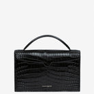 Shiny black embossed croc calfskin leather Skull Bag detailed with a gold-finished skull and a leather top handle. The bag can be worn either hand-held with its removable chain strap or over the shoulder by doubling up the chain or cross the body. This bag features one central compartment, one card pocket and snap button closure. Accomodates smartphones.