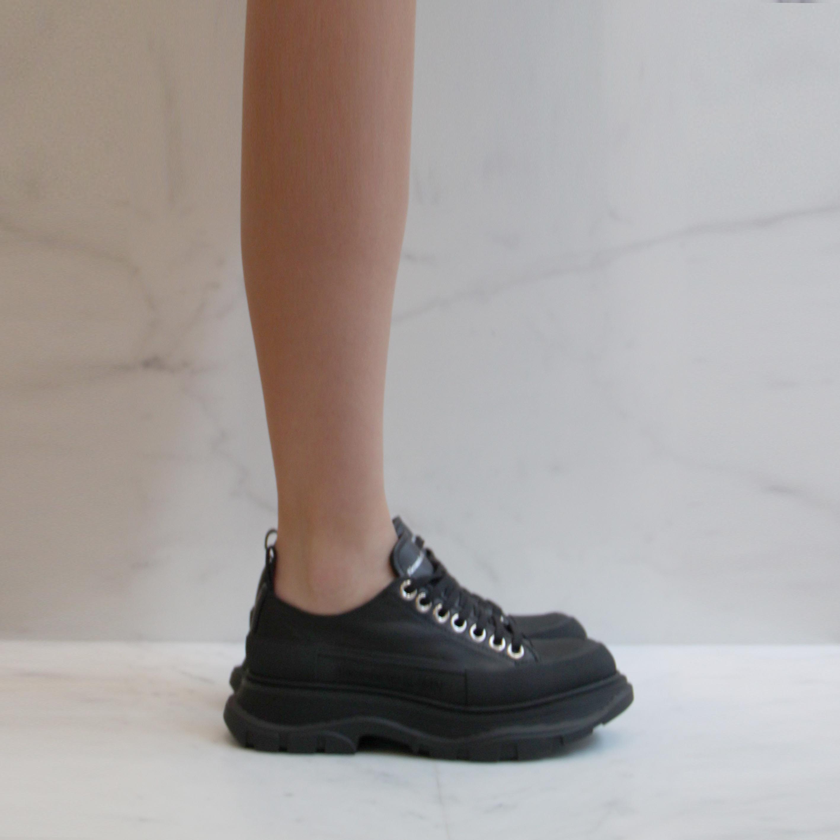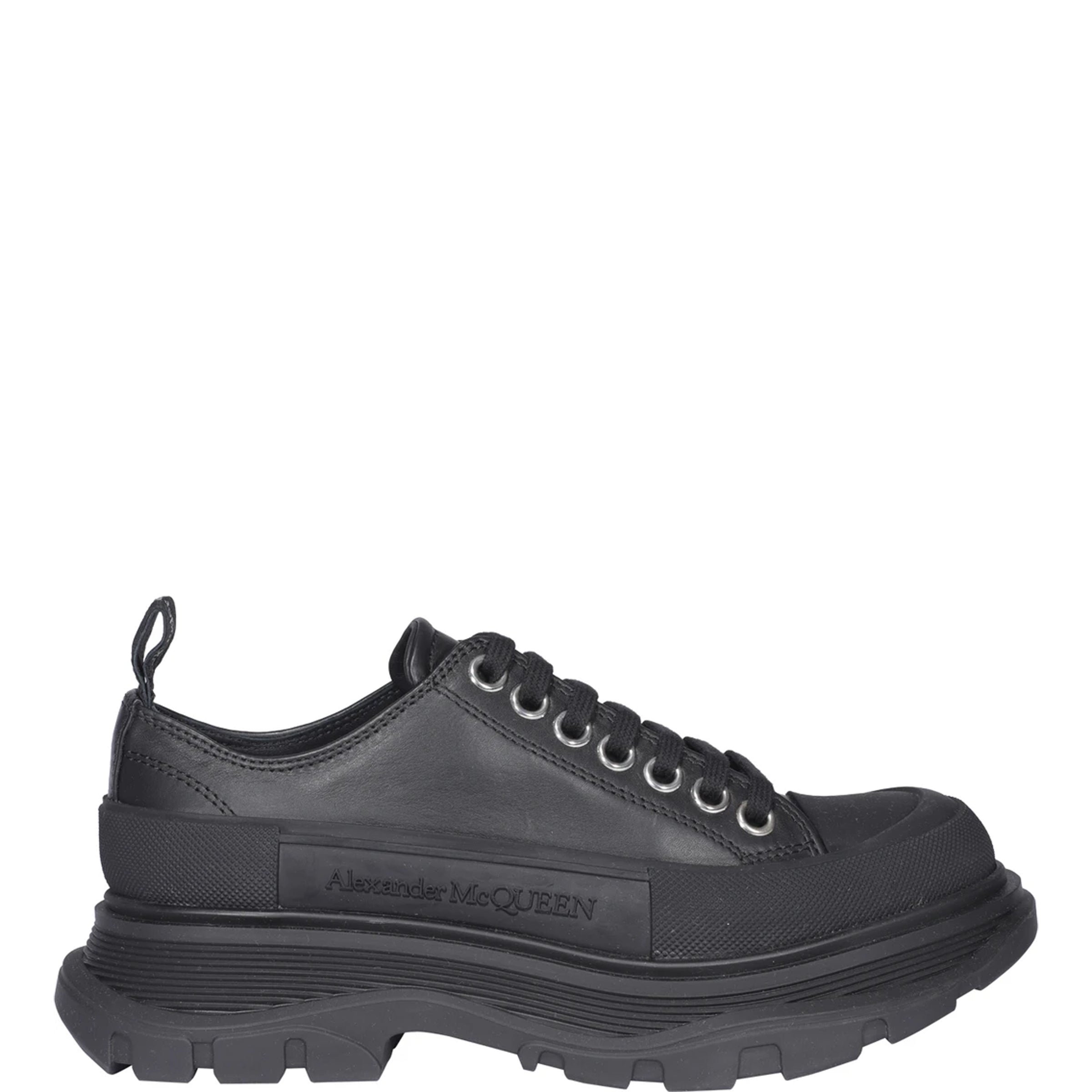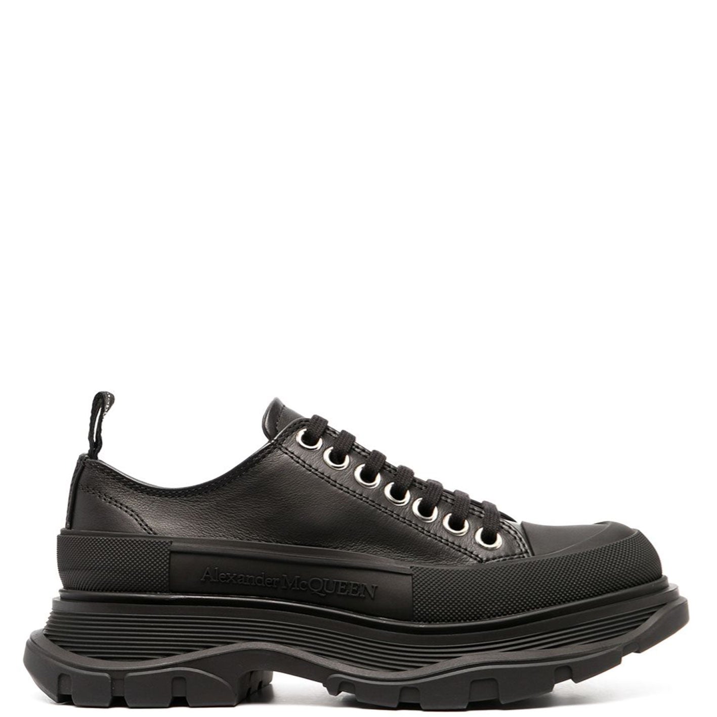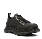 The Tread Slick ankle boots hail from Alexander McQueen's Hybrid collection. A series of mix-and-match influences that combine to create fresh new silhouettes. They're made from black leather with eyelet lace-ups and are set on oversized rubber tread soles for which they're named. Branding along the heel and stamping along the side.
