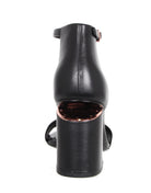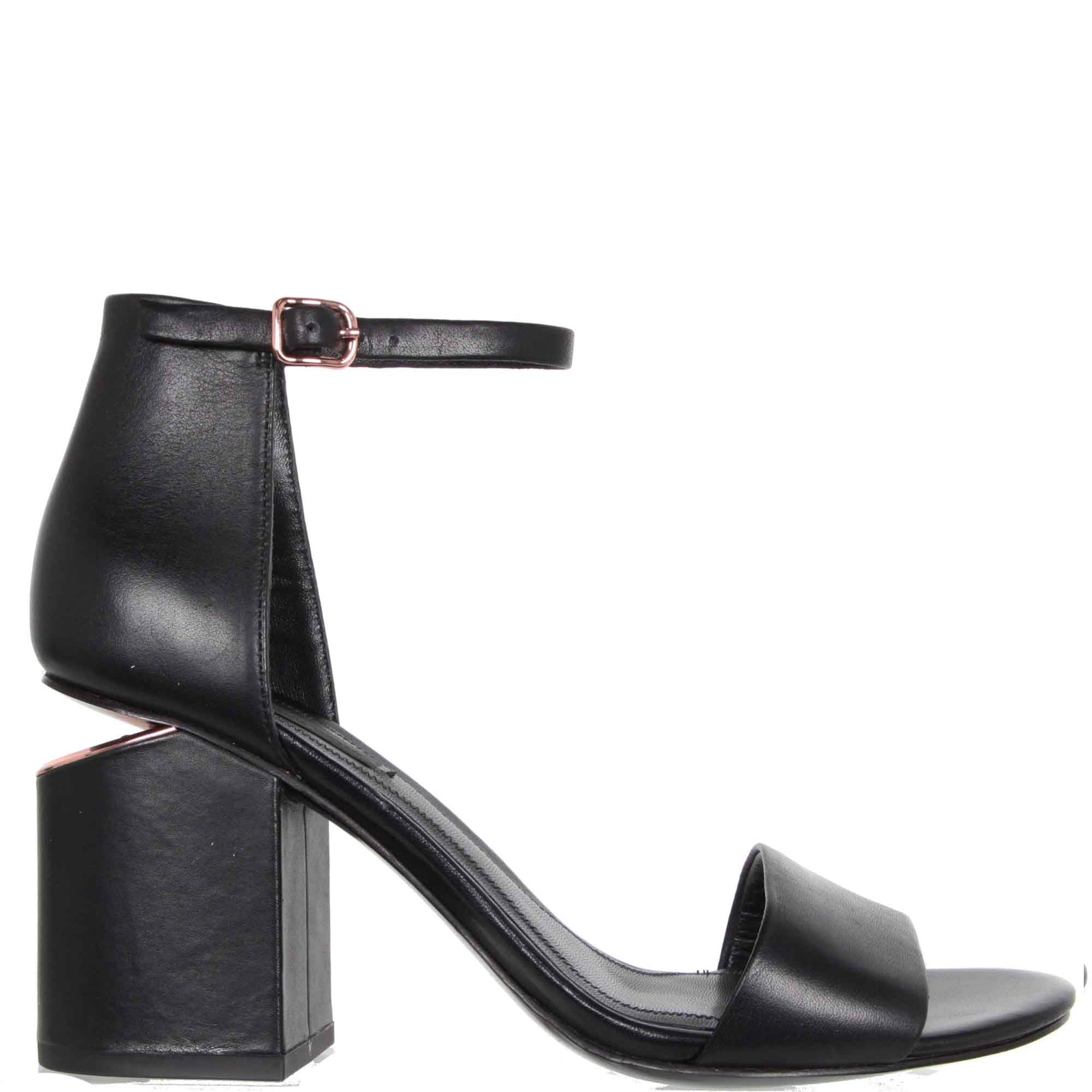 Mid heel sandal with signature cut out heel and Rose Gold metal plate. Ankle strap detail with buckle closure. Leather wrapped heel and leather outsole.